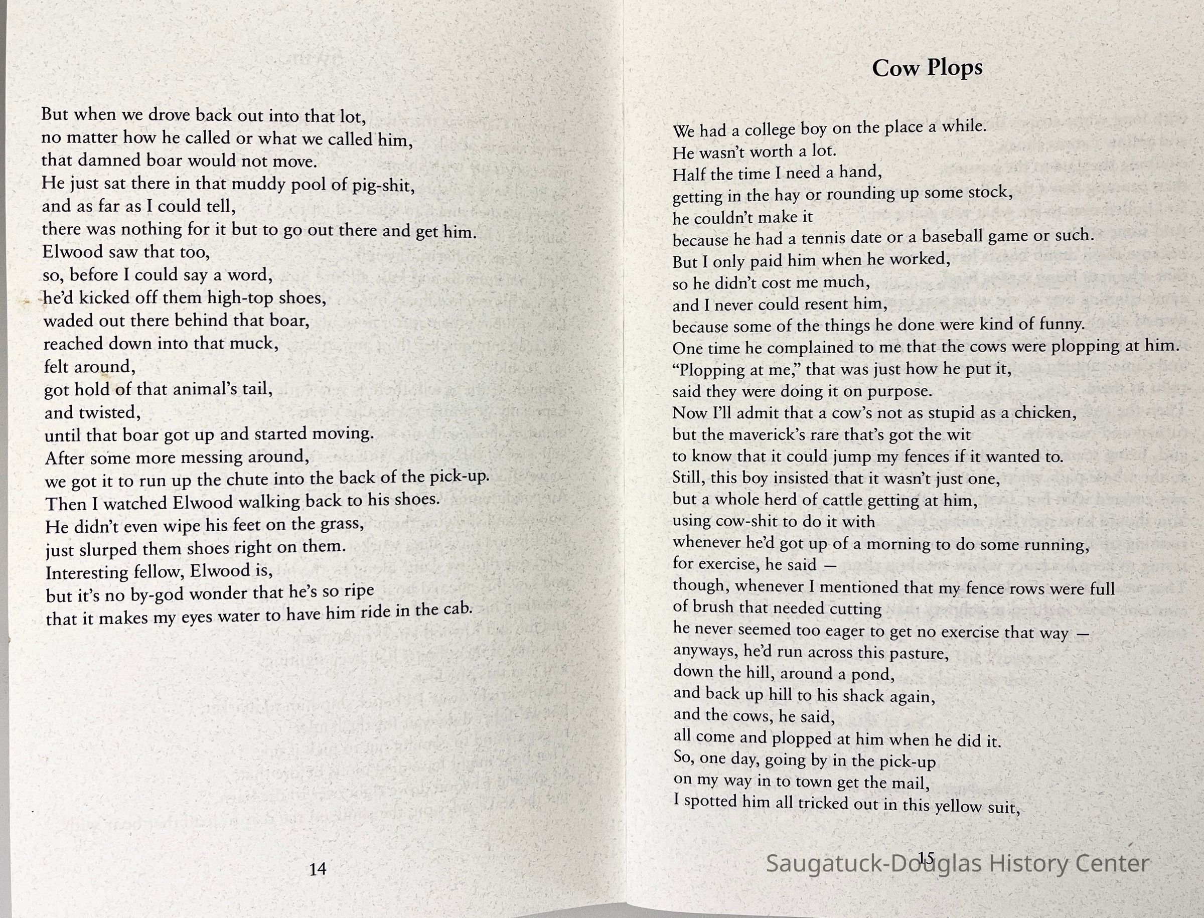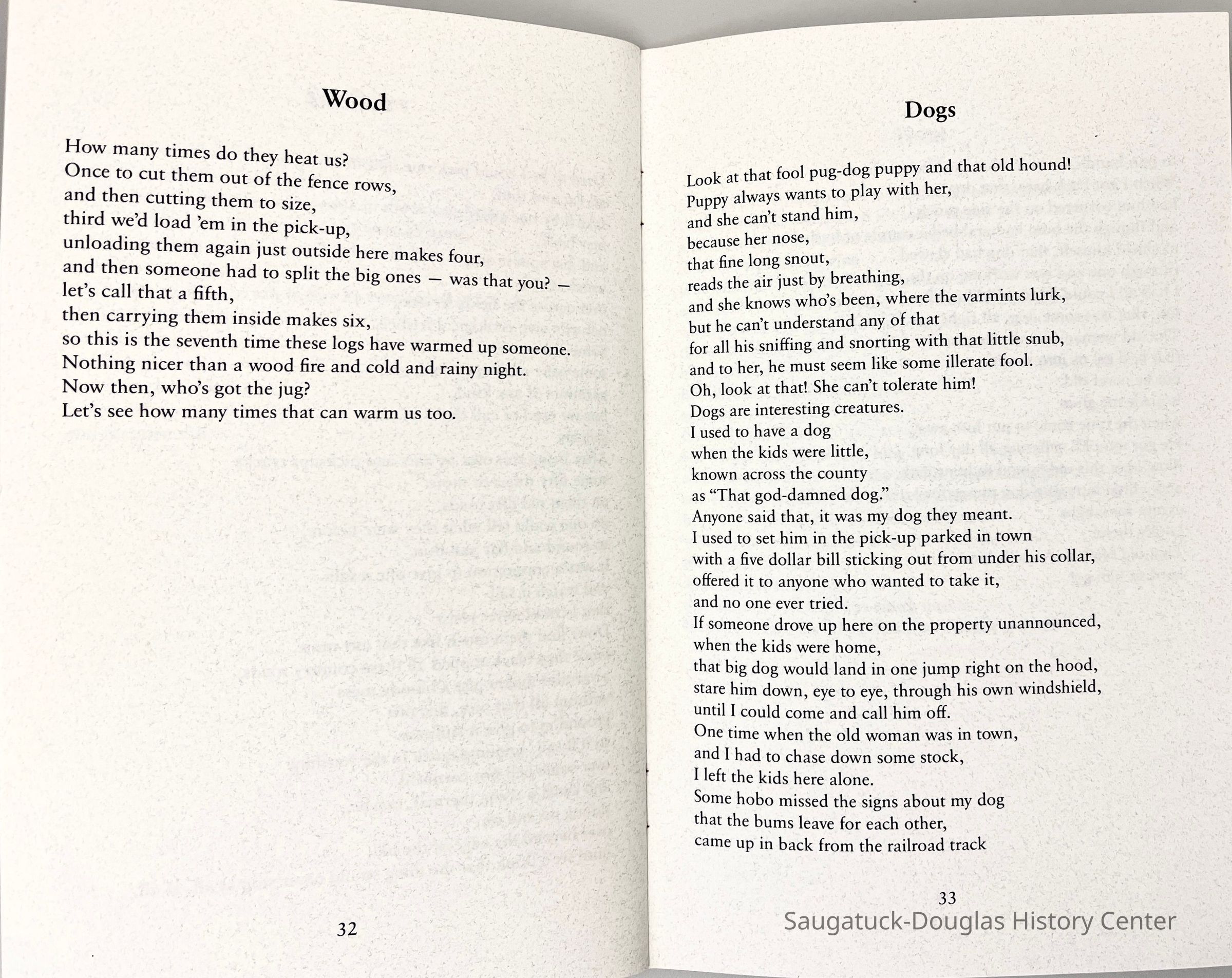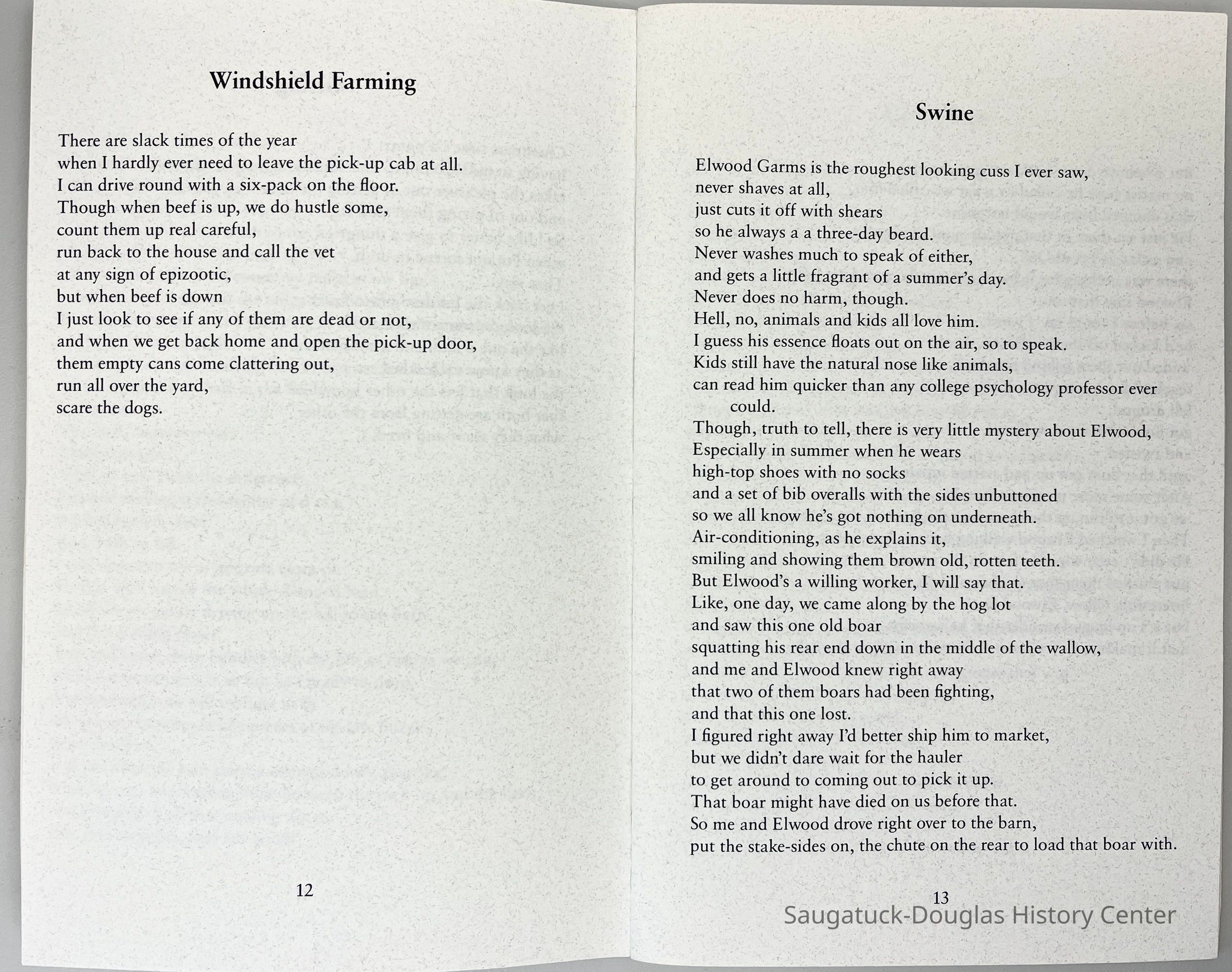 Booklet of poems published by Pier Cove Publications 1991. The cover has a line illustration by Jennifer Field of a man in overalls with a sun in one hand and a mood under the other. The book has a handwritten dedication "Fr Jeanette from Brad June 1991" in the front matter of the book.The book is printed on cream-colored paper with embedded blue flecks.Context