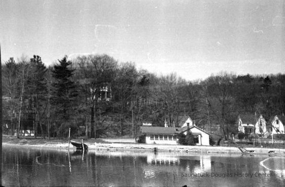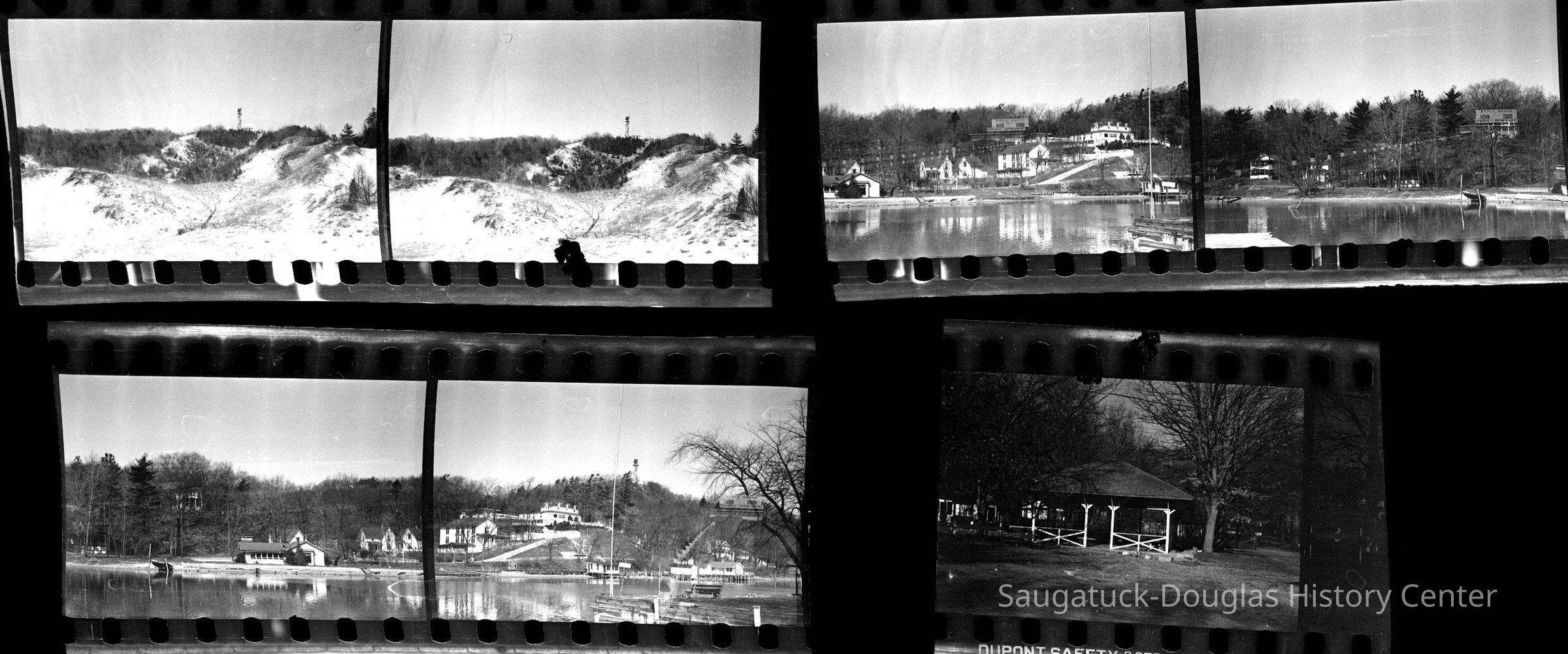 35mm shots of the Underwood cottage on the west shore of the river, Holiday Hill with double exposure of Holiday House, Mt. Baldhead picnic pavilion, Mt. Baldhead radar station from Oval Beach with domeless radar antenna.