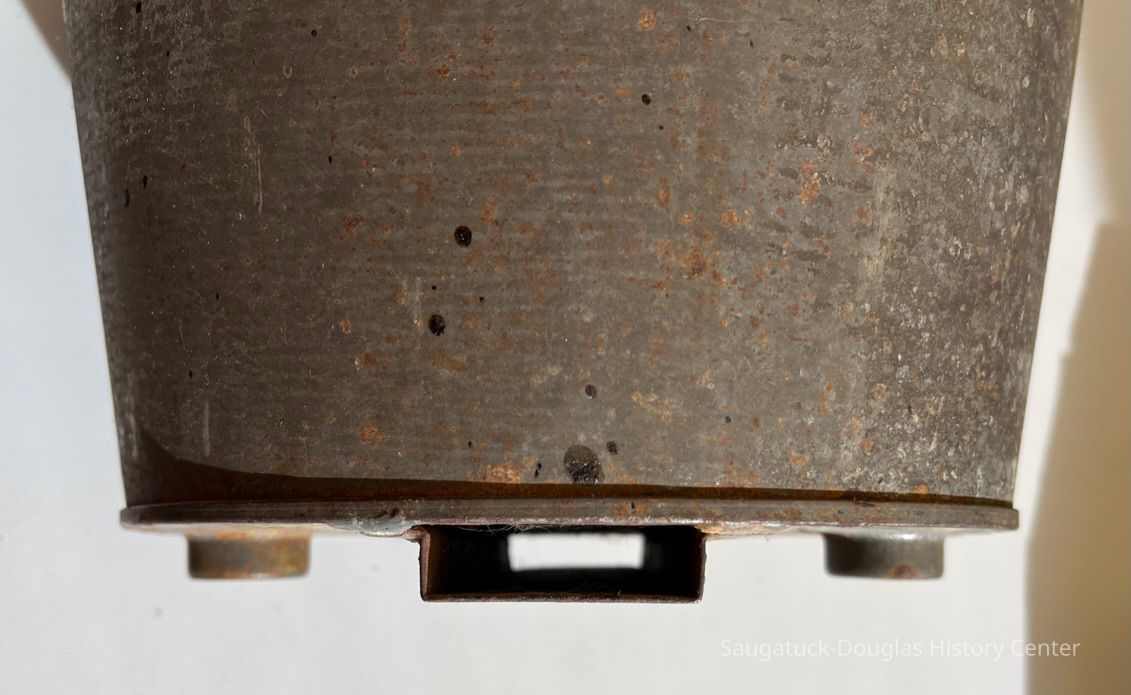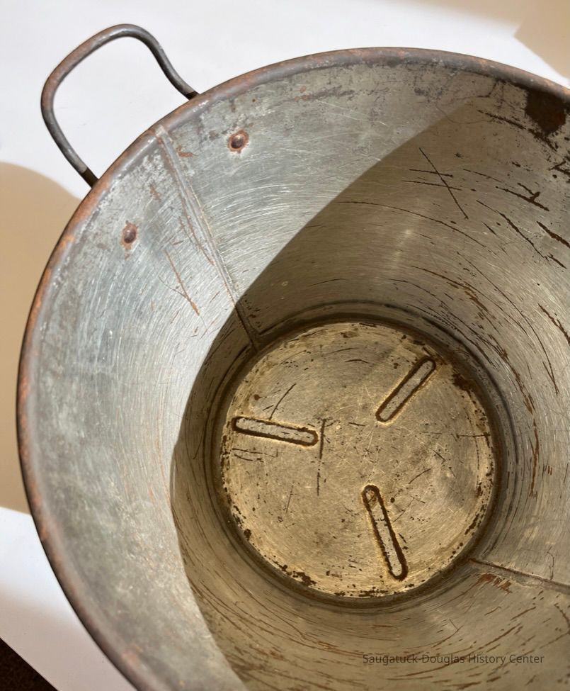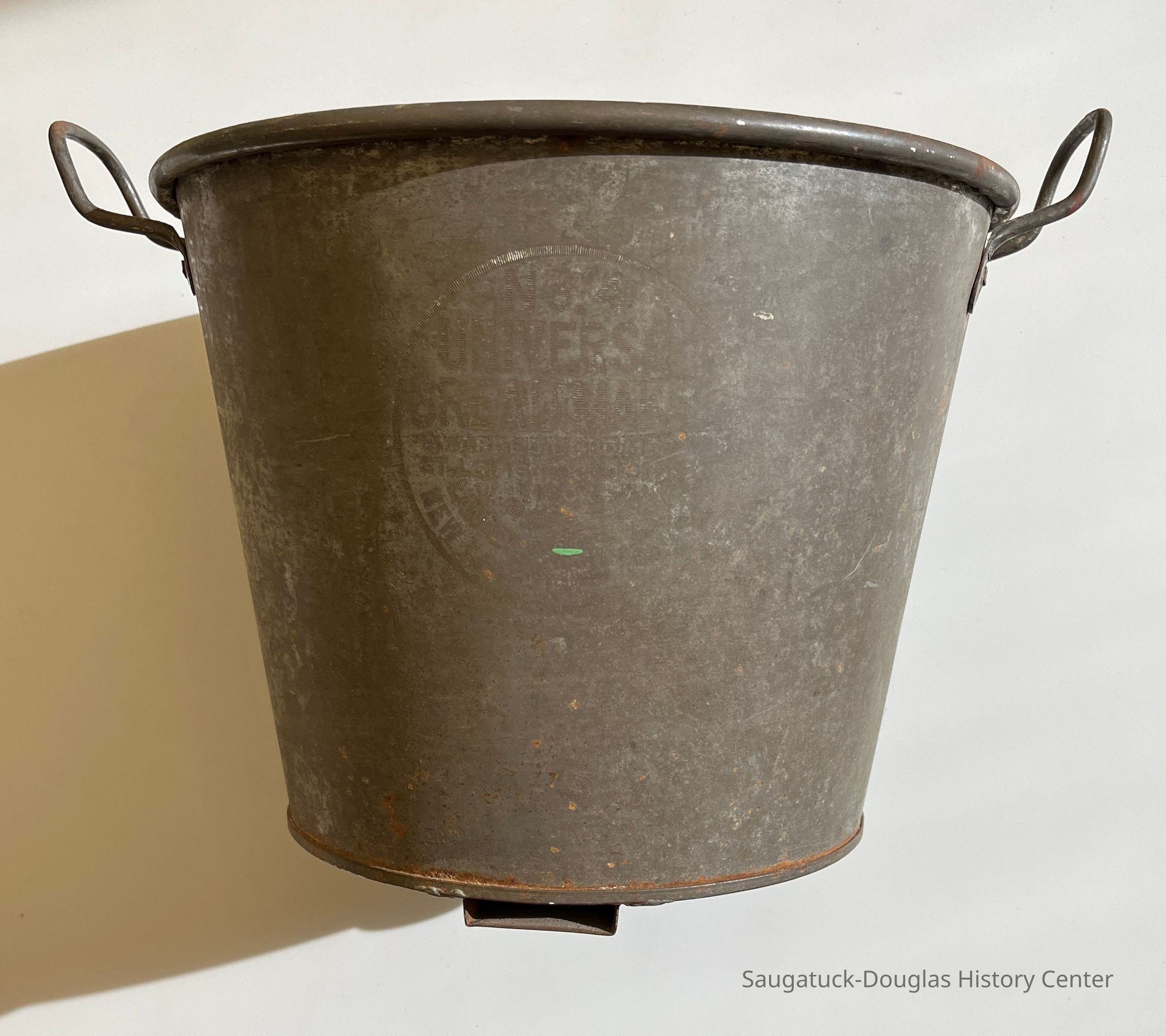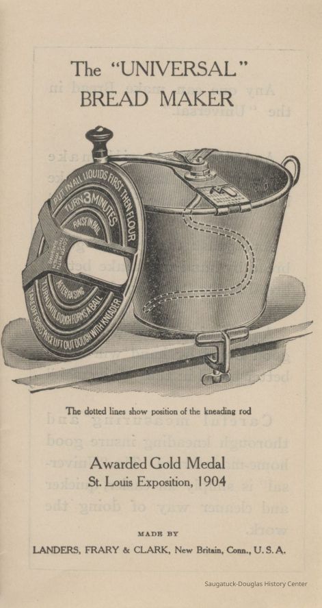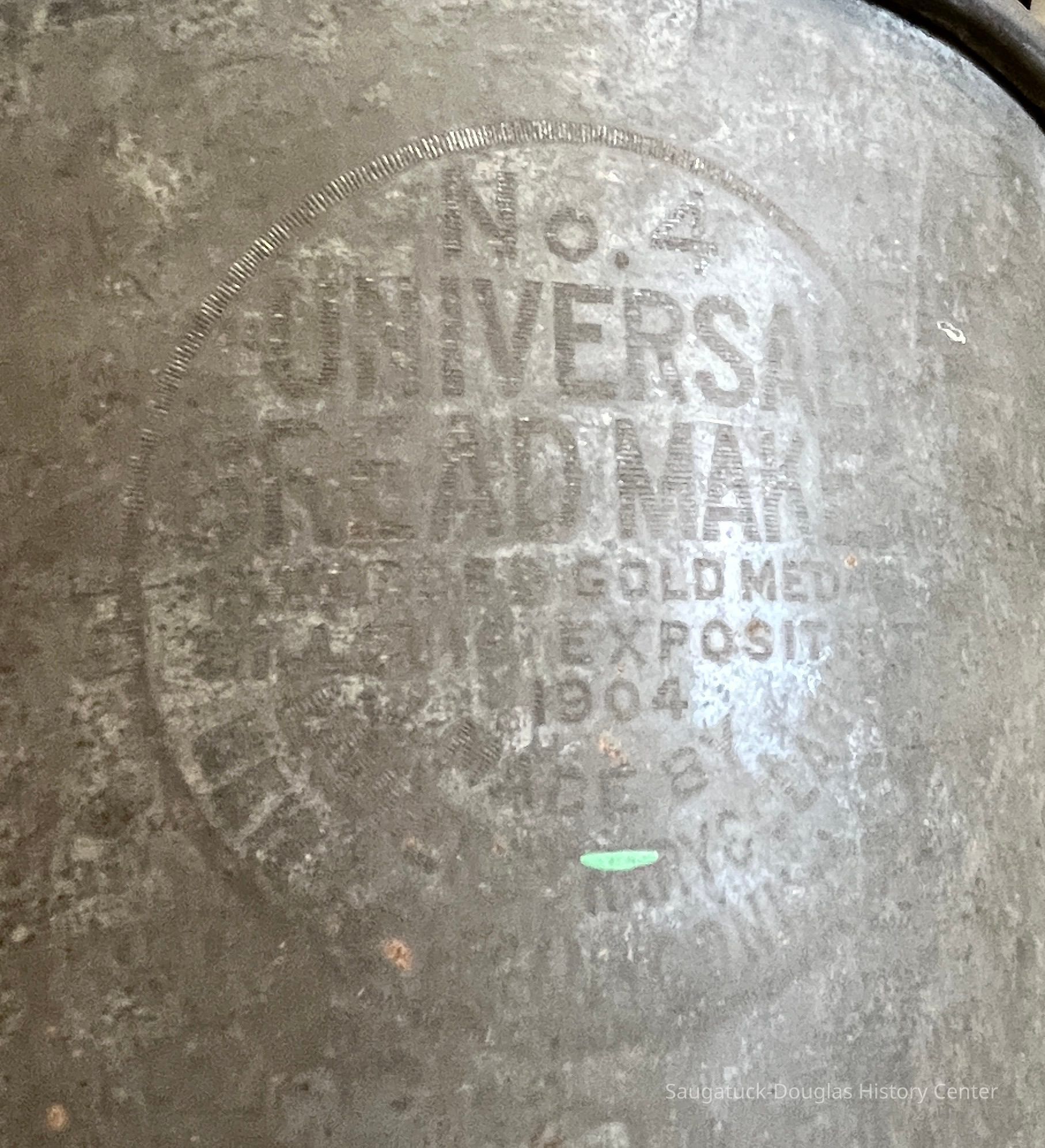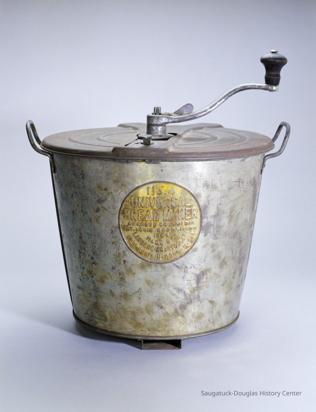 Mixing bowl or pail from a No. 4 Universal Bread Maker. The metal, bucket-shaped appliance once included a lid, a table clamp and crank to turn a dough hook. The side of the bucket displays branding that reads "No. 4, Universal Bread Maker, Awarded Gold Medal, St. Louis Exposition, 1904, Made by Landers, Frary & Lark, New Britain, Connecticut, U.S.A."Context