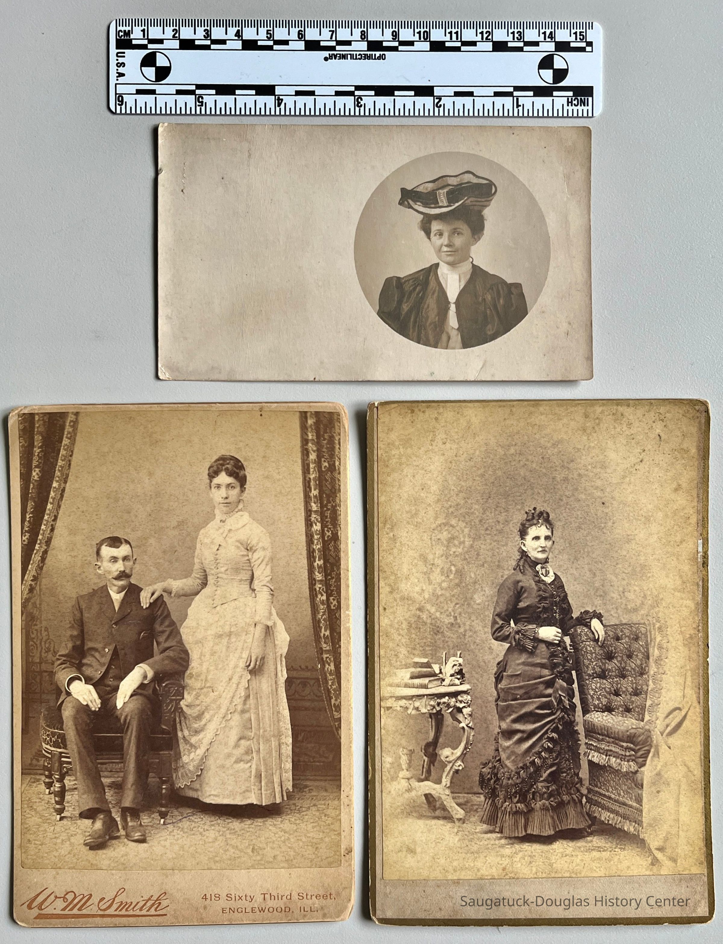 Three photographs of unidentified people in Victorian dress.