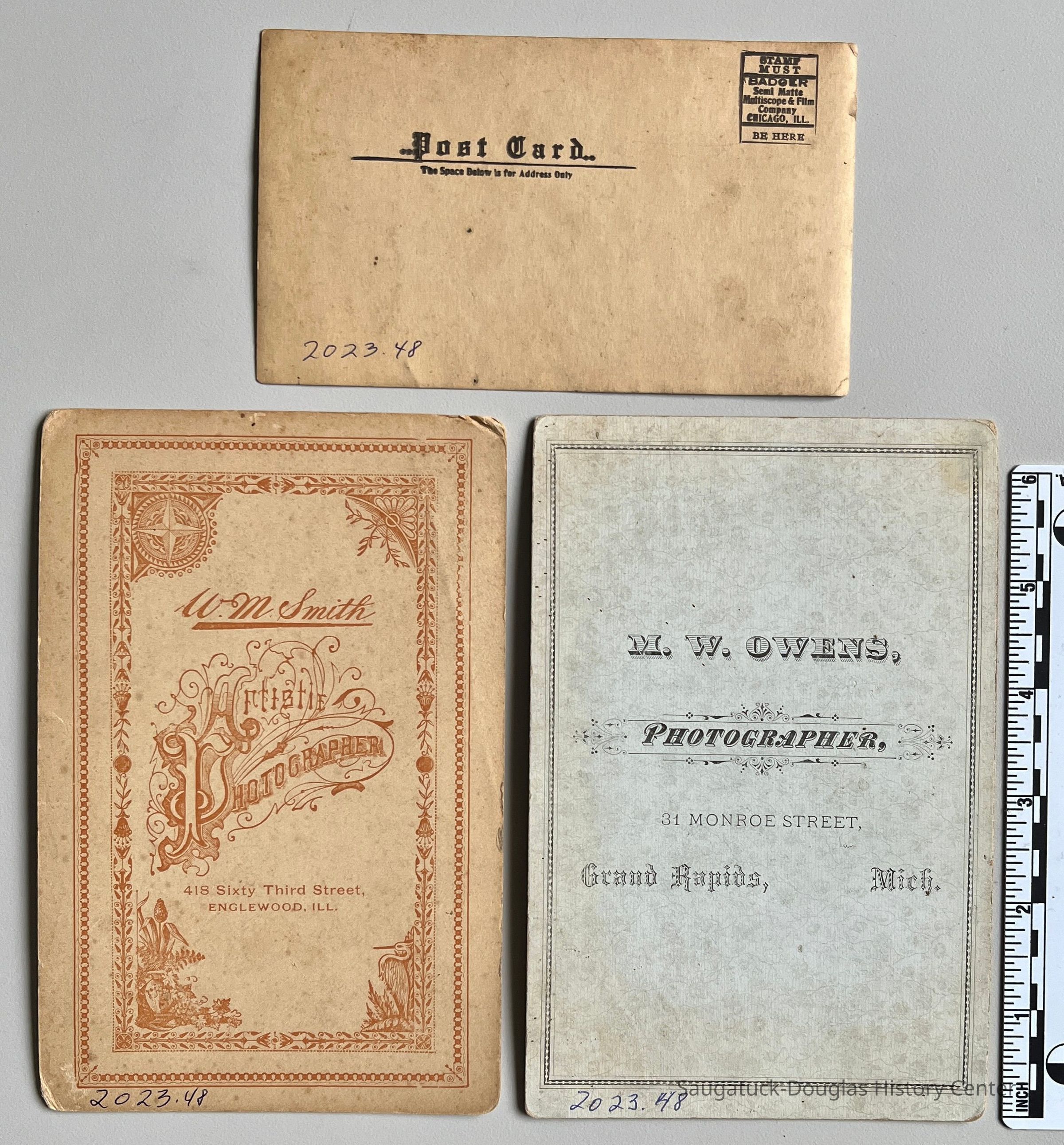 B. Cabinet card studio portrait of a couple. The woman rests her hand on the man's shoulder. Printed by W.M. Smith Artistie Photographer, 418 Sixty Third Street, Englewood, ILL