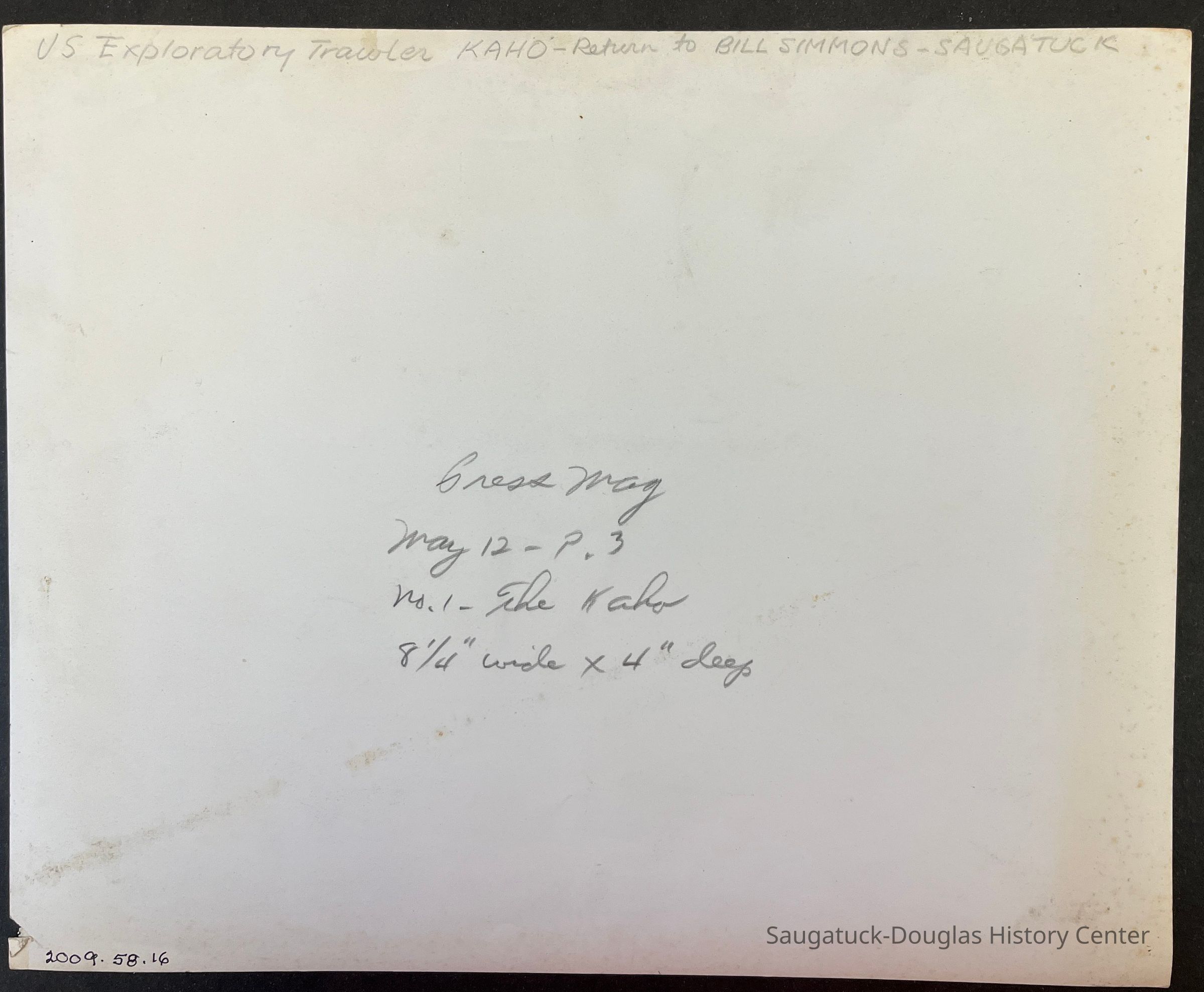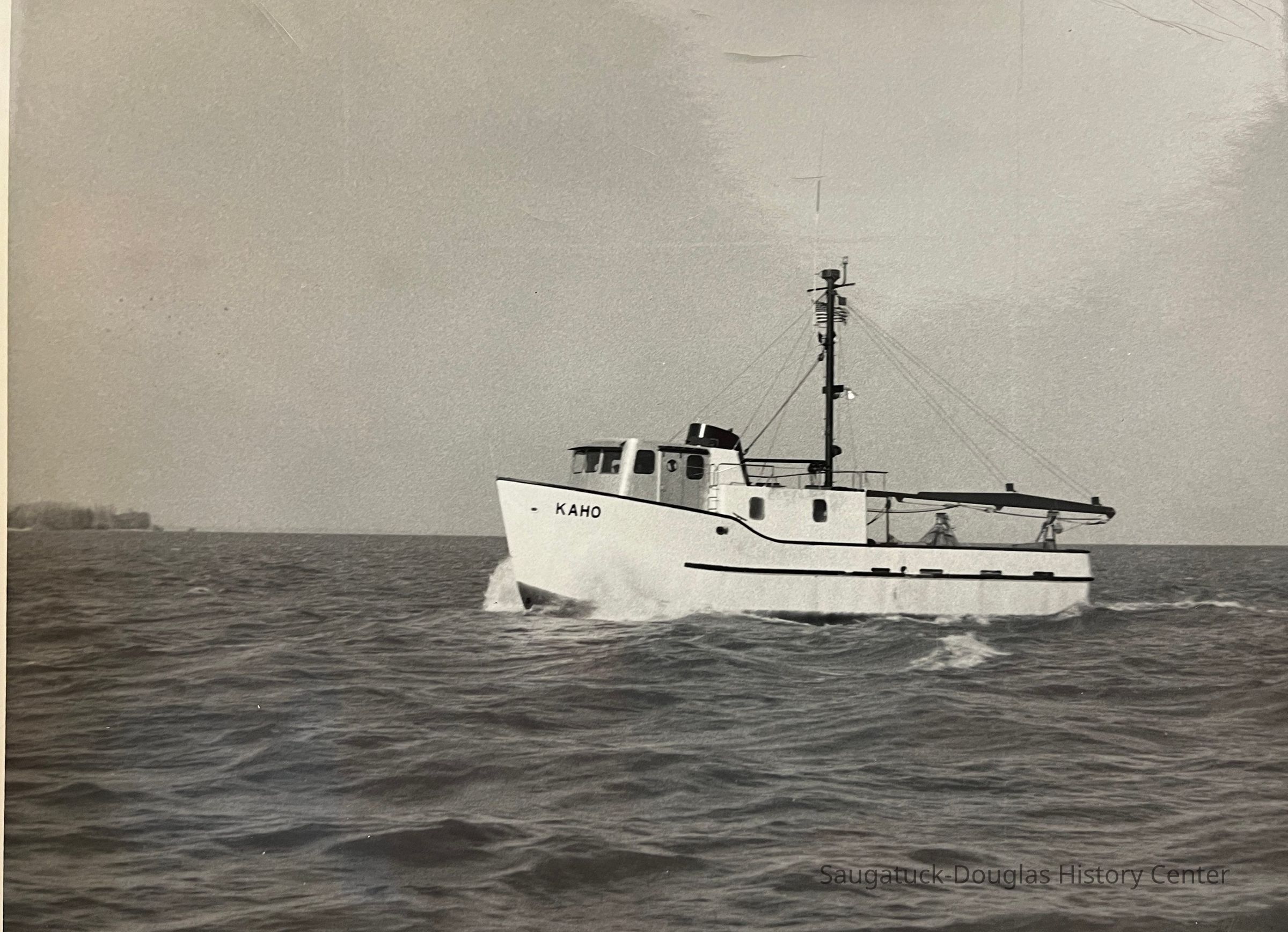 Photographic print of the KAHO, a trawler, underway and out in open water. B/W print with notes on the back indicating the photo was used in a publication.Photograph Details