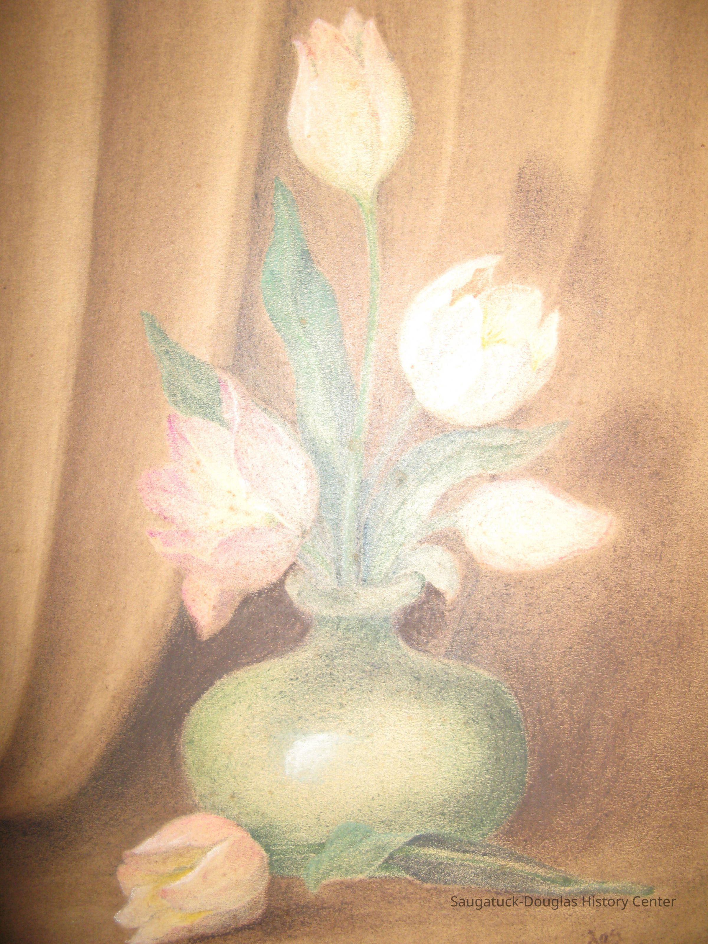 This crayon drawing depicts tulips set in a green vase with a curtain in the background.Collection