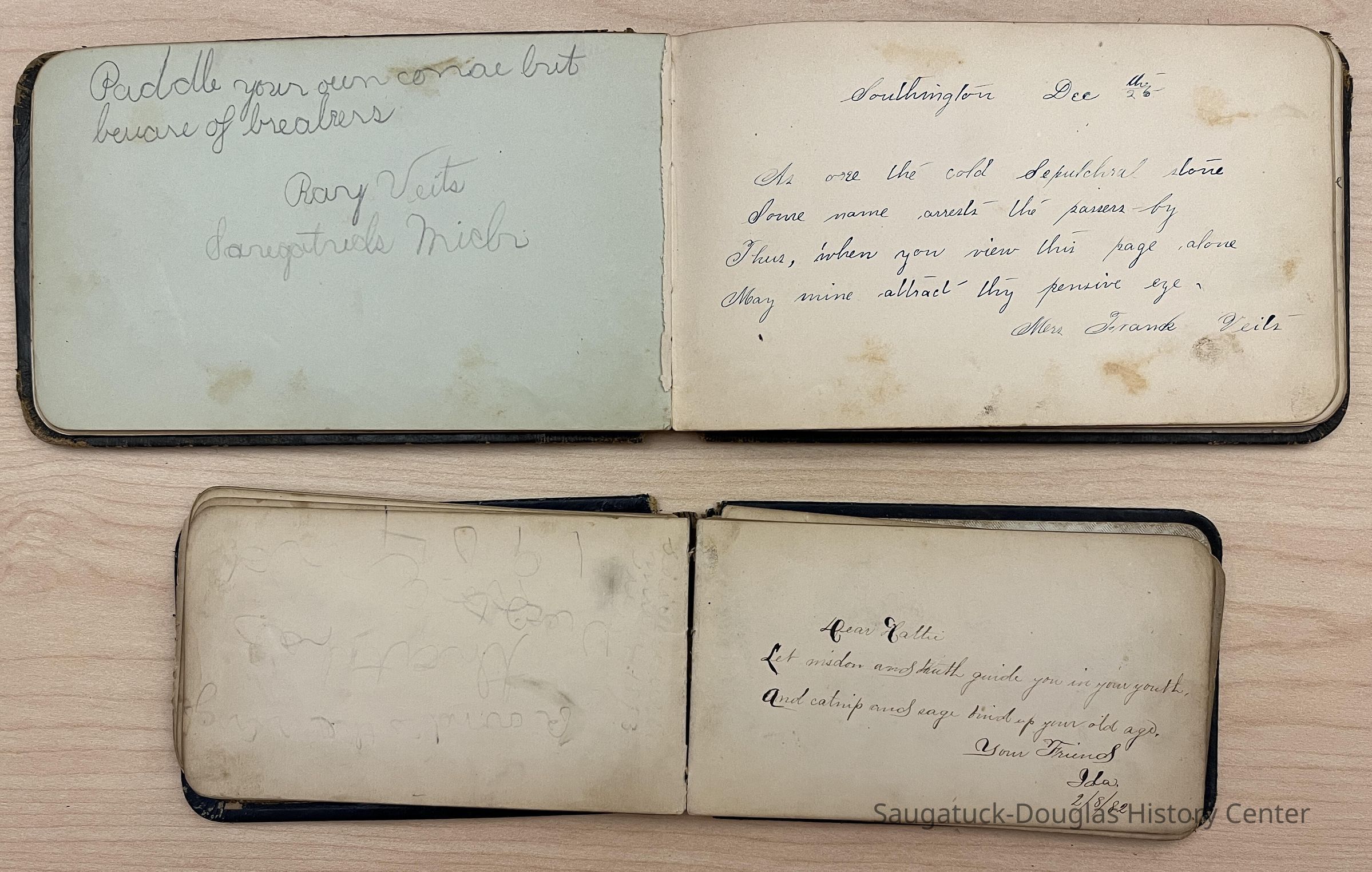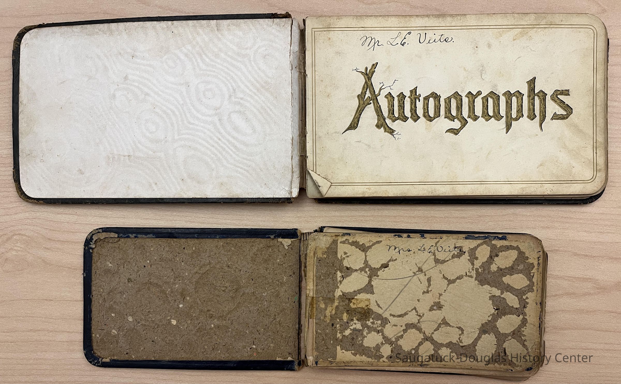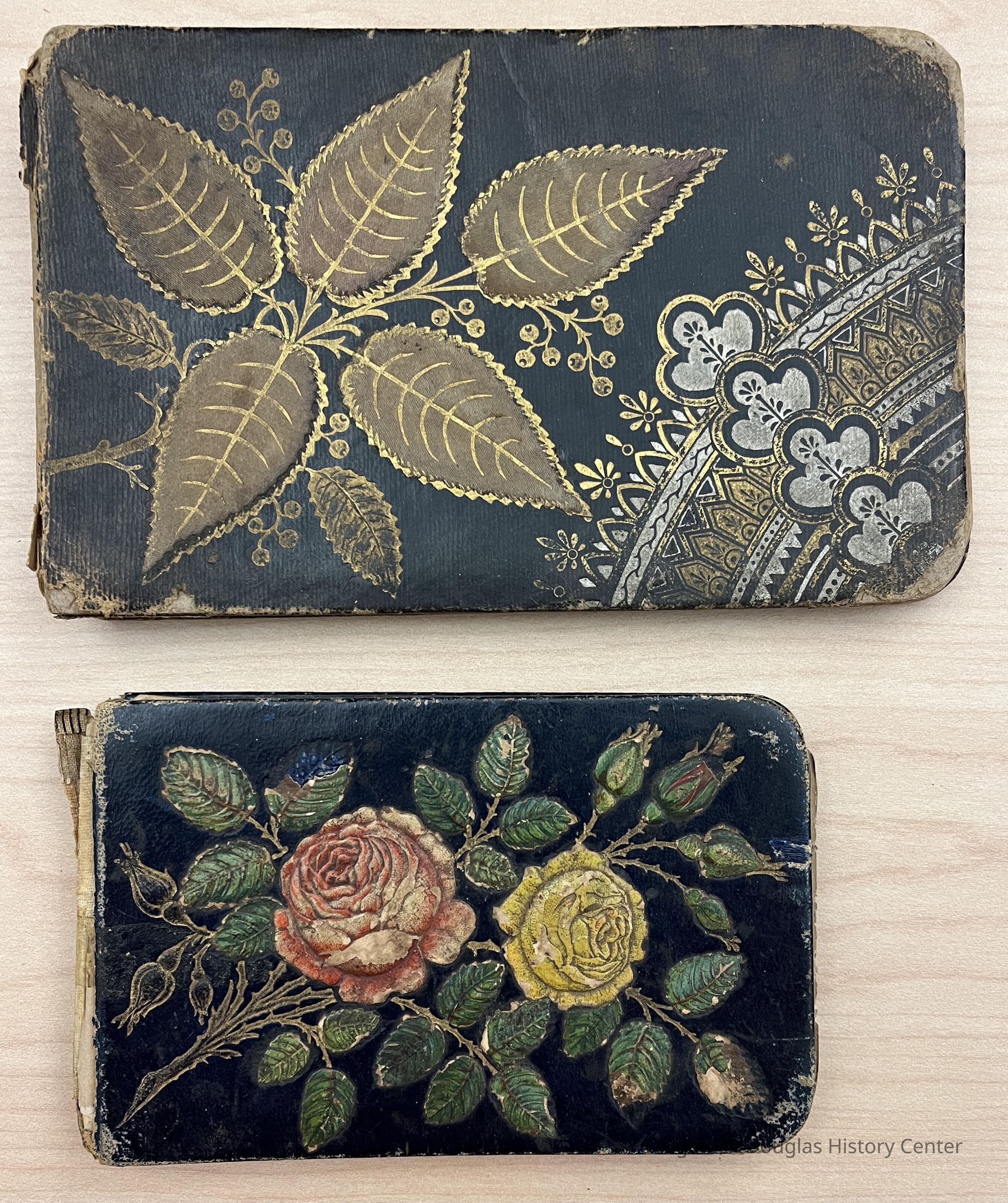 Two ornate autograph albums with elaborate, decorated covers with floral motifs with inscriptions from the 1880s.