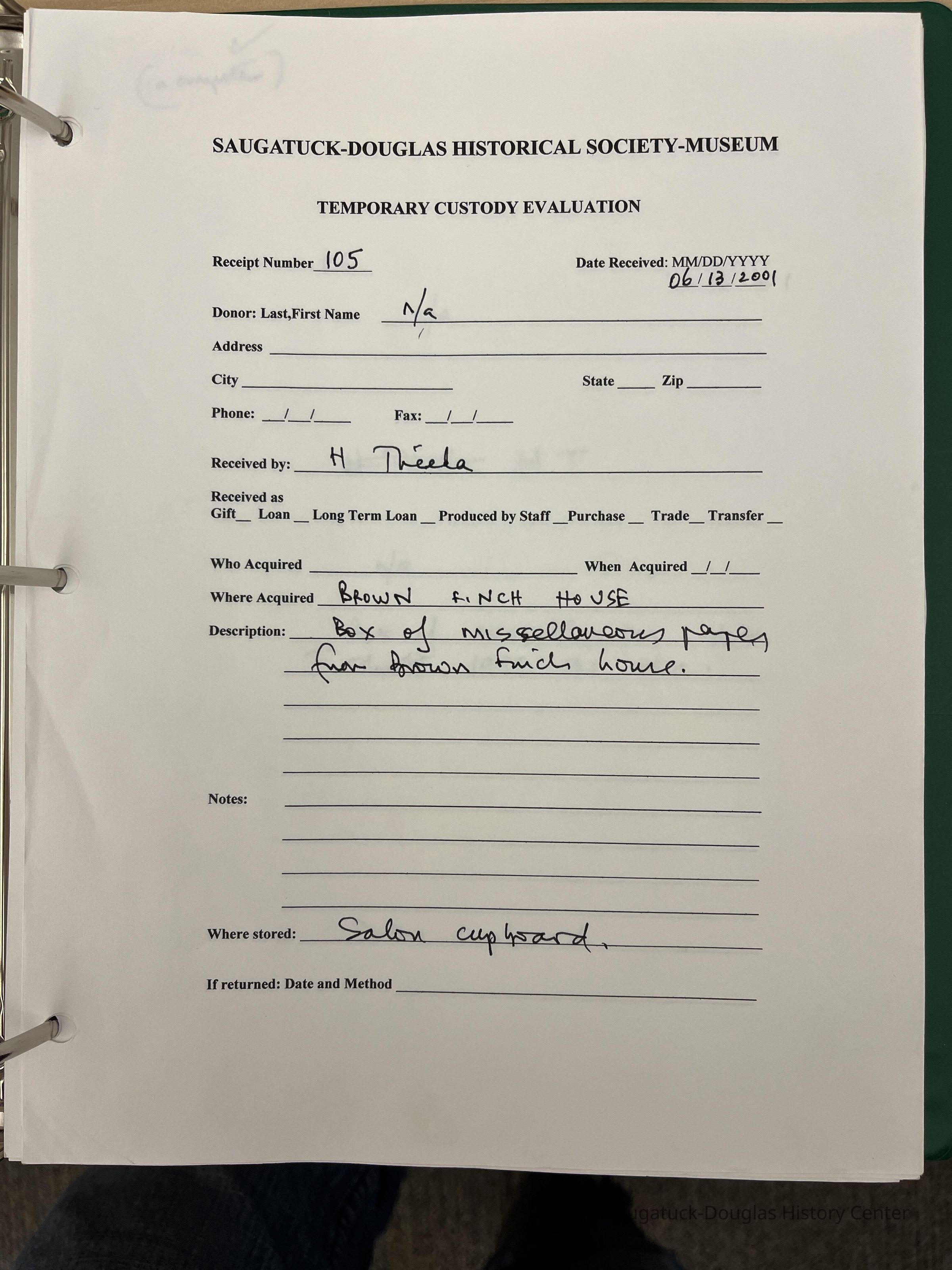 Thought to be the property of Hattie (Smalley) Veits. Both items were donated to the SDHS in 2001 after being found in the Brown Finch house, see temporary custody evaluation # 105.Location