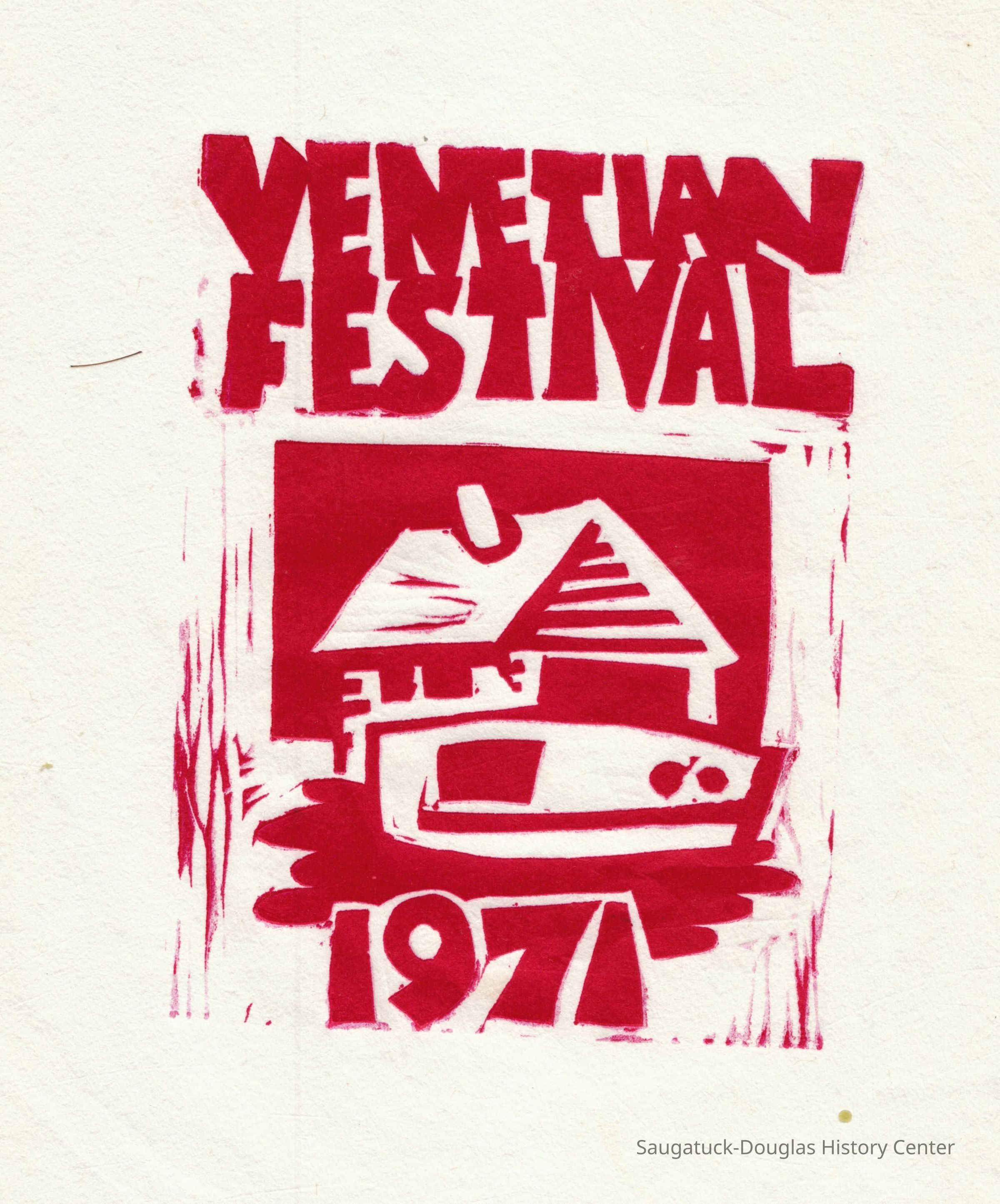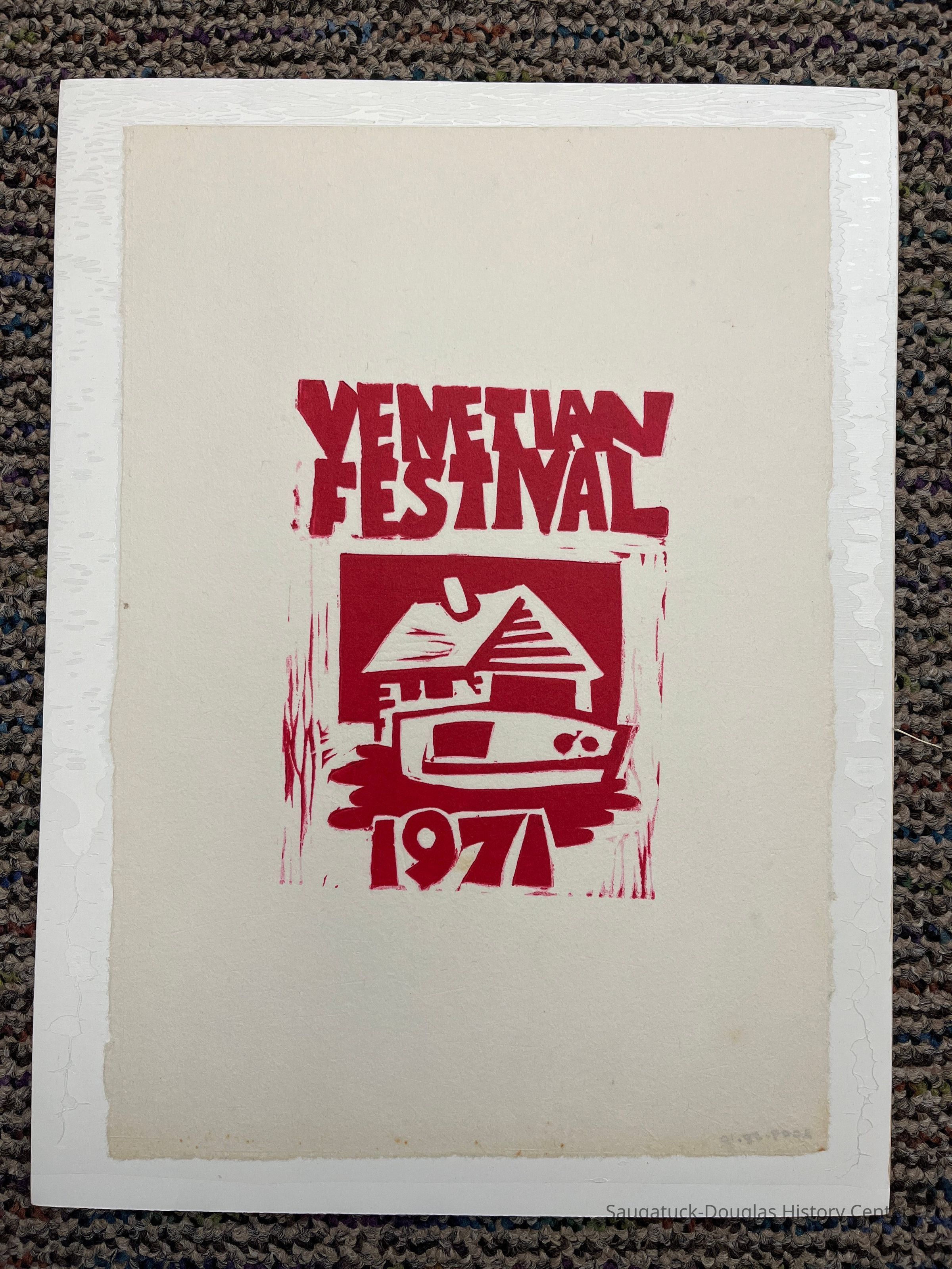 Woodblock print of a boat and cabin for the 1971 Venetian FestivalCollection