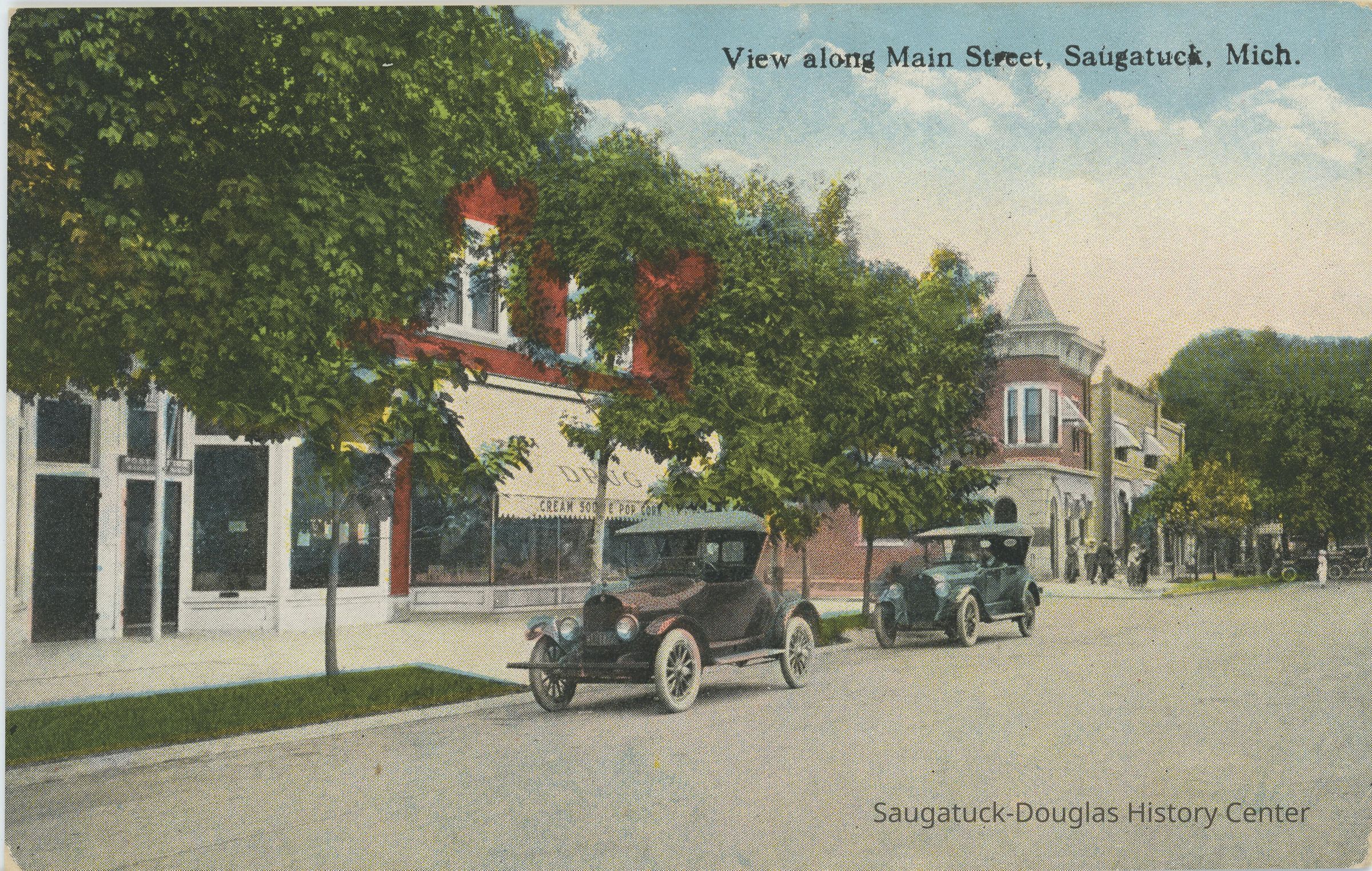 A color postcard showing a street view of Main St in Saugatuck, Michigan. Two cars are parallel parked in front of the drug store. People stand on the corner of the street in the background.Subject