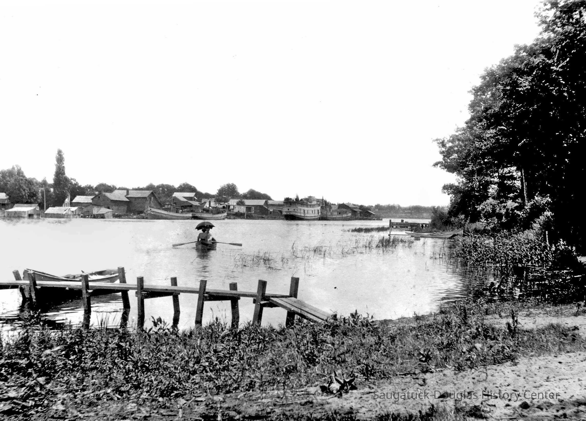 A slender plank dock juts out into the river from a shaggy shore. Two people are rowing on the river, under the shade of a parasol. In the distance a steamship and the buildings of still-sleepy town of Saugatuck are visible.