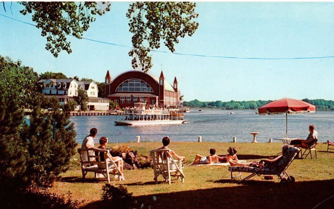 1. Looking across the river toward the big red pavilion with the boat tours boat and people relaxing on the shore 1958.
