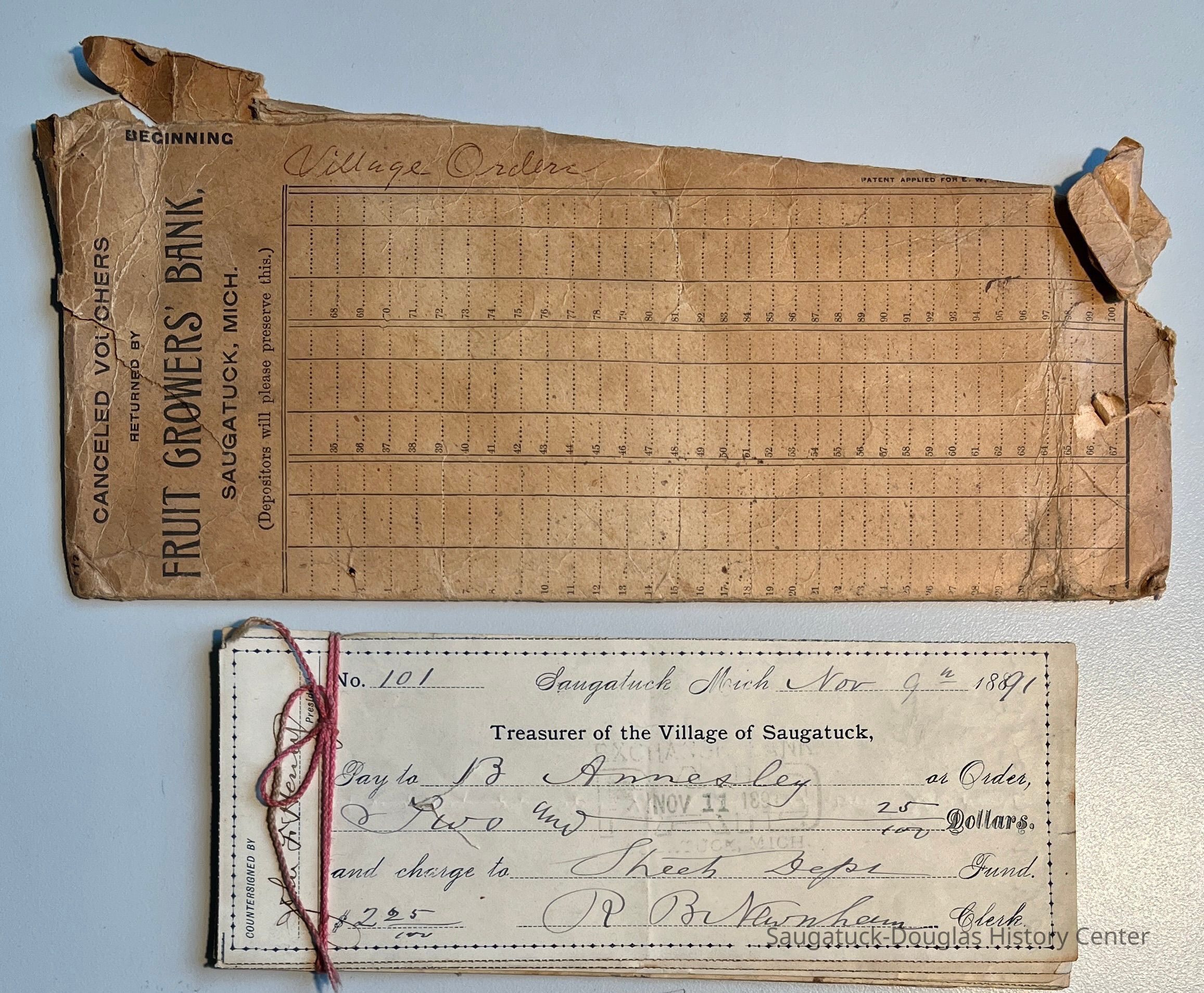 B. Sixteen checks bundled in pink twine, signed by the Saugatuck Village Treasurer R.B. Newnham in 1891.