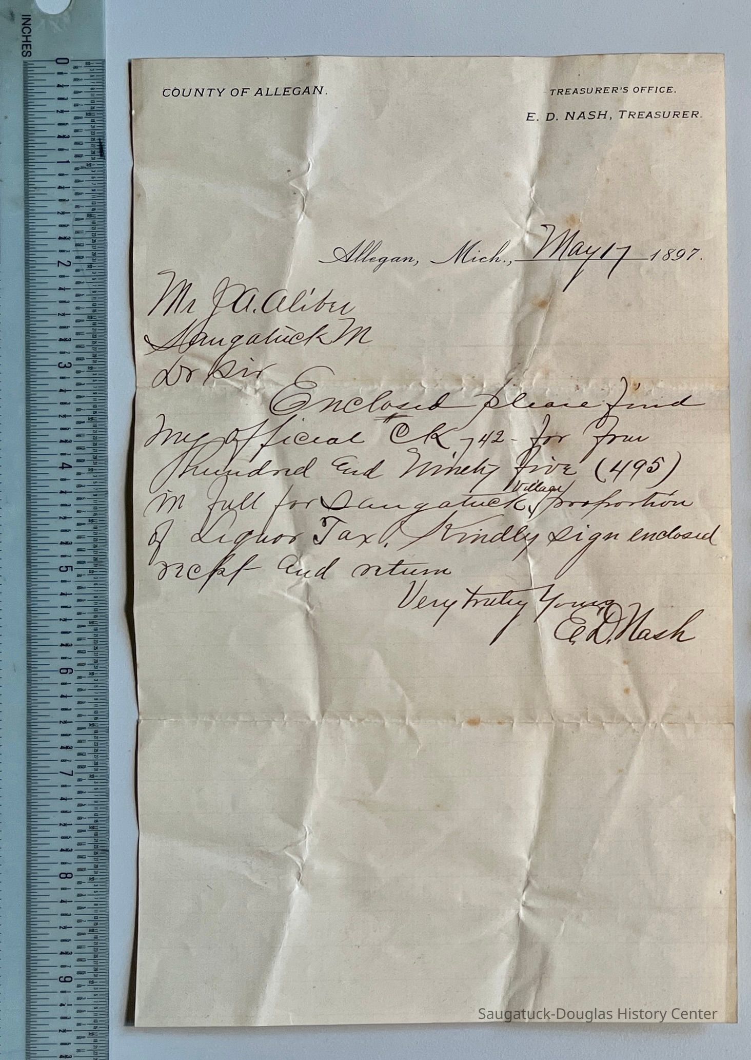 J. May 1897 letter to J.A. Aliber acknowledging receipt of Liquor Tax payment from E.D. Nash, Allegan County Treasurer.