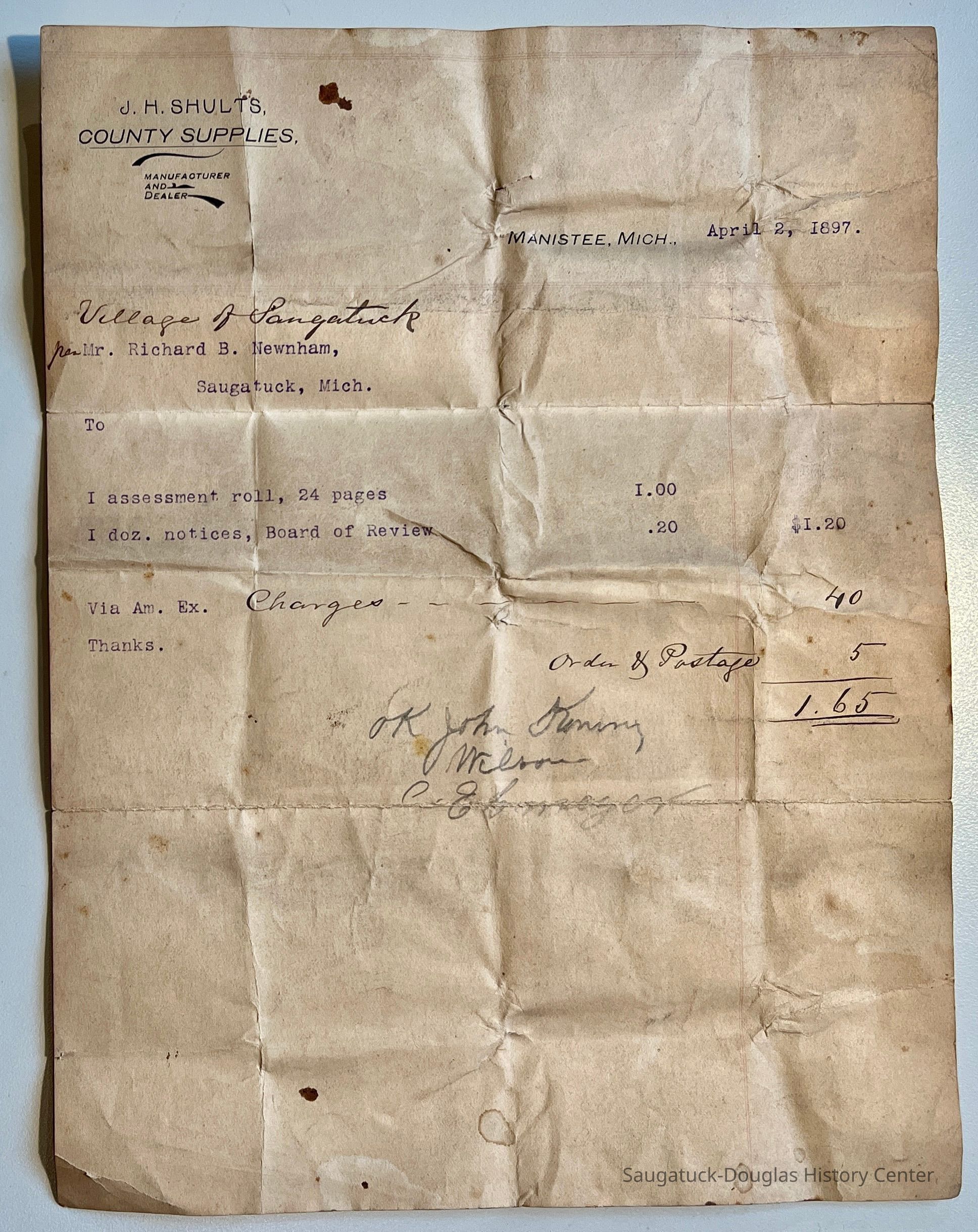 K. Invoice from J.H. Shultz Co. to Richard B. Newnham for election supplies, April 1897.