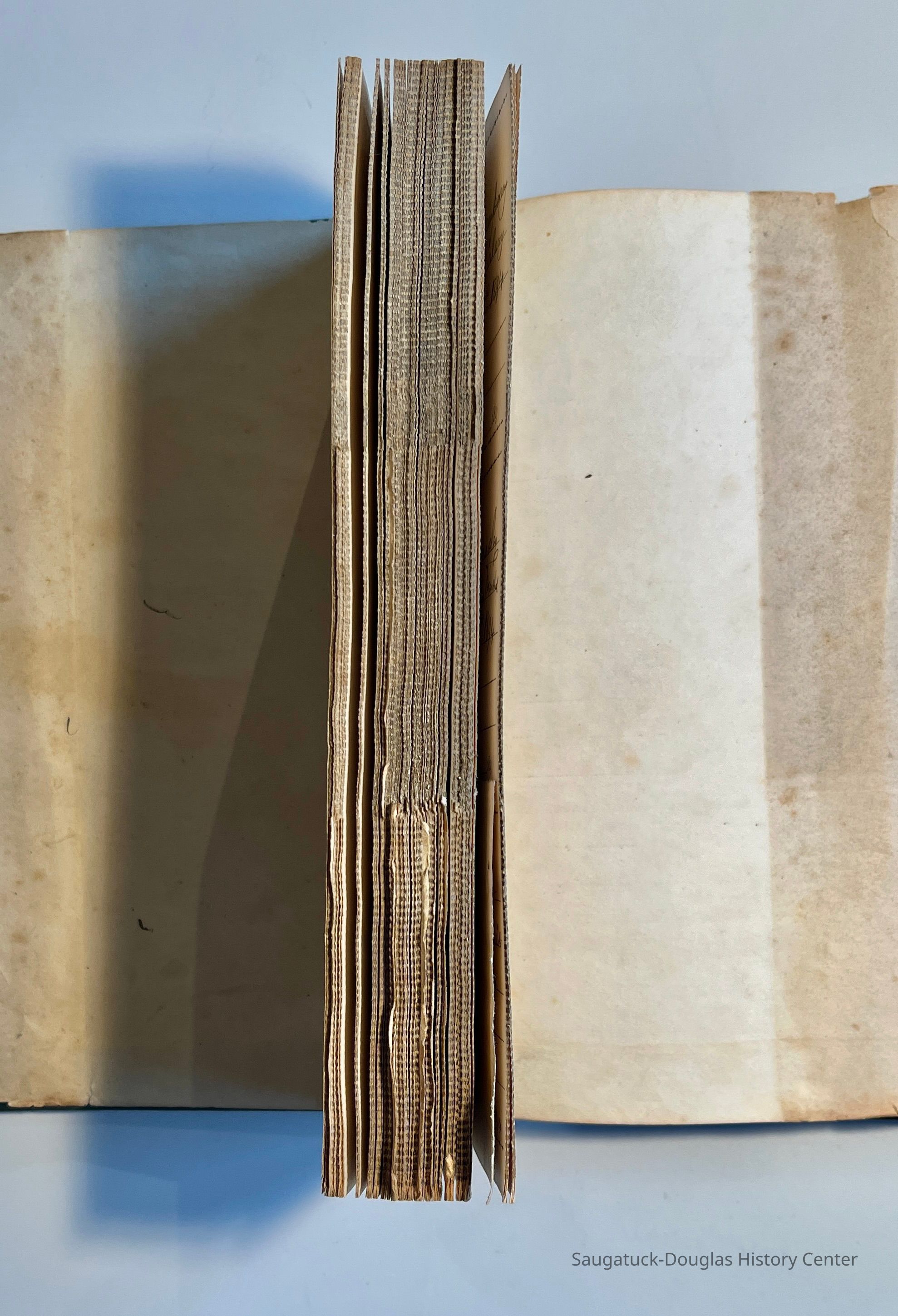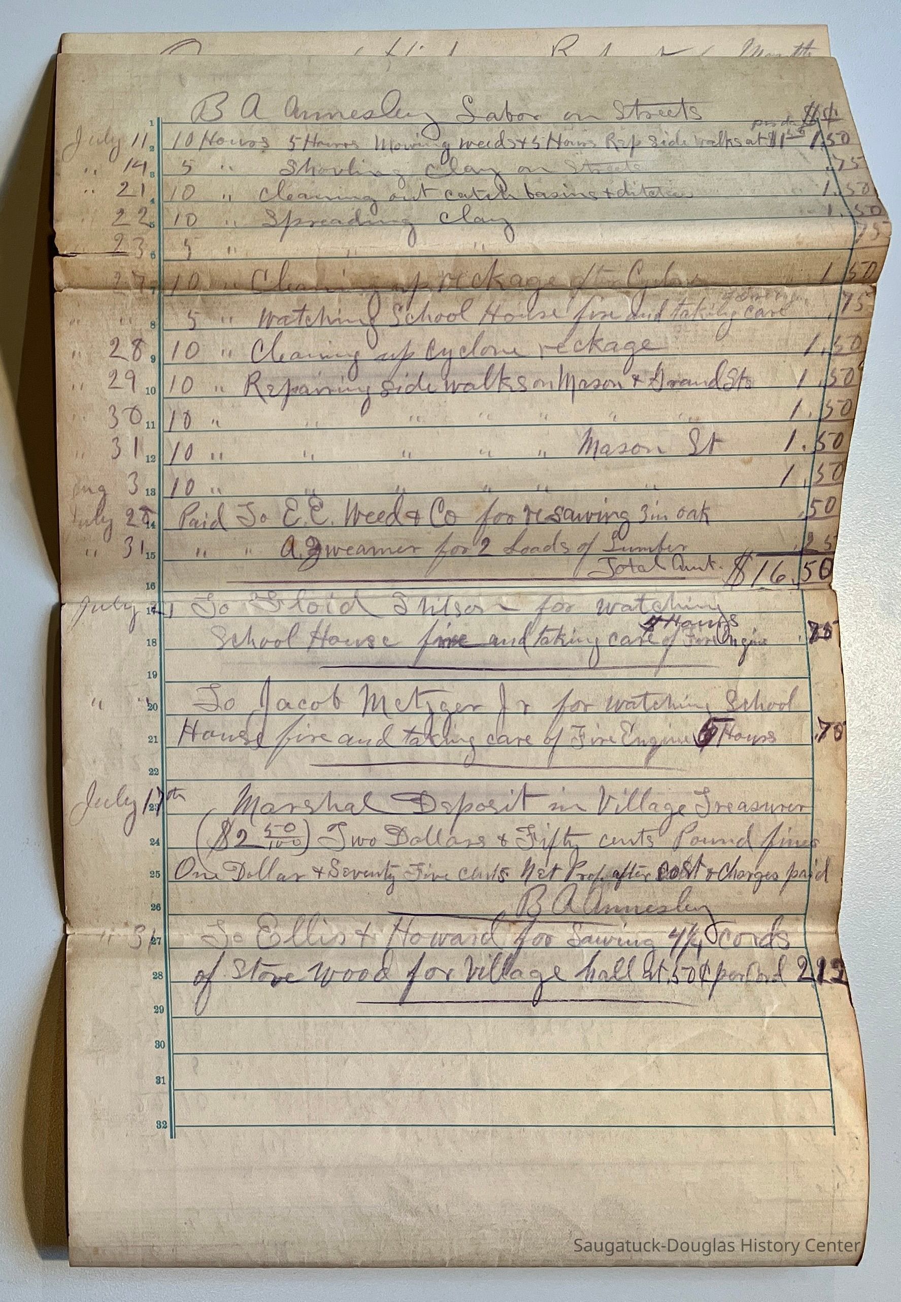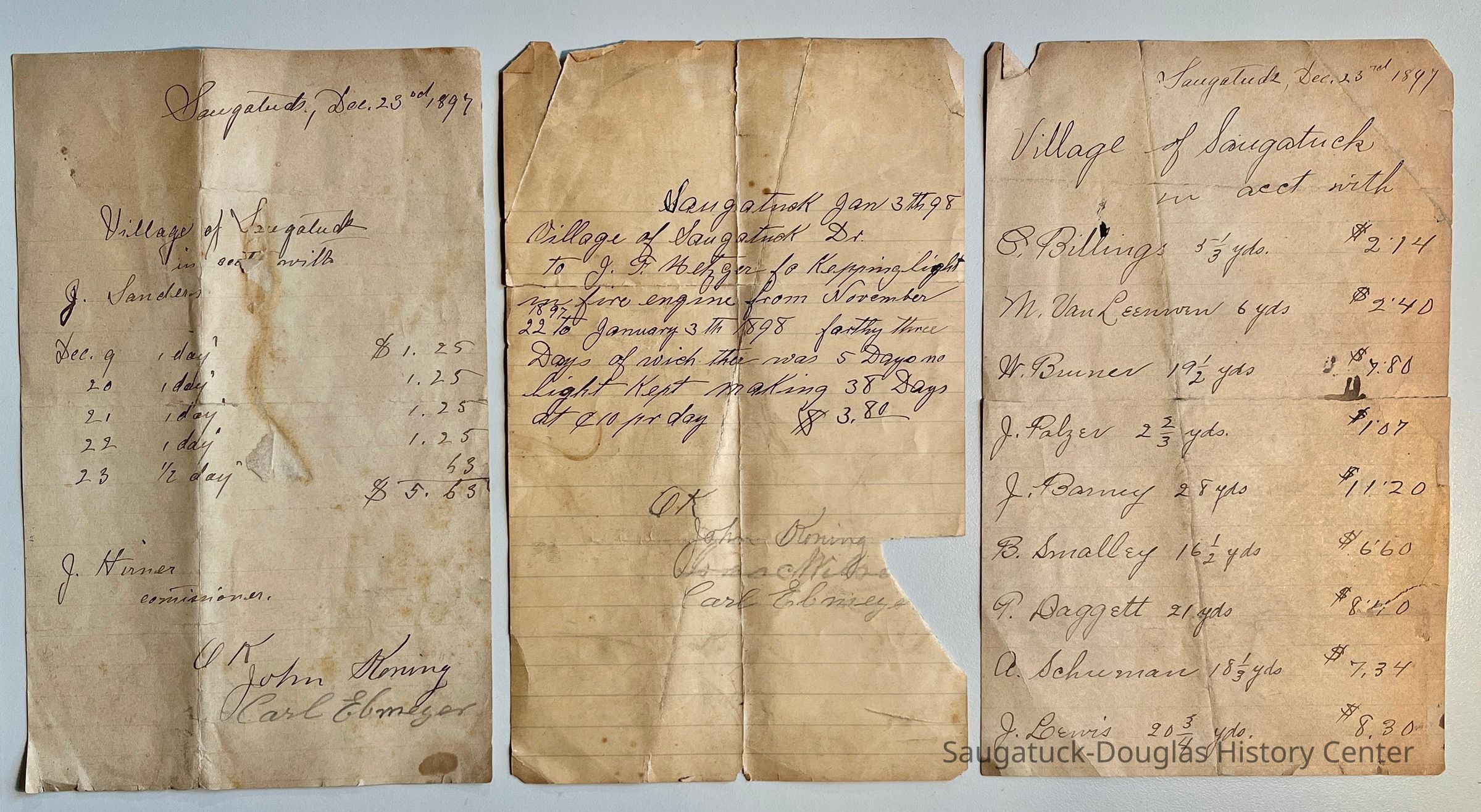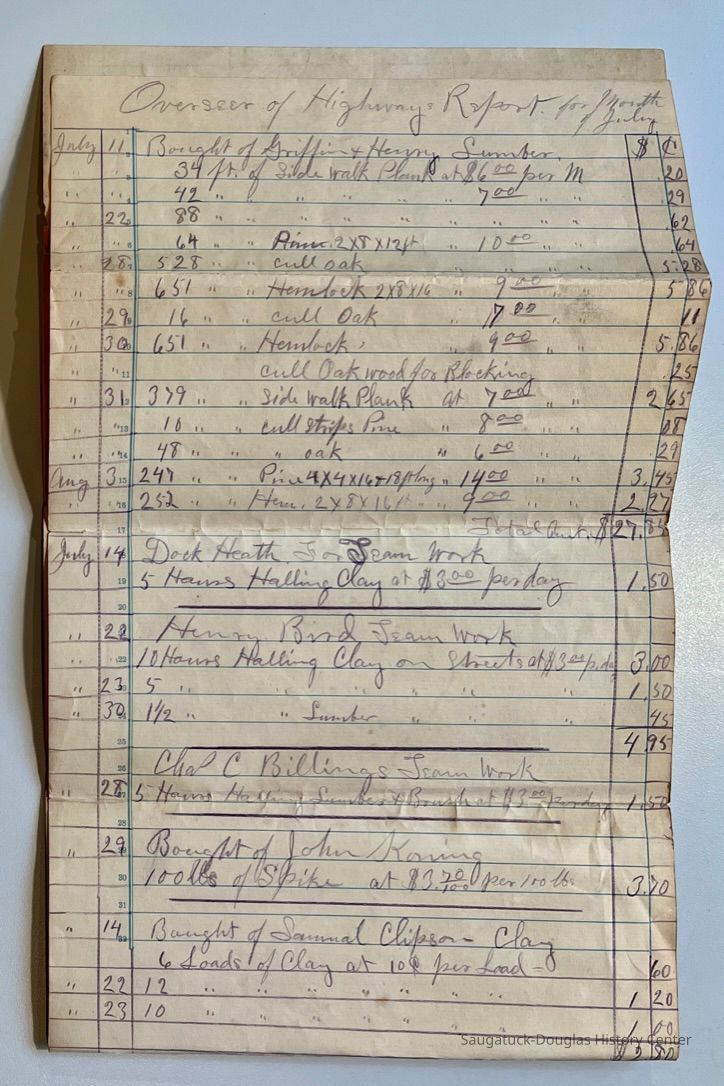 D. 8.5x11" black-fabric-covered Saugatuck Village (presumed) check book with only receipts remaining that records payments from 1892-1895. Typical payments include to C.C. Billing for hauling, salaries for R.B. Newnham and A.B. Taylor, to John Hirner for building sidewalks, to the Walz brothers for tallow, to Doc Heath for team work, to multiple payees for street work, hauling and removing garbage.