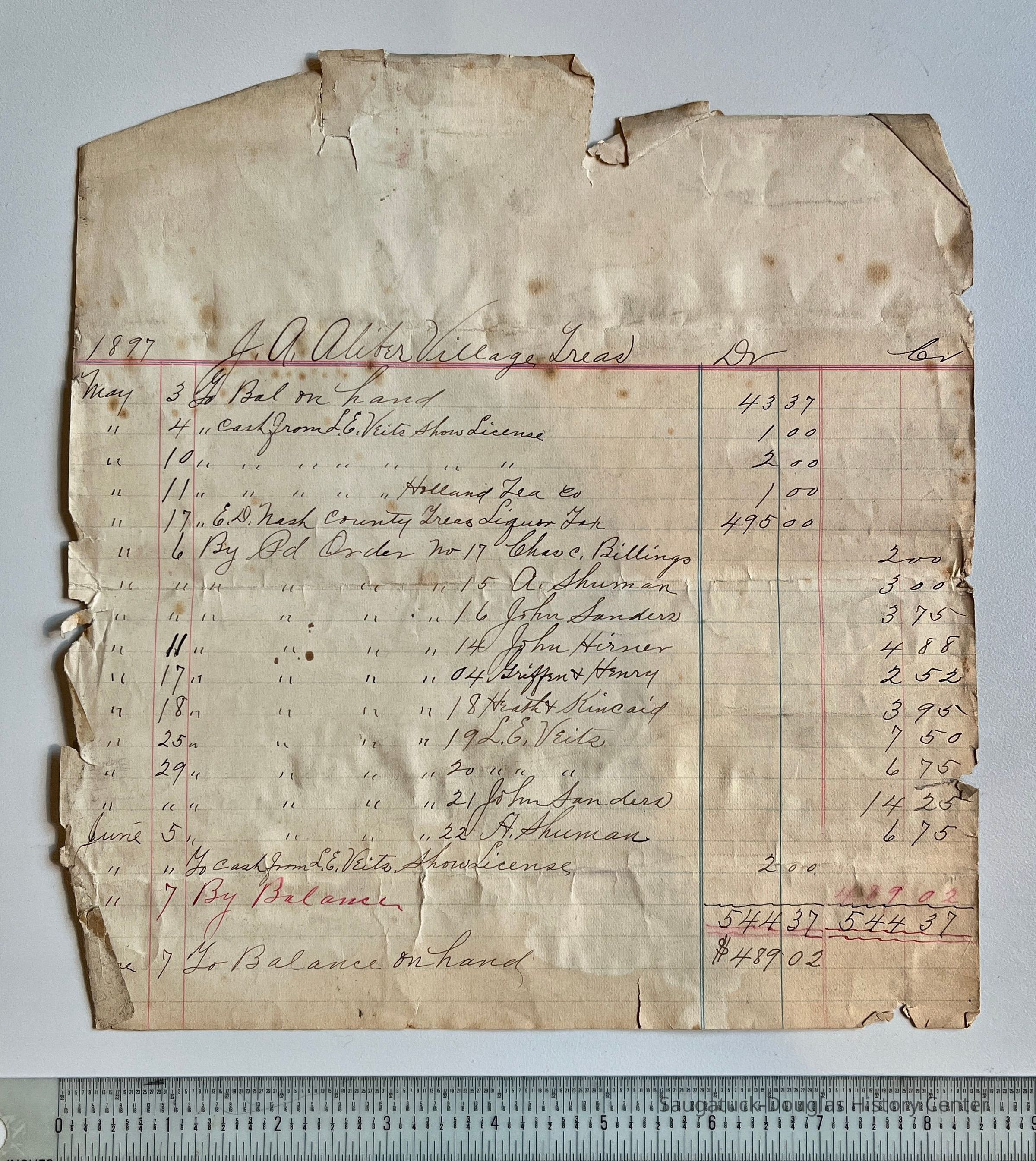 E. 1897 accounting page by J. A. Aliber, Village Treasurer, 9x8.5"