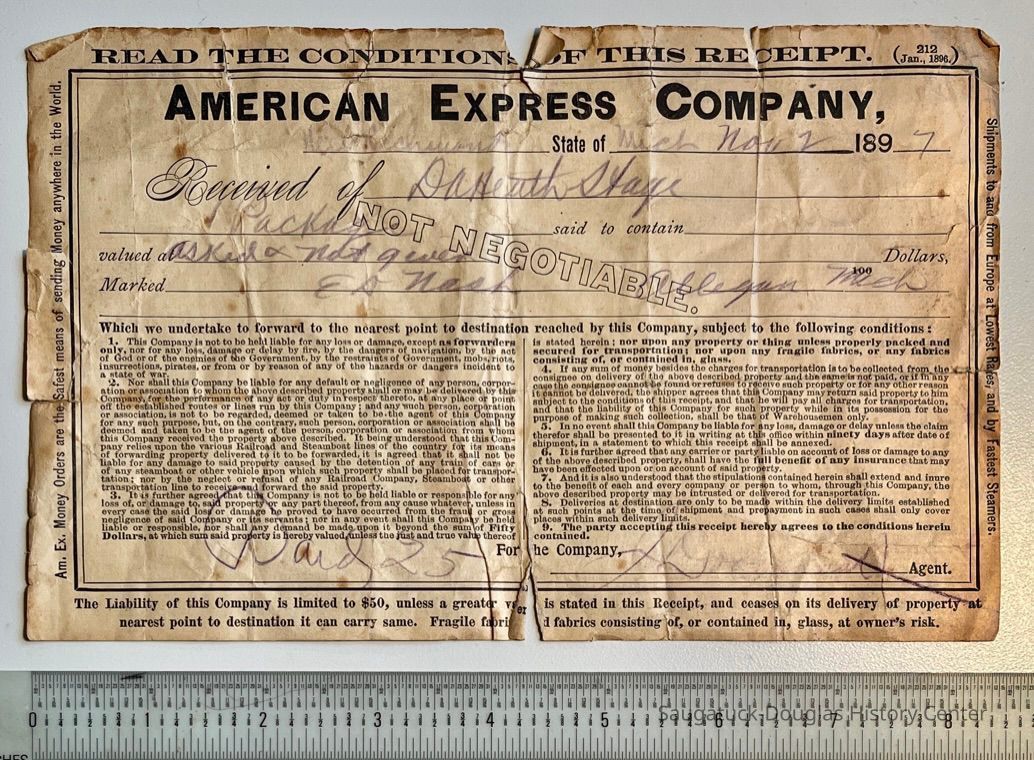 I. American Express Company receipt for E.D. Nash package, dated Nov. 2, 1897, received by Doc Heath Stage.
