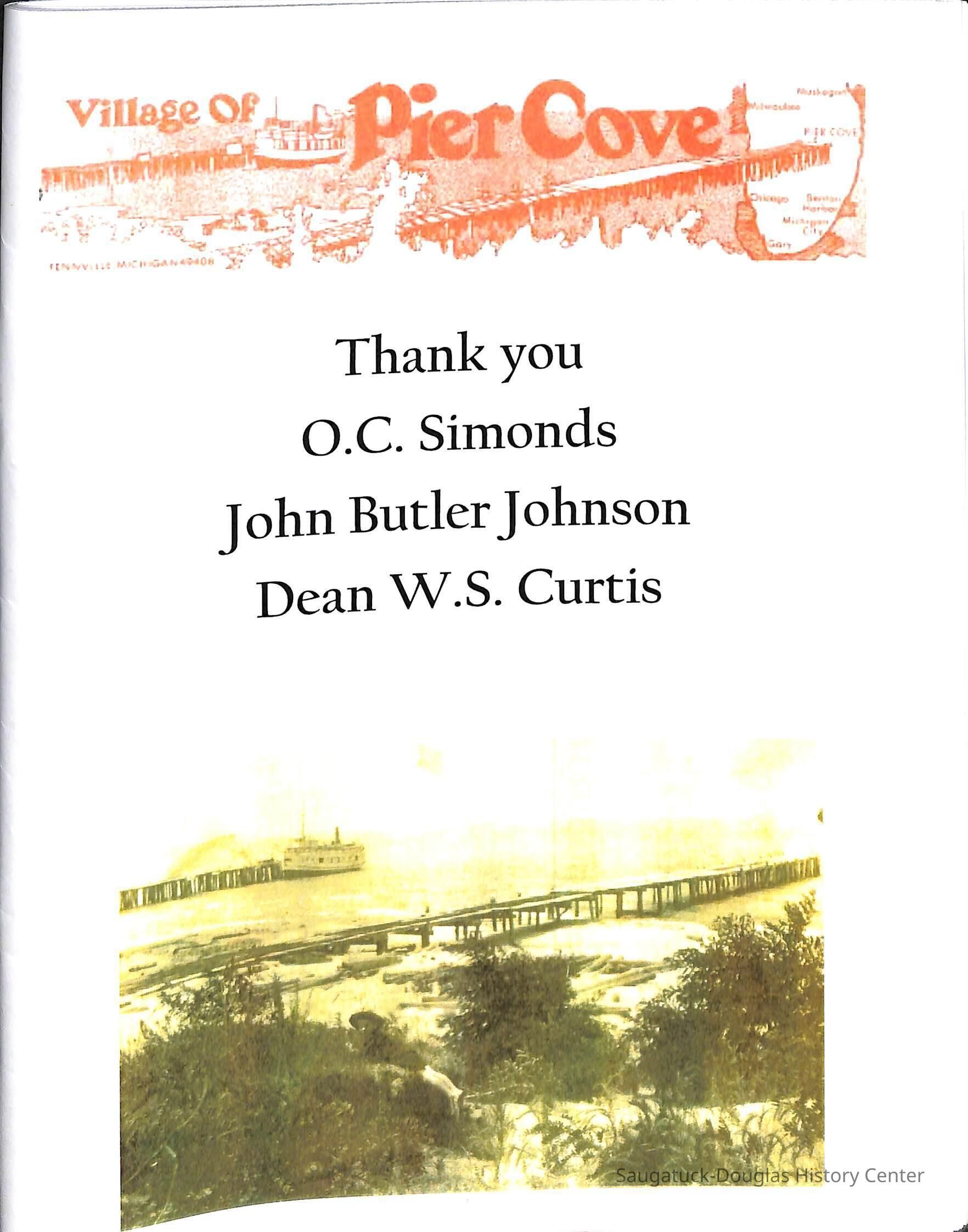 Paper and staple bound copy of a book titled "Village of Pier Cove." The book is a history of Pier Cove which was written by Betsy Foster and various members of her family. It was self published by the Foster's in 2018. The cover has an image of Pier cove from the late 19th century along with a stylized image of the same location. Along with the book's title there is also: "Thank you O.C Simonds, John Butler Johnson, Dean W.S Curtis" printed on the front. The history spans from some of the earliest records of Pier Cove in 1869 and into the 1950s. (2 copies)Cataloged By
