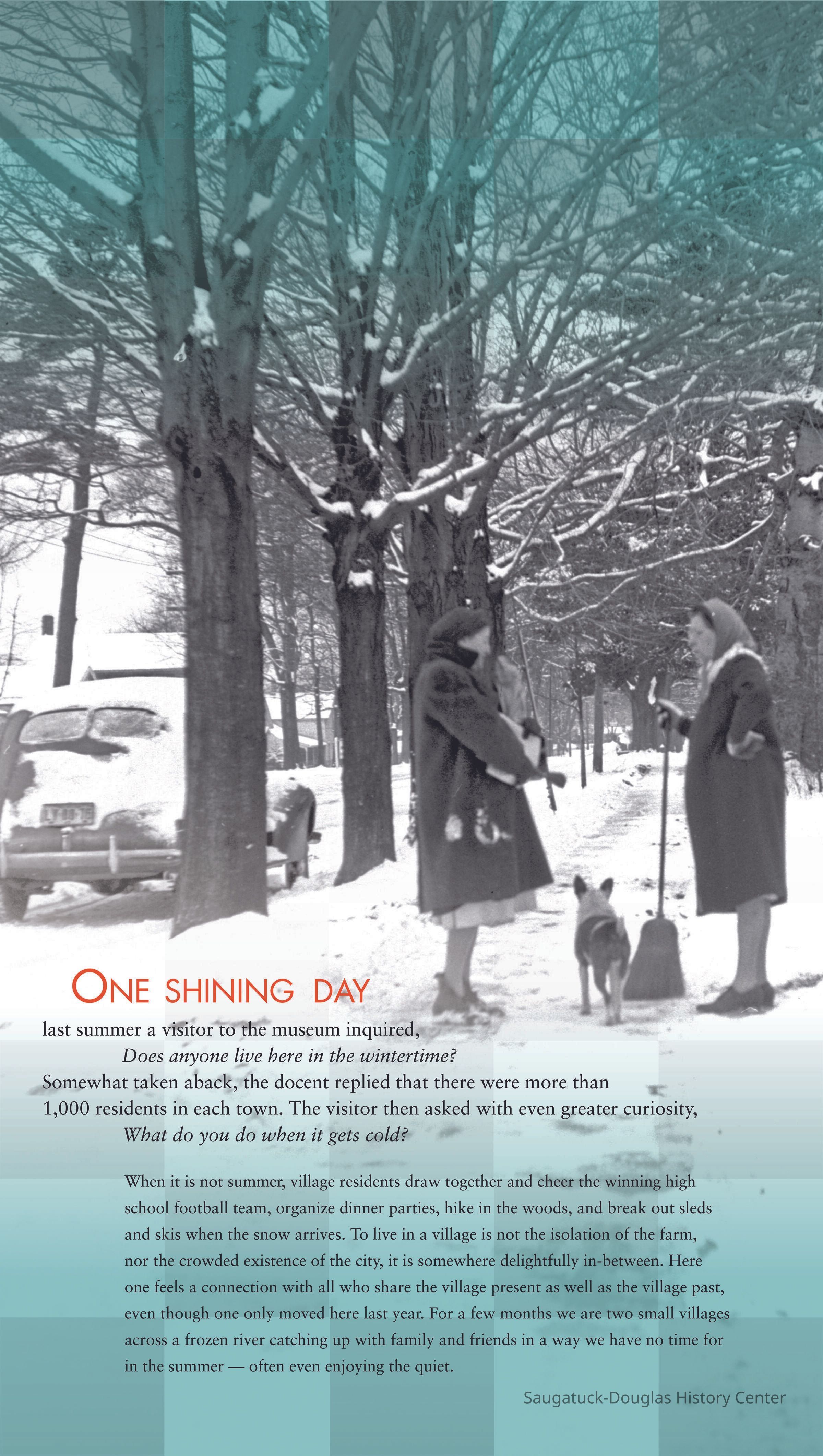 The exhibits main panels covered the founding of the villages, working at a sawmill, leisure activities, chain ferry and bridge transportation, the post office and home mail delivery, Dr. Walker and the Community Hospital, school consolidation and education, the Labor Day Bridge Walk. The side panels covered what do the names of Saugatuck and Douglas mean, population, industry and production, the longest-lasting businesses, restaurants and food, ice cream, the stoplight in Saugatuck, electrical service, highways, farmers and the first telephone company, major fires, the Kirby house as a hospital, churches, schools through the years and student statistics, and "how to small towns citizens get things done?"Collection
