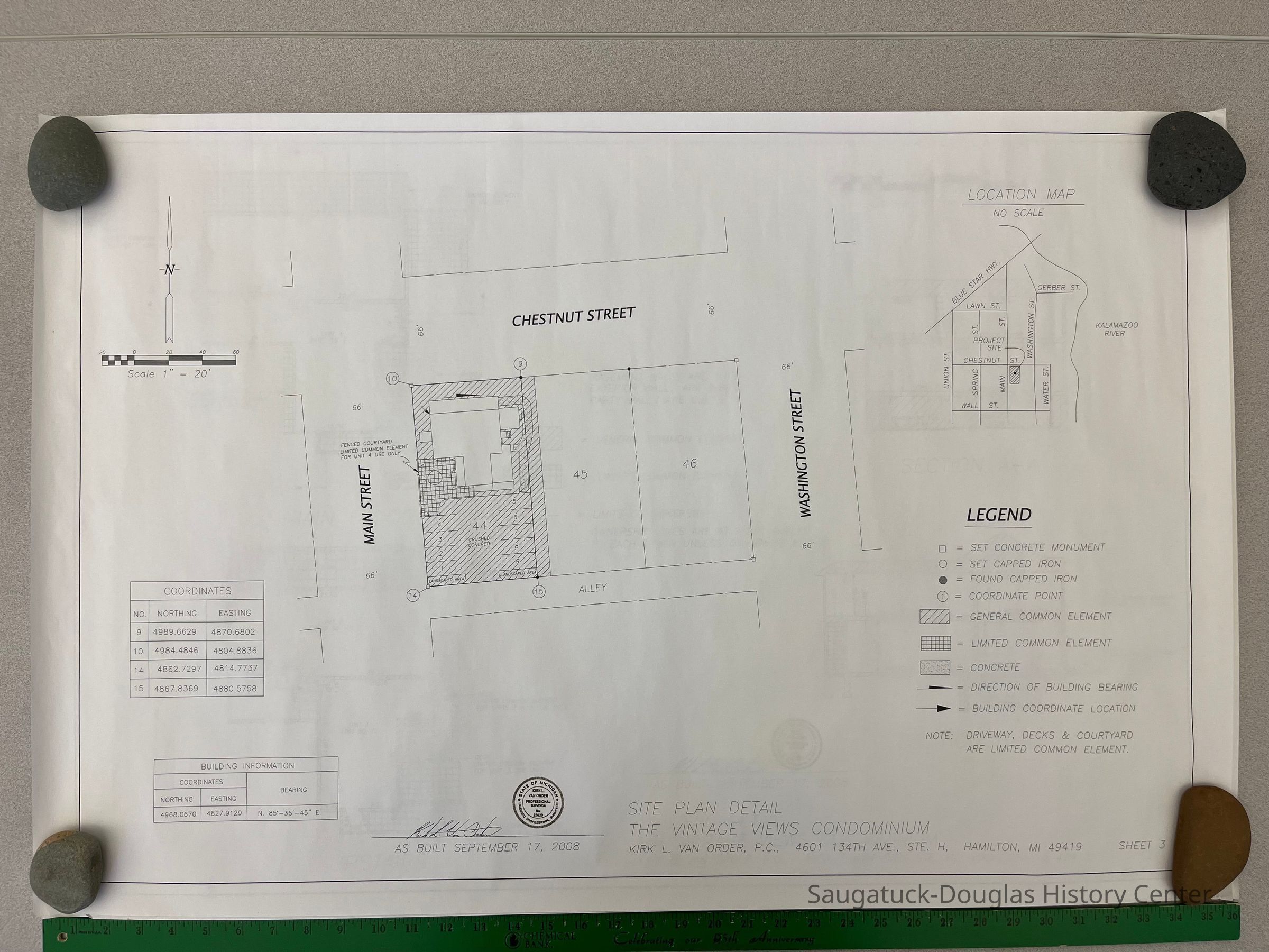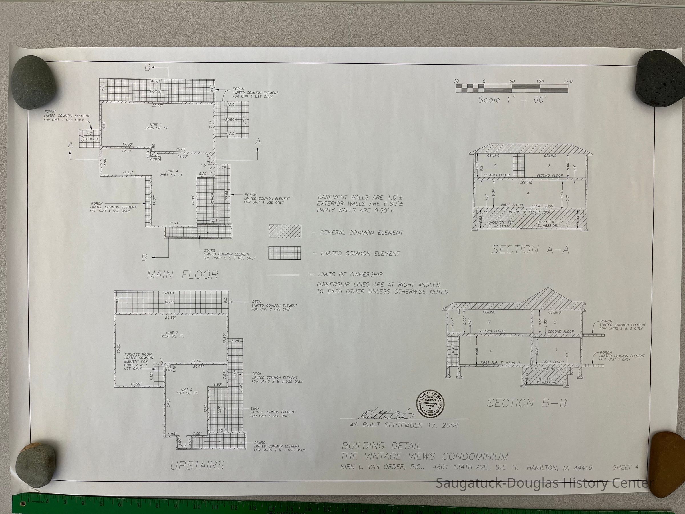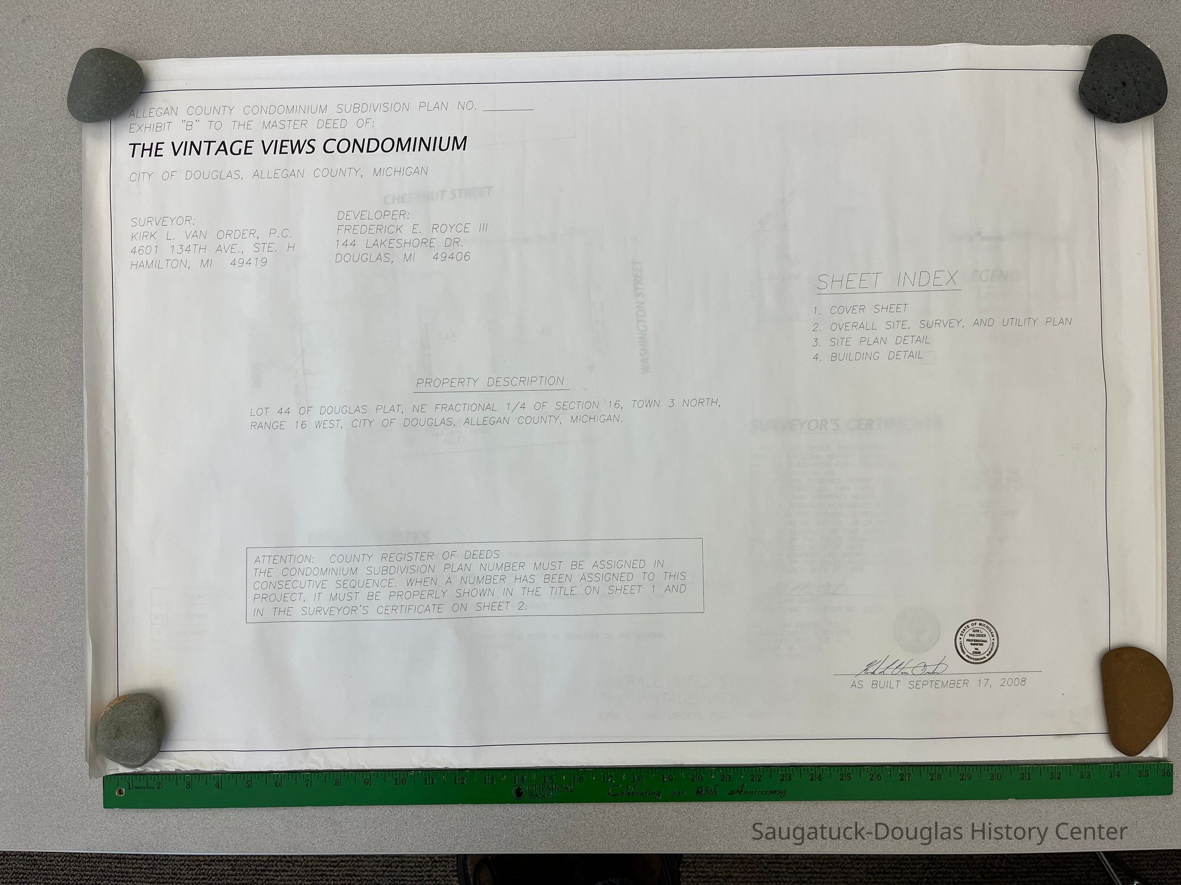 4-page plan of Vintage Views Condominium including cover sheet, overall site plan, site plan detail, and building detail. Building plans include overhead and side views of the buildings. Plans indicate that the structures were built September 17, 2008.Collection