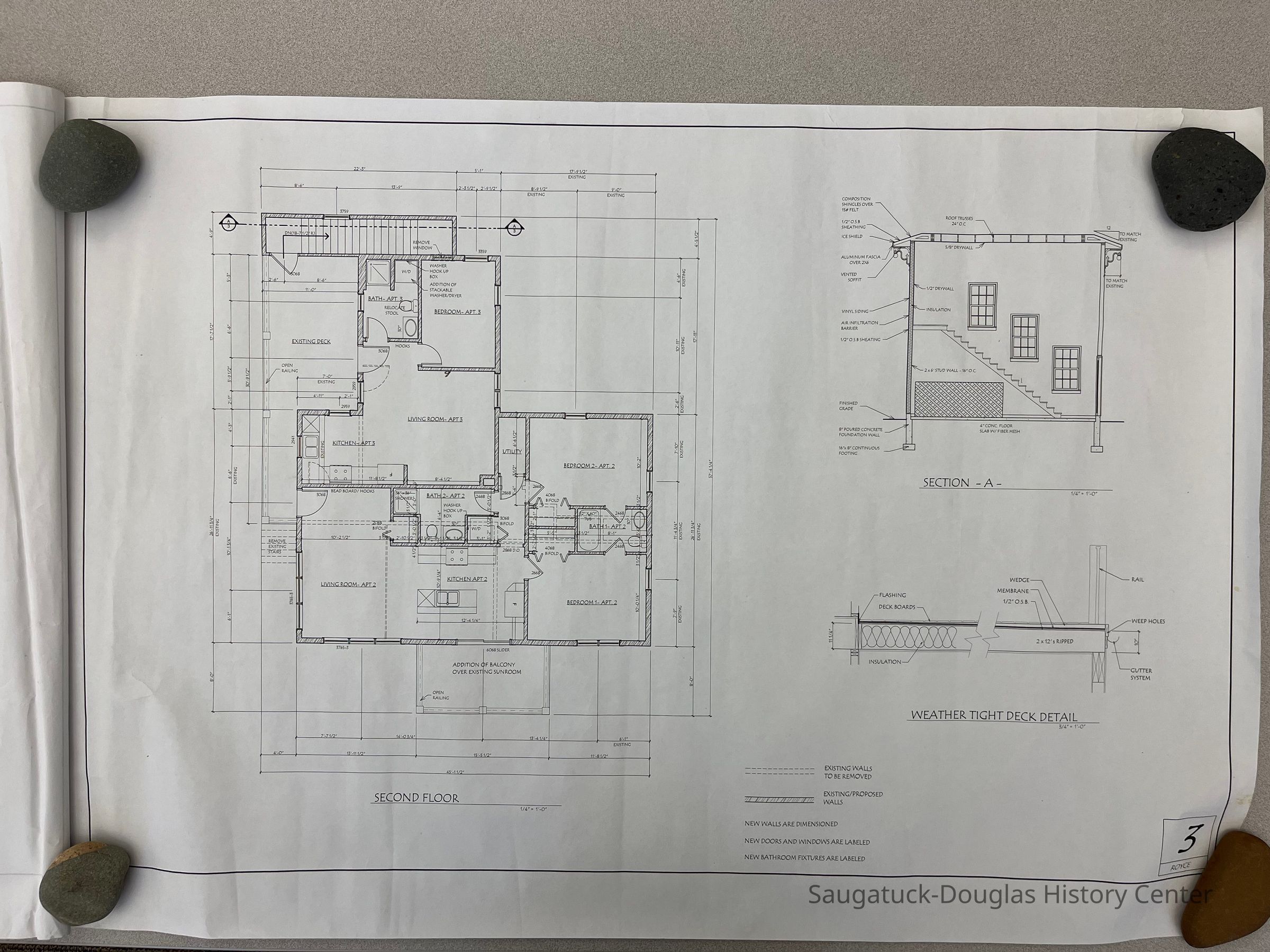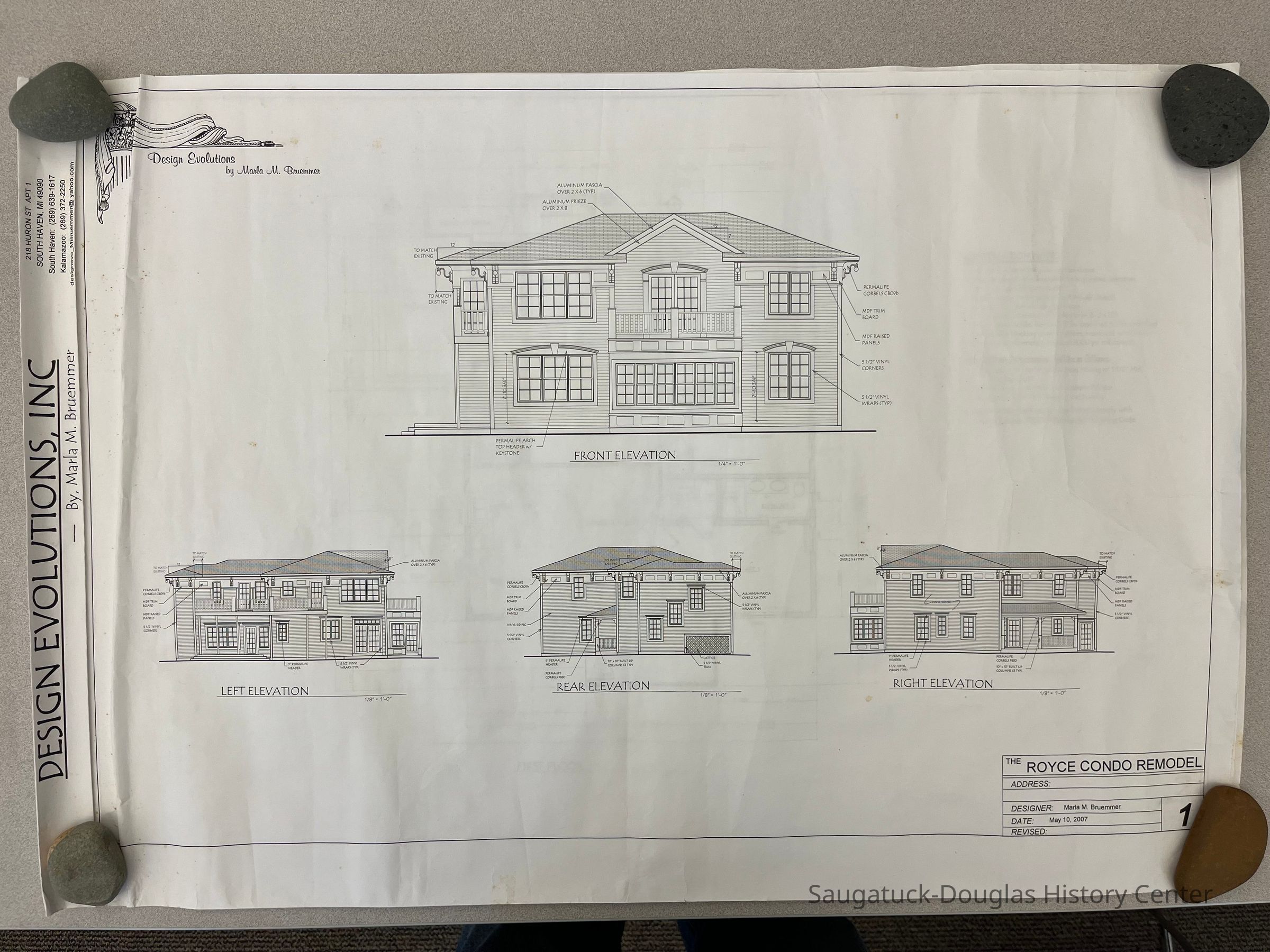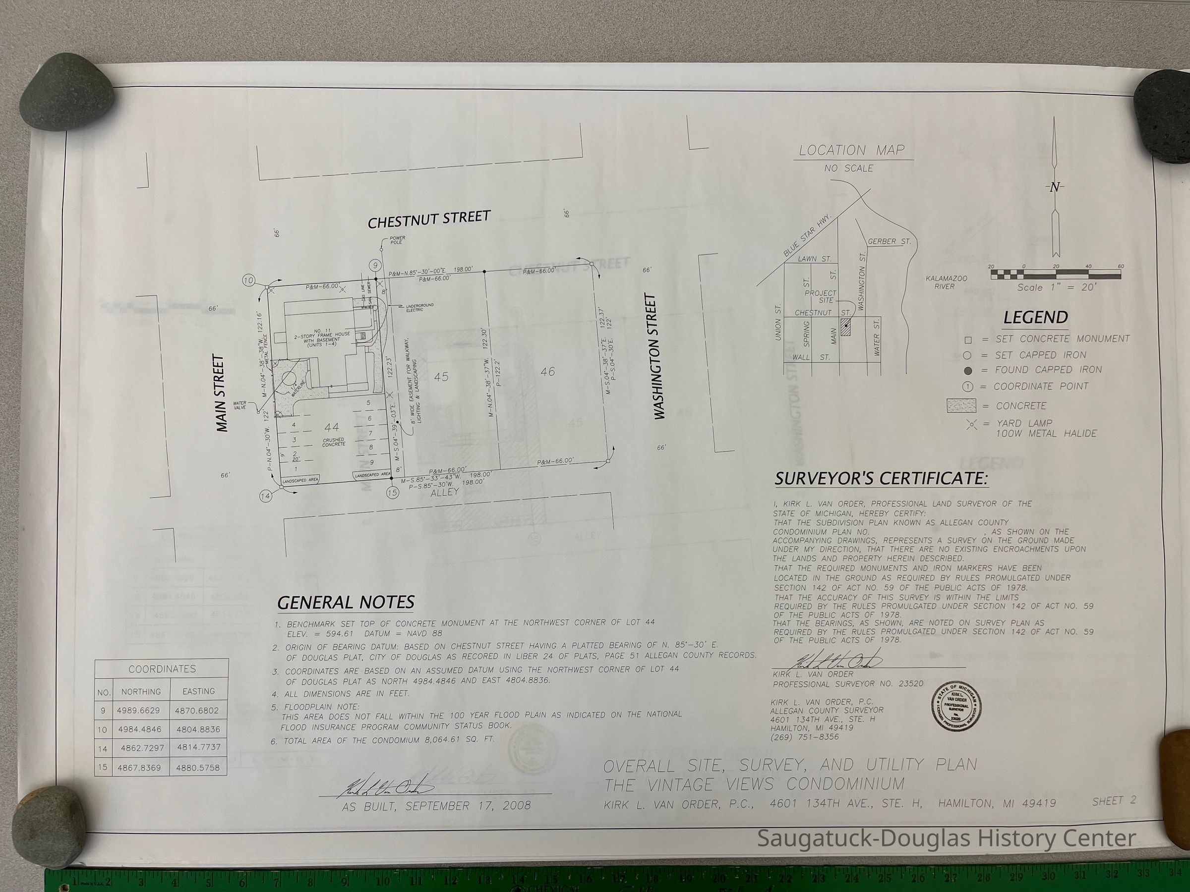 4-page plan of Vintage Views Condominium including cover sheet, overall site plan, site plan detail, and building detail. Building plans include overhead and side views of the buildings. Plans indicate that the structures were built September 17, 2008.Collection