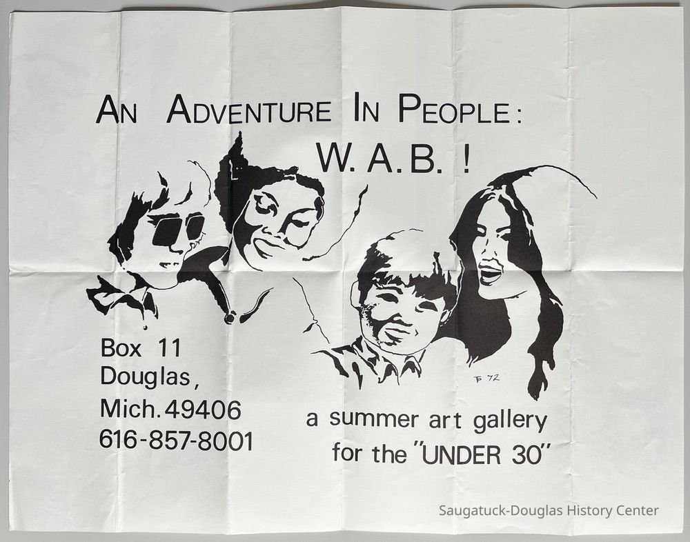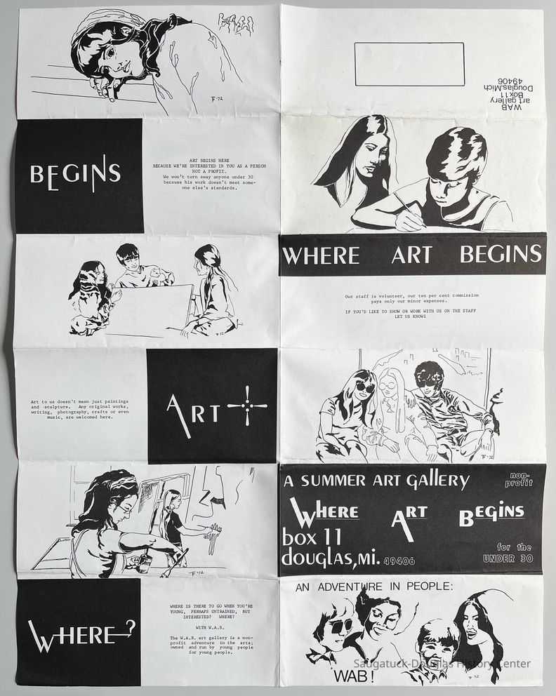 Poster/self mailer for "W.A.B. Where Art Begins," a summer art gallery for the "under 30." The poster is peppered with high contrast drawings sighed with a "To" or "Tp" monogram and " '72"