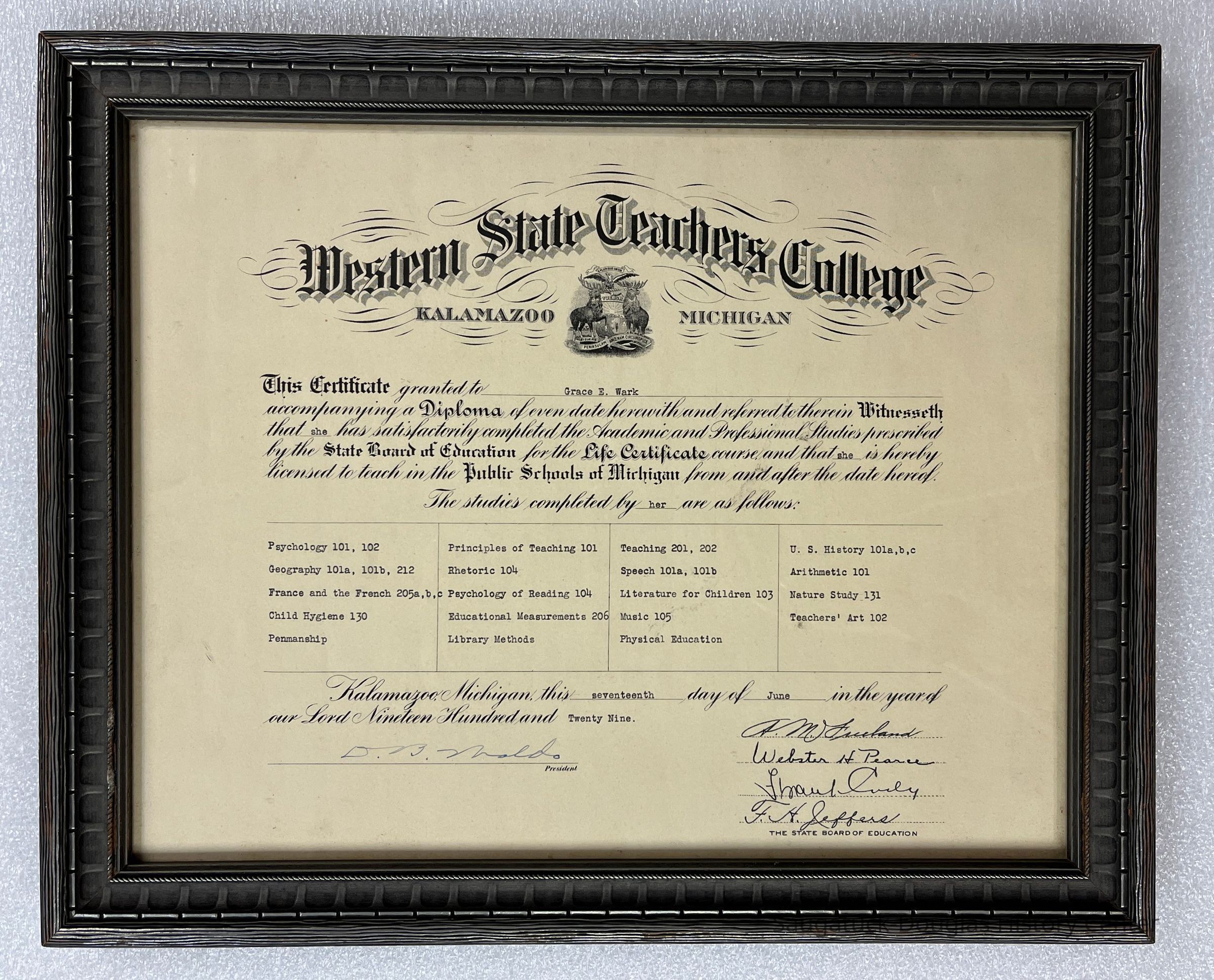 12" x 14" Graduation certificate awarded by Western State Teachers College to Grace E. WarkCollection