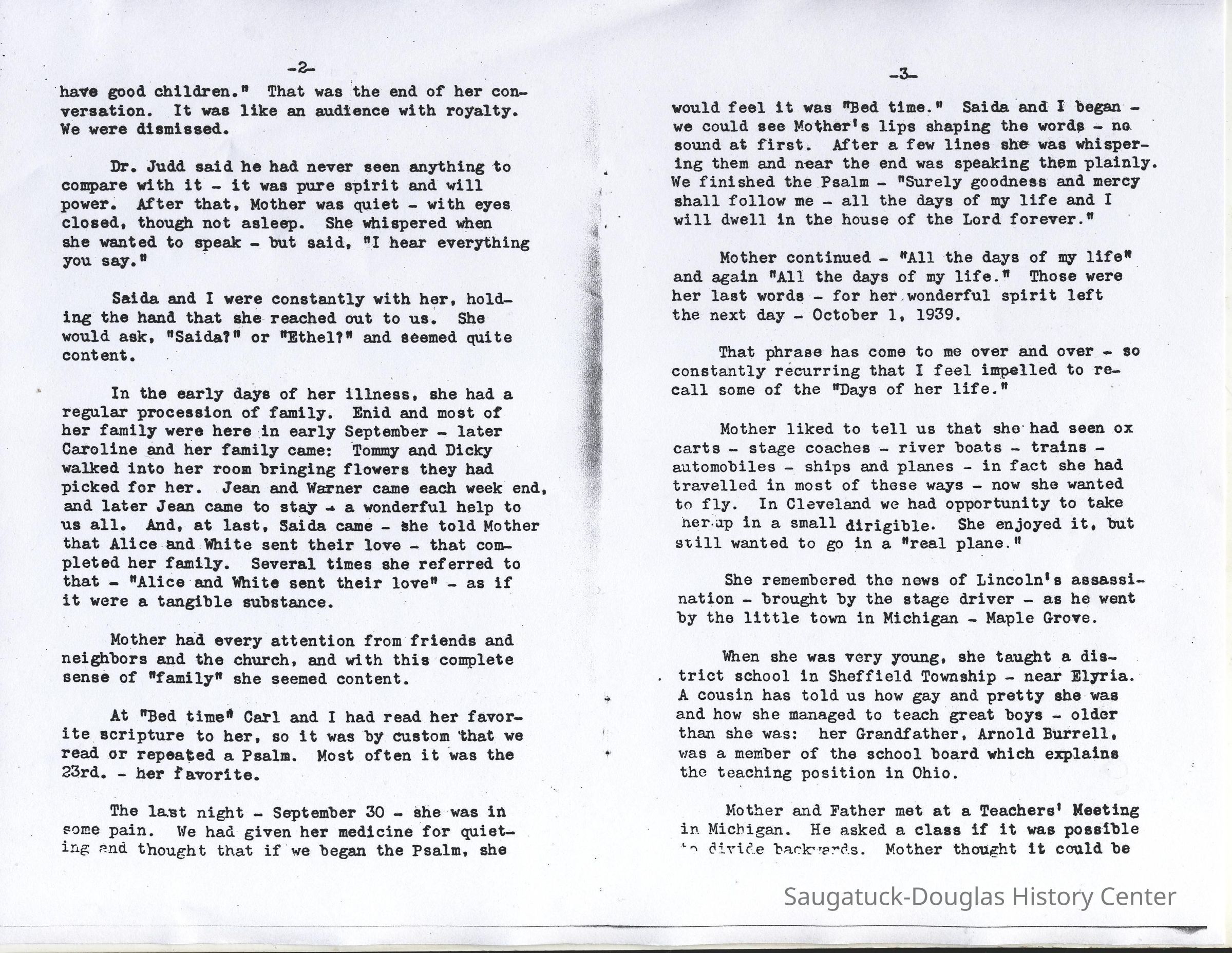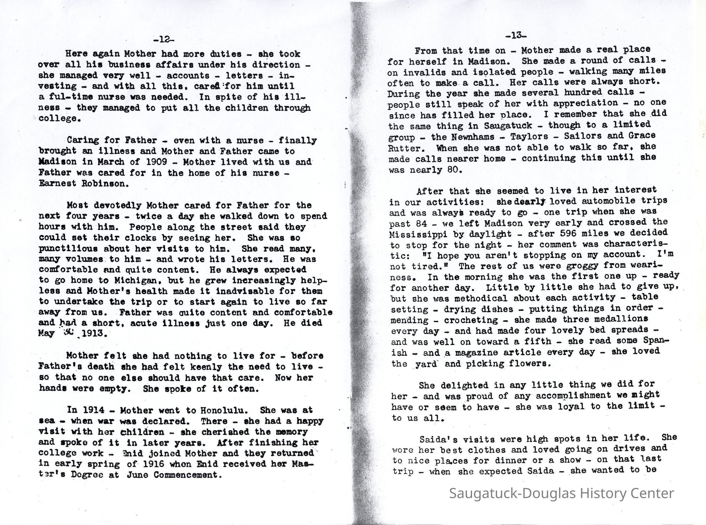 All those years of Father's strange illness (thirteen years) left us with the memory of a helpless invalid. Physically helpless he was, but with mental faculties still clear. He attended to all his business, dictating letters for Mother to write.