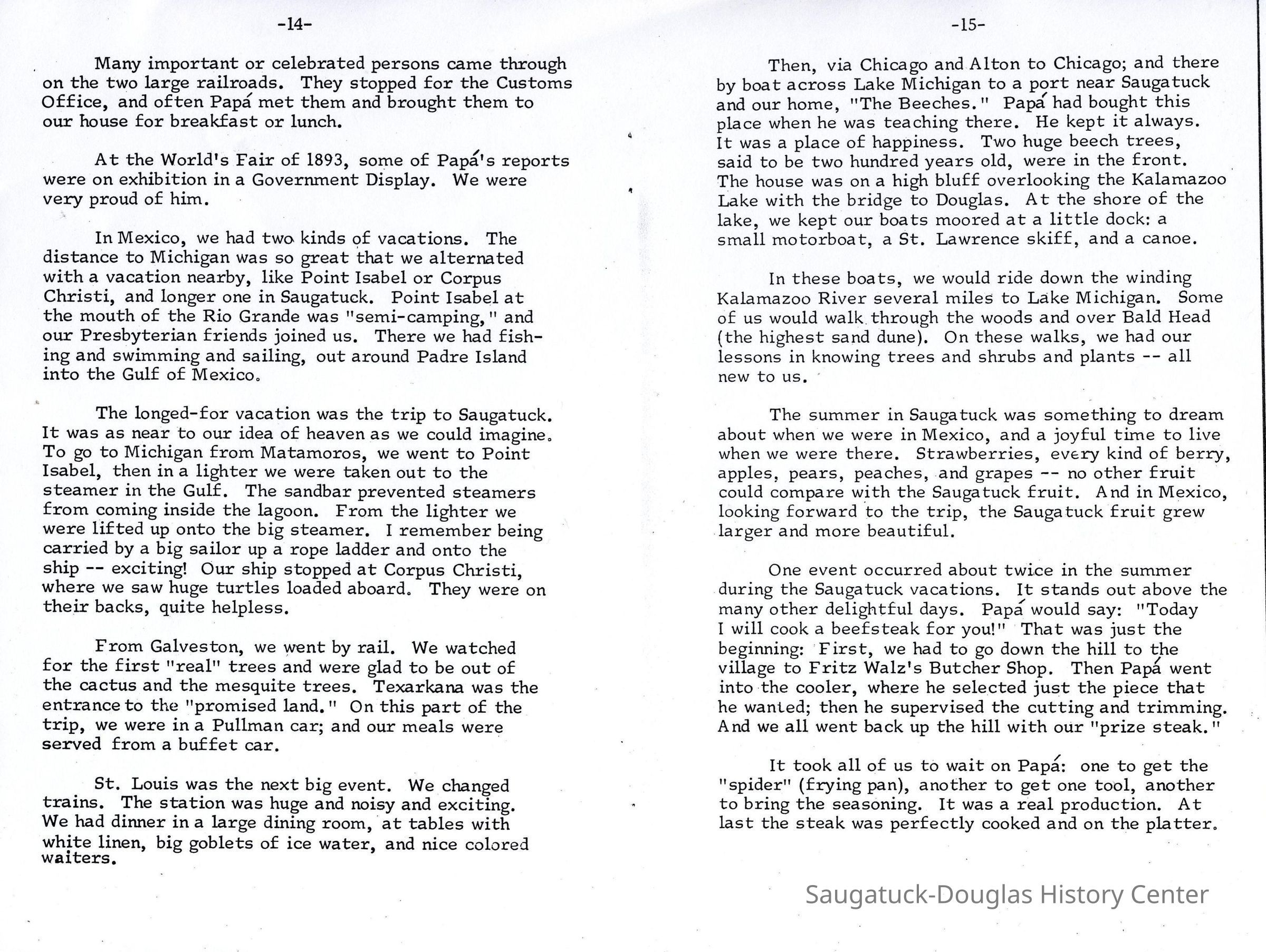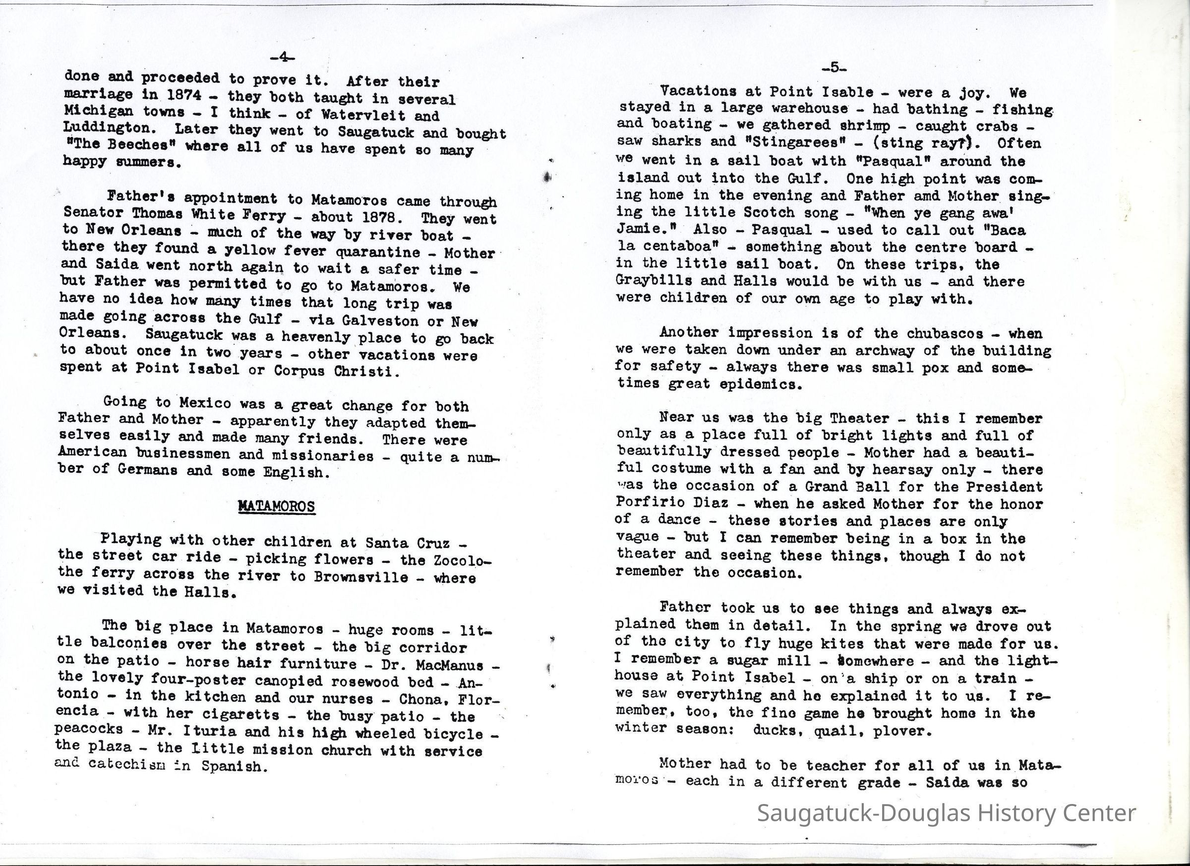 The longed-for vacation was the trip to Saugatuck. It was as near to our idea of heaven as we could imagine. To go to Michigan from Matamoros, we went to Point Isabel, then in a lighter we were taken out to the steamer in the Gulf. The sandbar prevented steamers from coming inside the lagoon. From the lighter we were lifted up onto the big steamer. I remember being carried by a big sailor up a rope ladder and onto the ship -- exciting! Our ship stopped at Corpus Christi, where we saw huge turtles loaded aboard. They were on their backs, quite helpless.