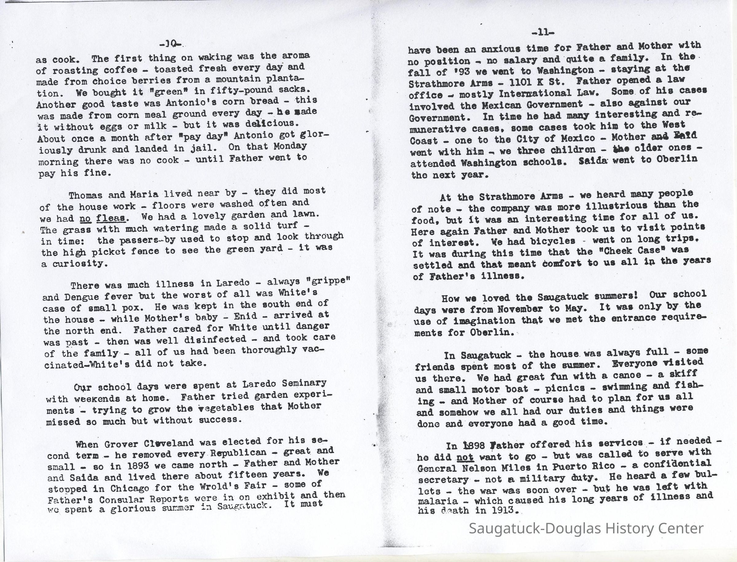 In 1893, Grover Cleveland (Democrat) removed all Republicans from appointive offices, and so that year we left Mexico and came North, Father had been Consul in Matamoros, Mexico (1878-1889), then Consul-General at Nuevo Laredo (1889-1893). After leaving Mexico, we spent the winters in Washington, D. C, and the summers in Saugatuck.
