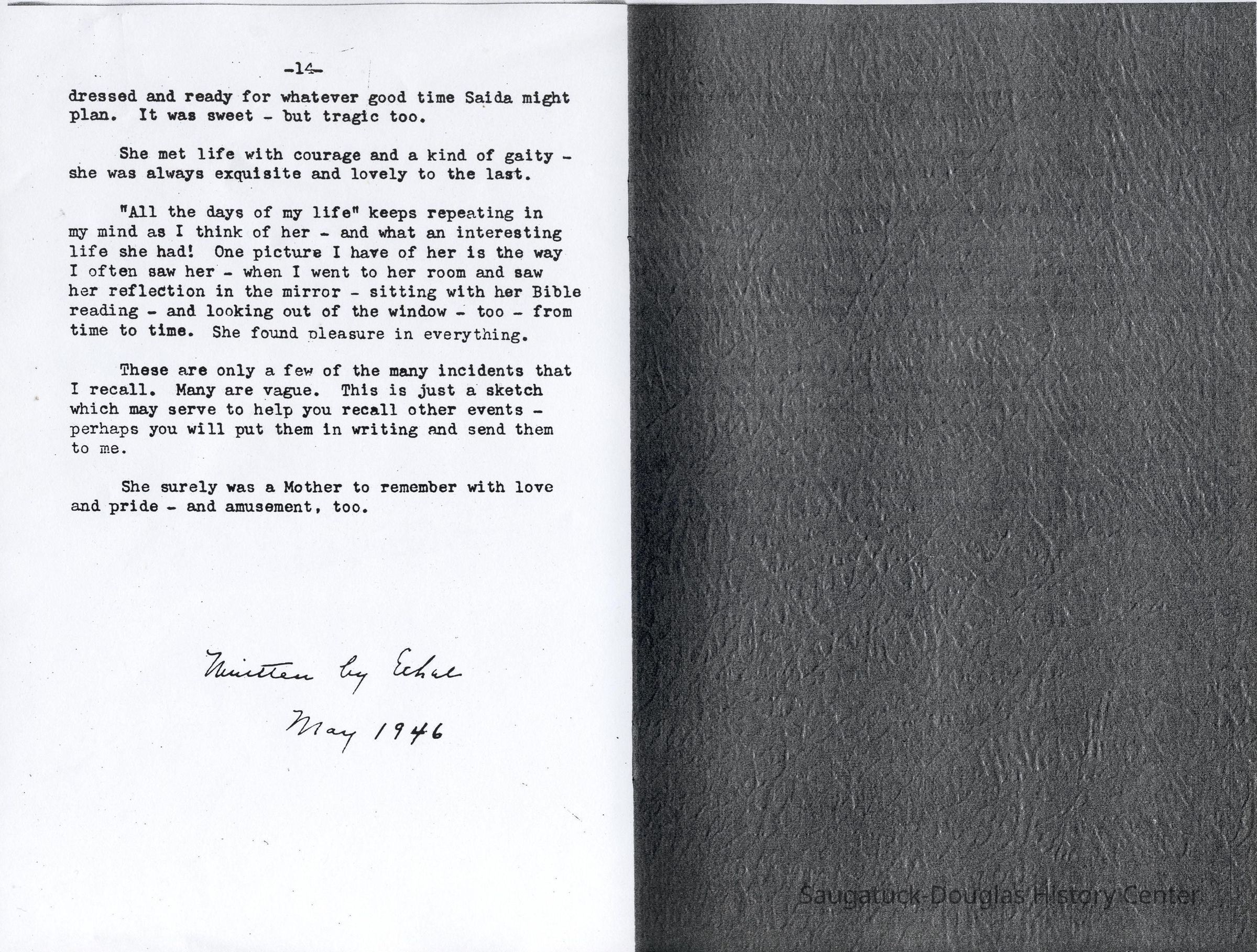 Then, via Chicago and Alton to Chicago; and there by boat across Lake Michigan to a port near Saugatuck and our home, "The Beeches. " Papa had bought this place when he was teaching there. He kept it always. It was a place of happiness. Two huge beech trees, said to be two hundred years old, were in the front.