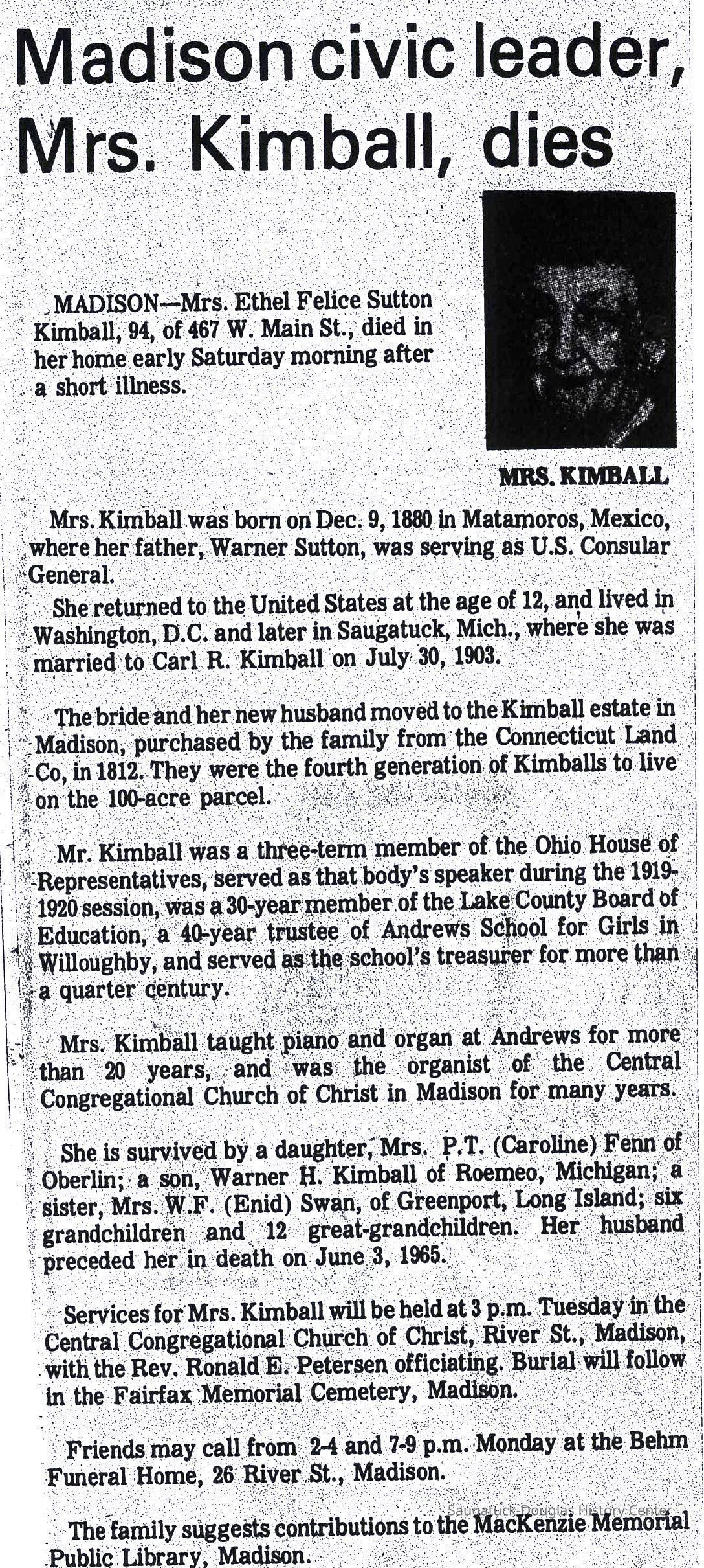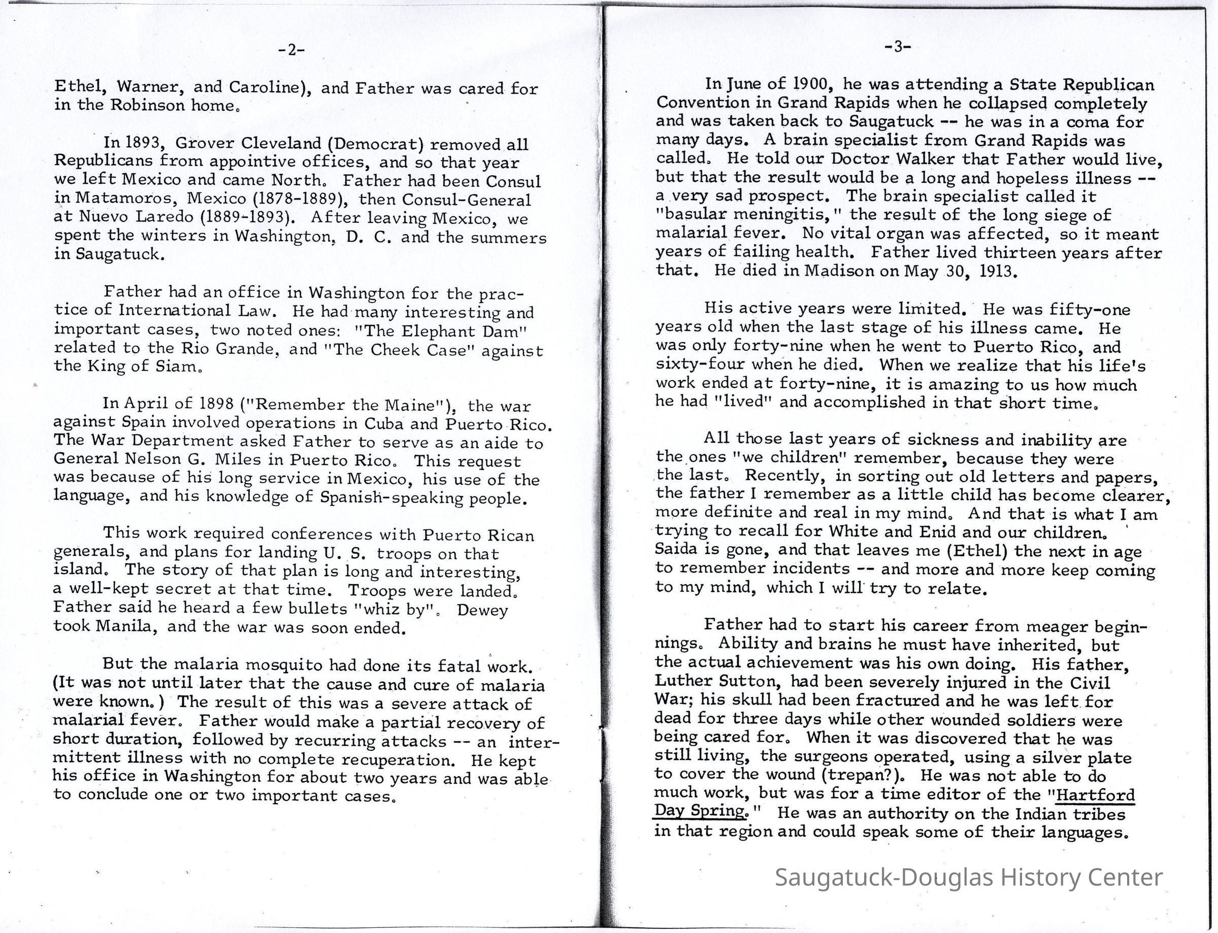 In June of 1900, he was attending a State Republican Convention in Grand Rapids when he collapsed completely and was taken back to Saugatuck -- he was in a coma for many days. A brain specialist from Grand Rapids was called, He told our Doctor Walker that Father would live, but that the result would be a long and hopeless illness -a very sad prospect. The brain specialist called it "basular meningitis," the result of the long siege of malarial fever. No vital organ was affected, so it meant years of failing health. Father lived thirteen years after that. He died in Madison on May 30, 1913,