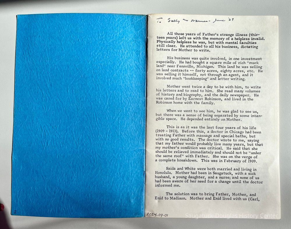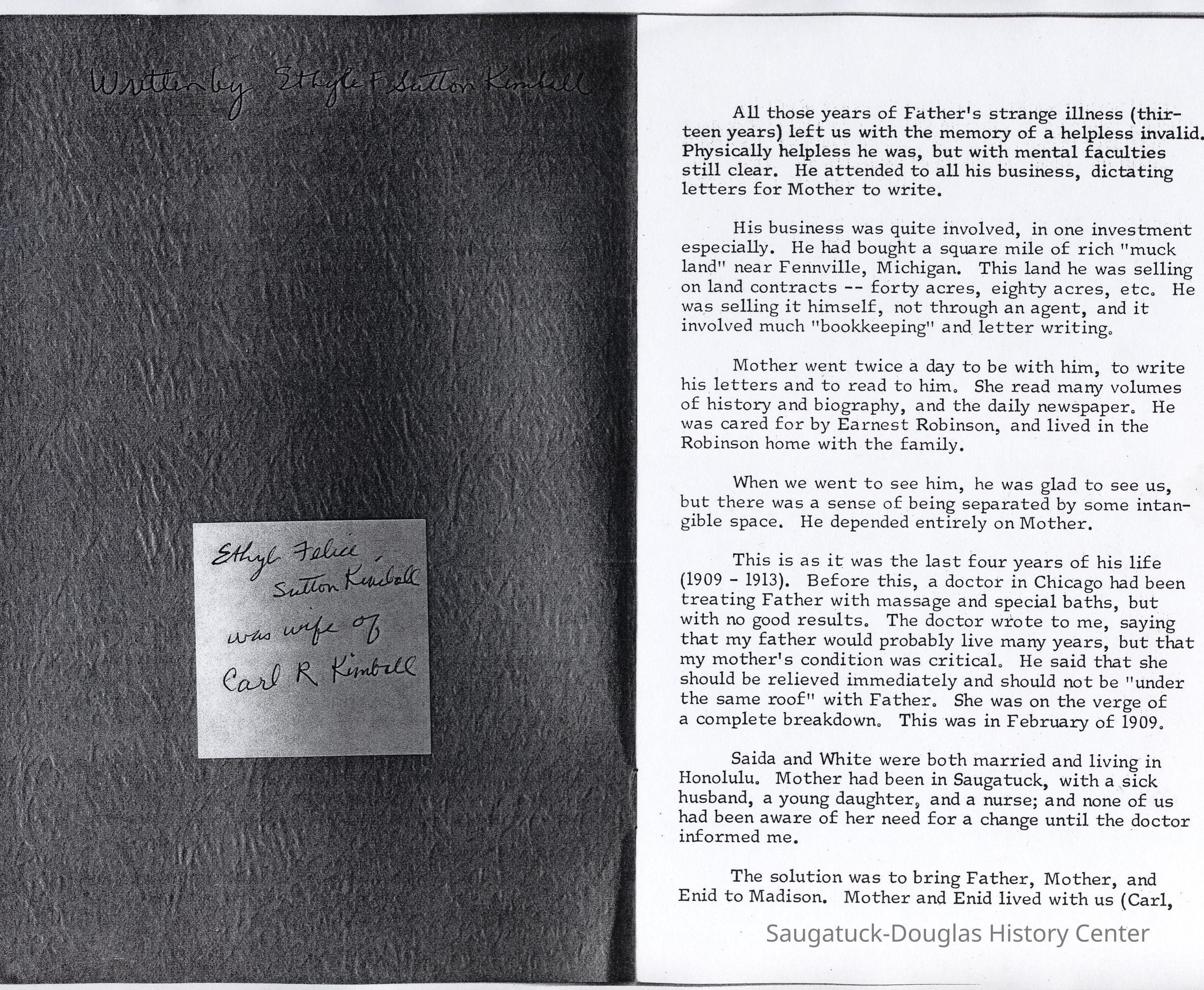 His business was quite involved, in one investment especially. He had bought a square mile of rich "muck land" near Fennville, Michigan. This land he was selling on land contracts -- forty acres, eighty acres, etc, He was selling it himself, not through an agent, and it involved much "bookkeeping" and letter writing.
