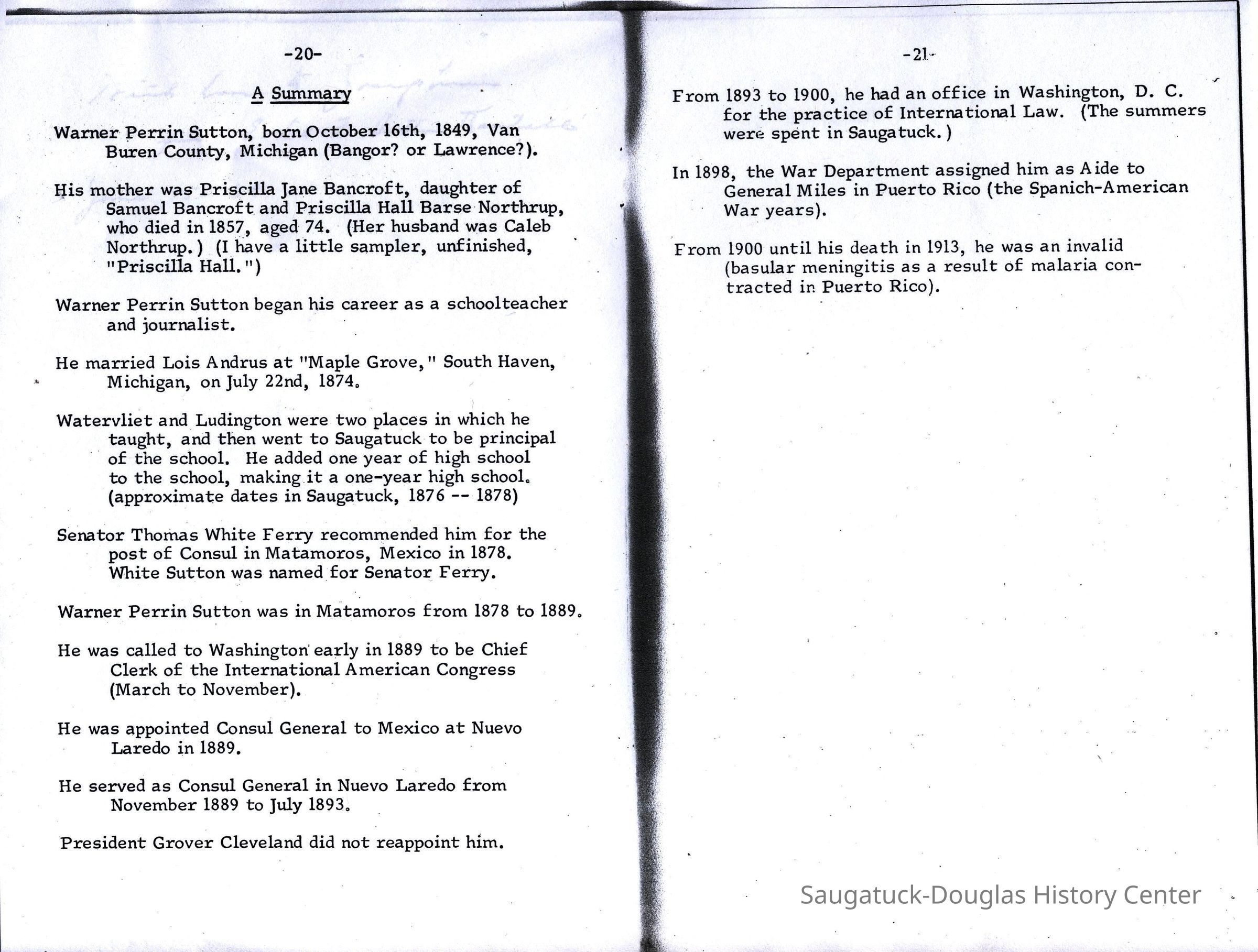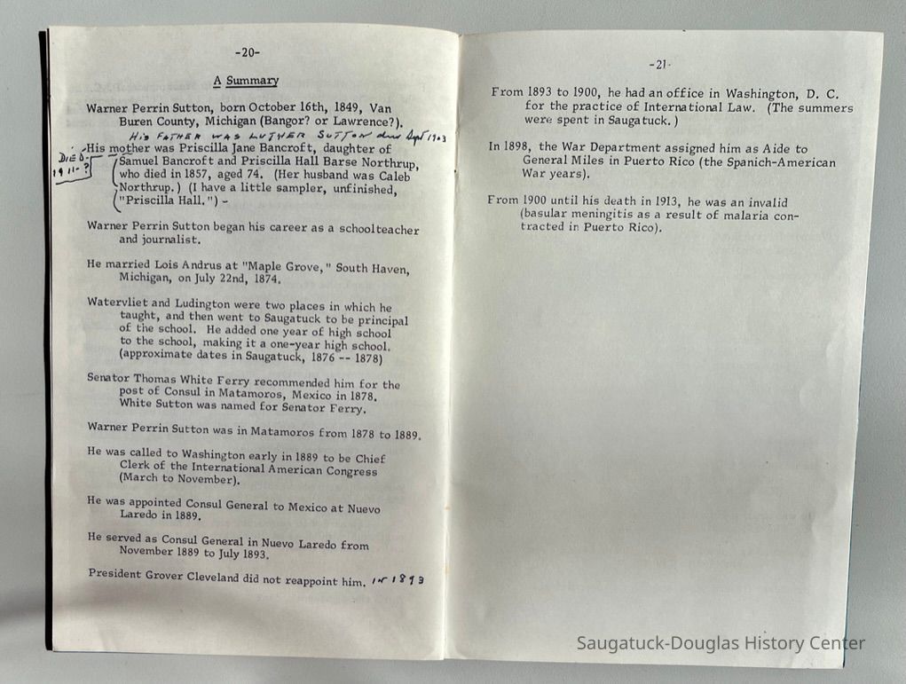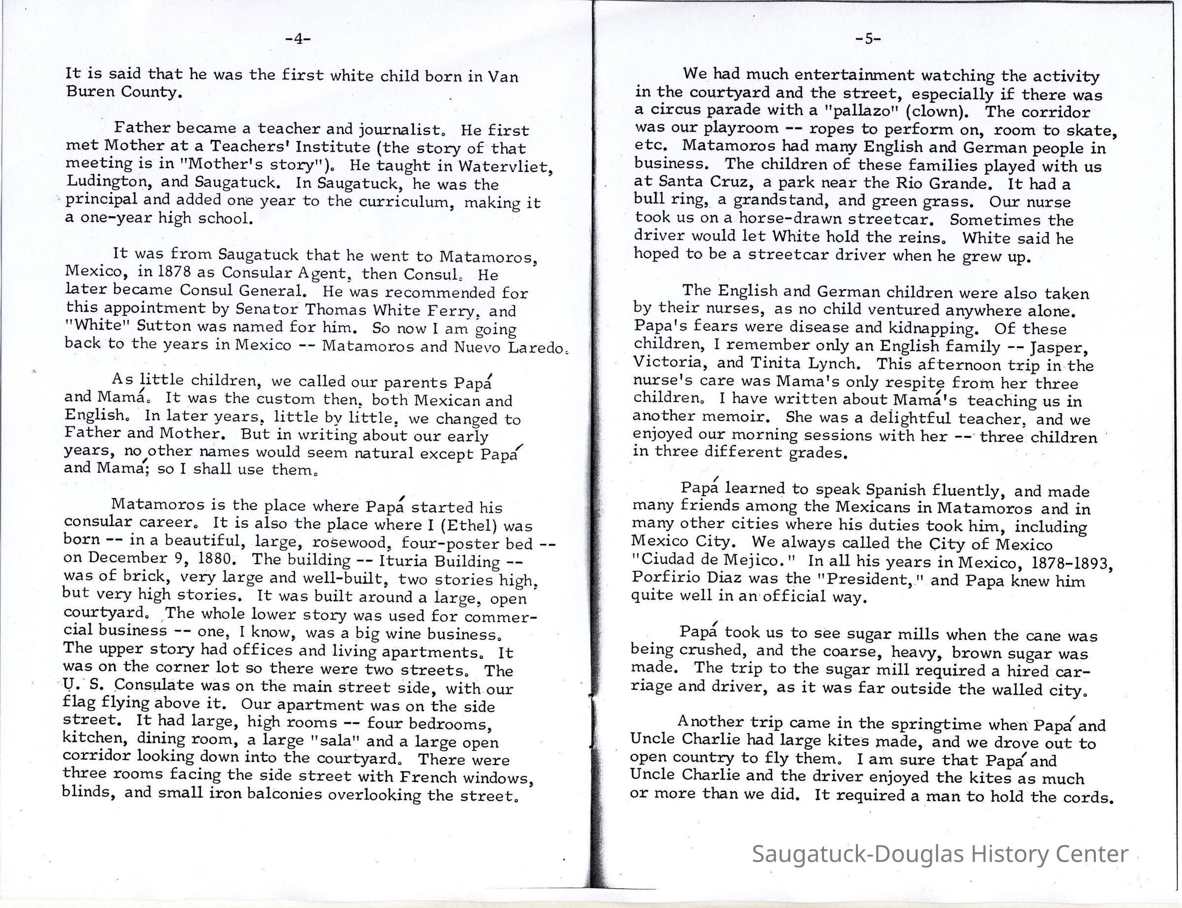 It was from Saugatuck that he went to Matamoros, Mexico, in 1878 as Consular Agent, then Consul. He later became Consul General. He was recommended for this appointment by Senator Thomas White Ferry, and "White" Sutton was named for him. So now I am going back to the years in Mexico -- Matamoros and Nuevo Laredo
