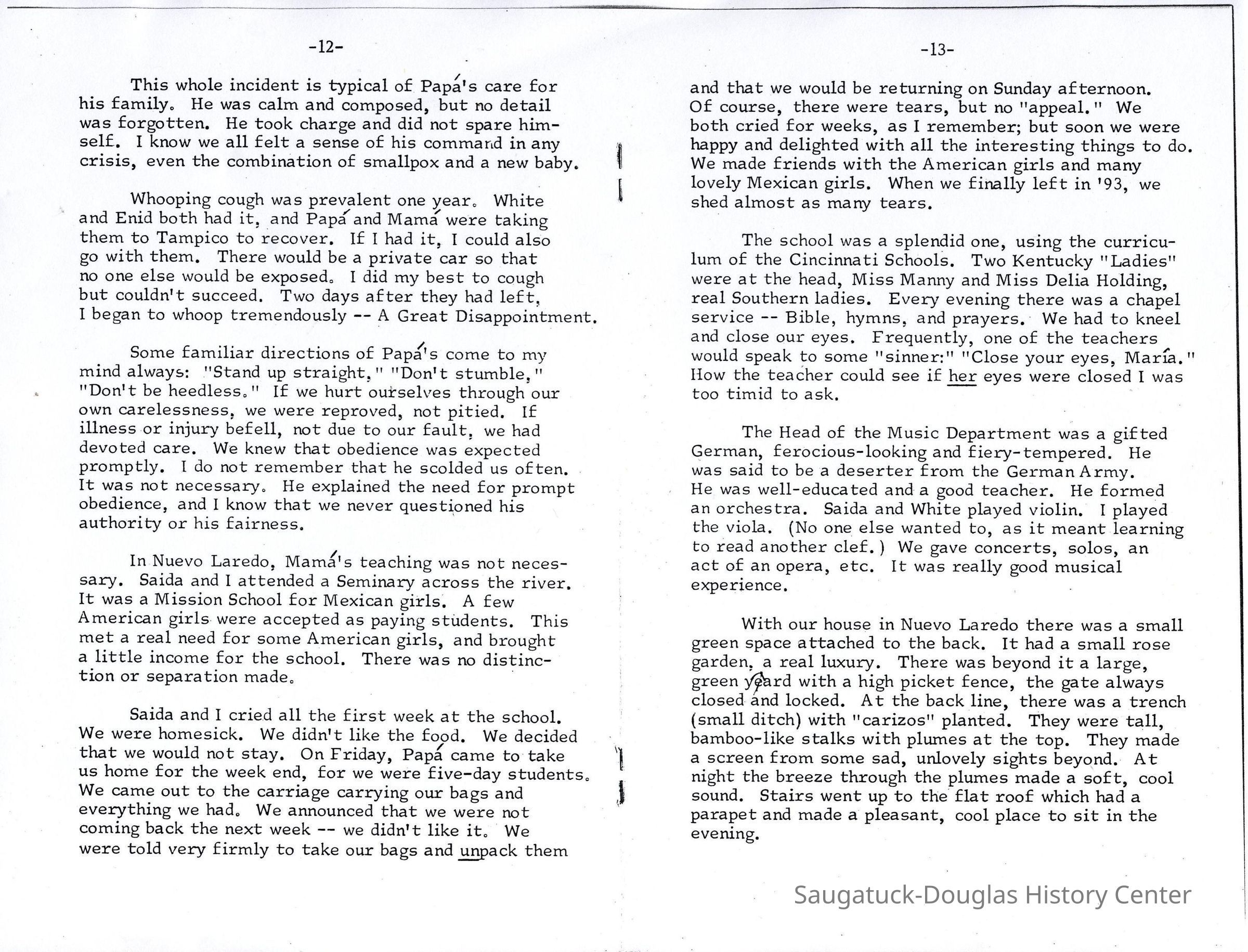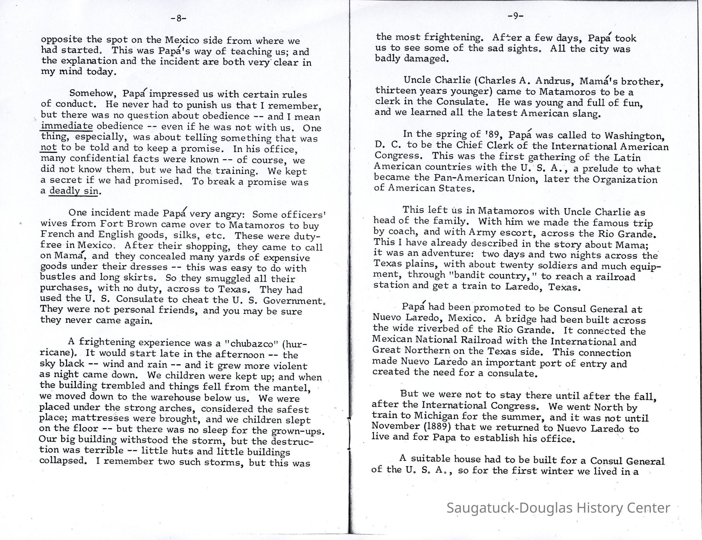But we were not to stay there until after the fall, after the International Congress. We went North by train to Michigan for the summer, and it was not until November (1889) that we returned to Nuevo Laredo to live and for Papa to establish his office.