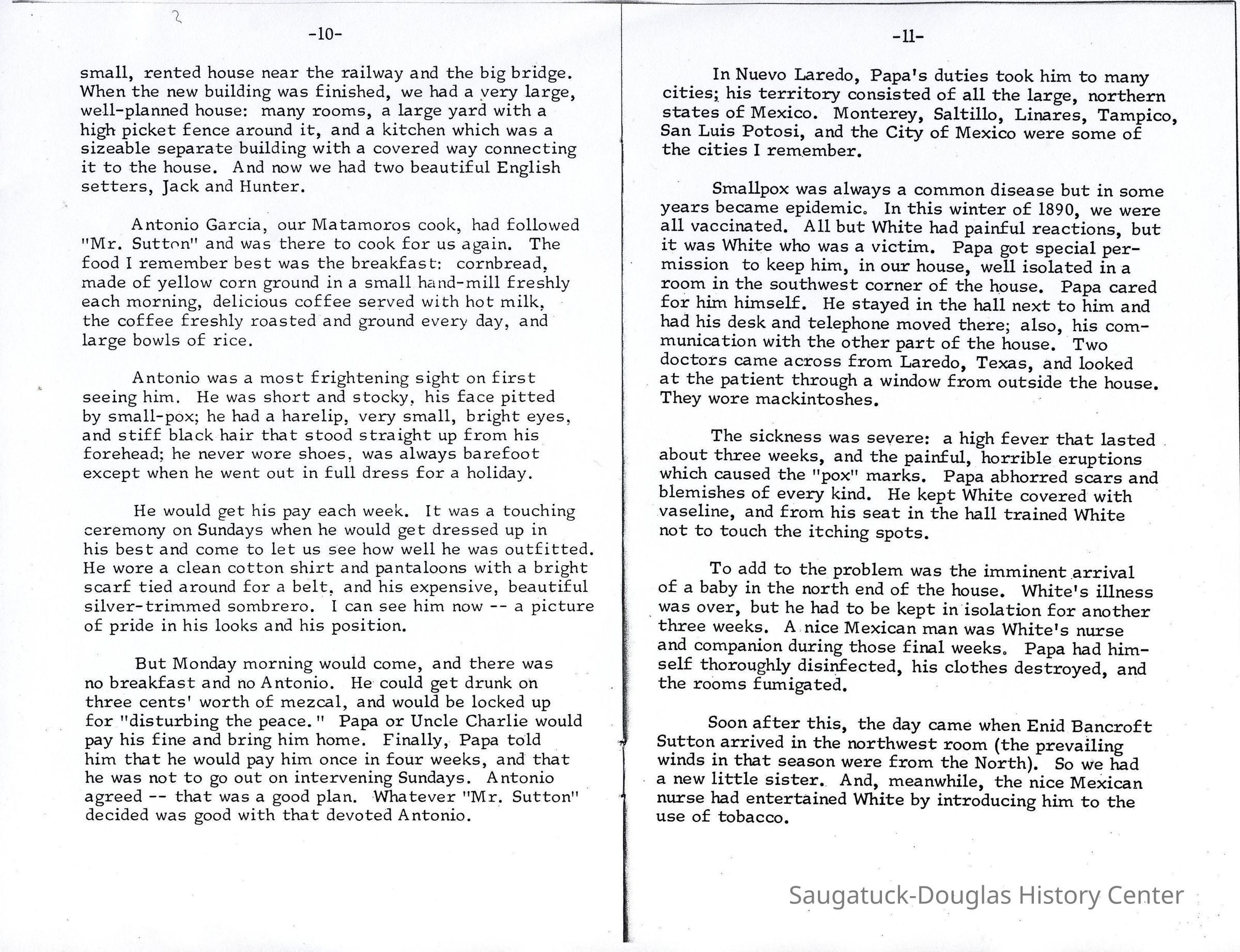 Smallpox was always a common disease but in some years became epidemic. In this winter of 1890, we were all vaccinated. All but White had painful reactions, but it was White who was a victim. Papa got special permission to keep him, in our house, well isolated in a room in the southwest corner of the house. Papa cared for him himself. He stayed in the hall next to him and had his desk and telephone moved there; also, his communication with the other part of the house. Two doctors came across from Laredo, Texas, and looked at the patient through a window from outside the house. They wore mackintoshes.