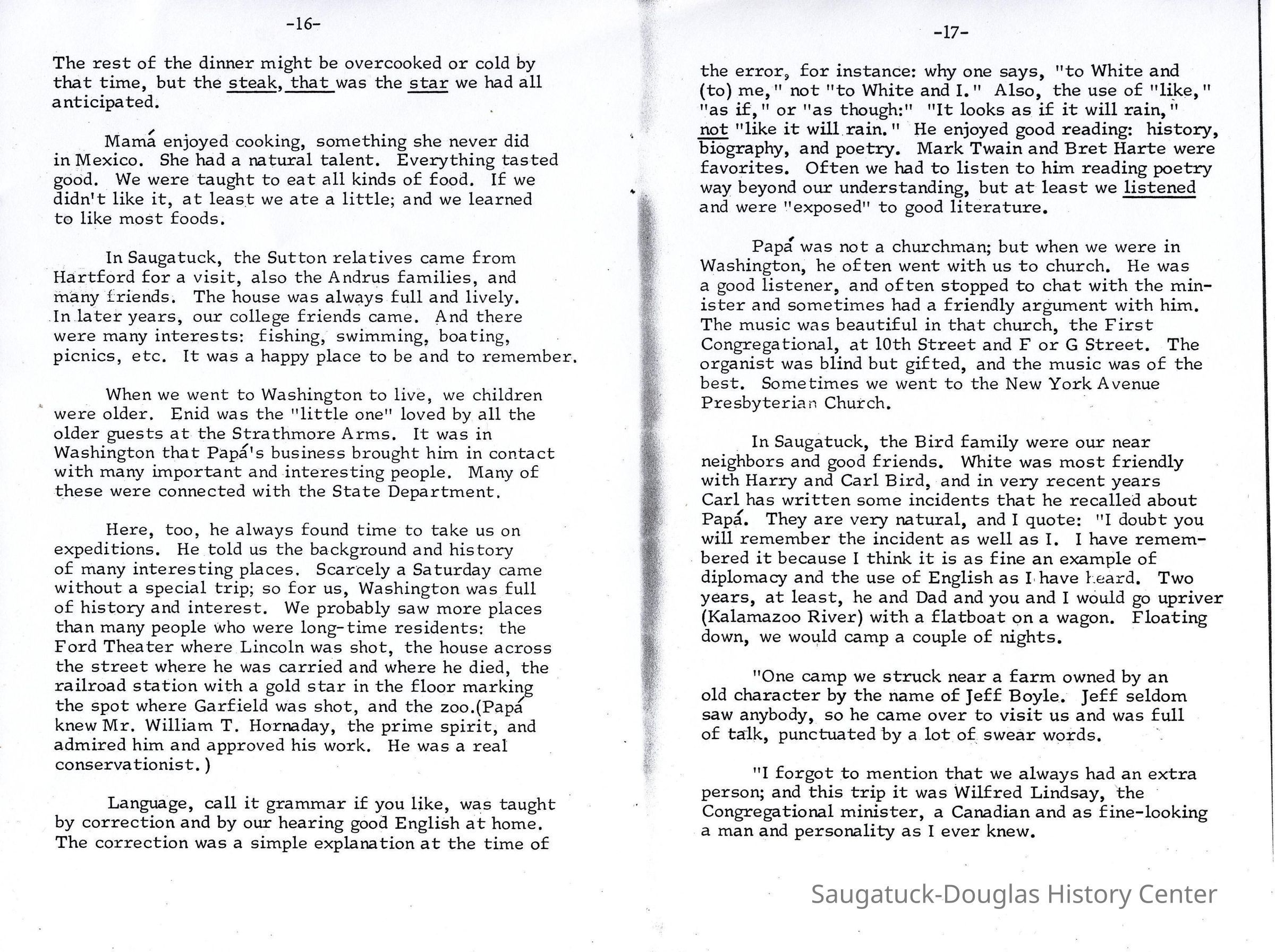 Here, too, he always found time to take us on expeditions. He told us the background and history of many interesting places. Scarcely a Saturday came without a special trip; so for us, Washington was full of history and interest. We probably saw more places than many people who were long-time residents: the Ford Theater where Lincoln was shot, the house across the street where he was carried and where he died, the railroad station with a gold star in the floor marking the spot where Garfield was shot, and the zoo. (Papa knew Mr. William T. Hornaday, the prime spirit, and admired him and approved his work. He was a real conservationist.