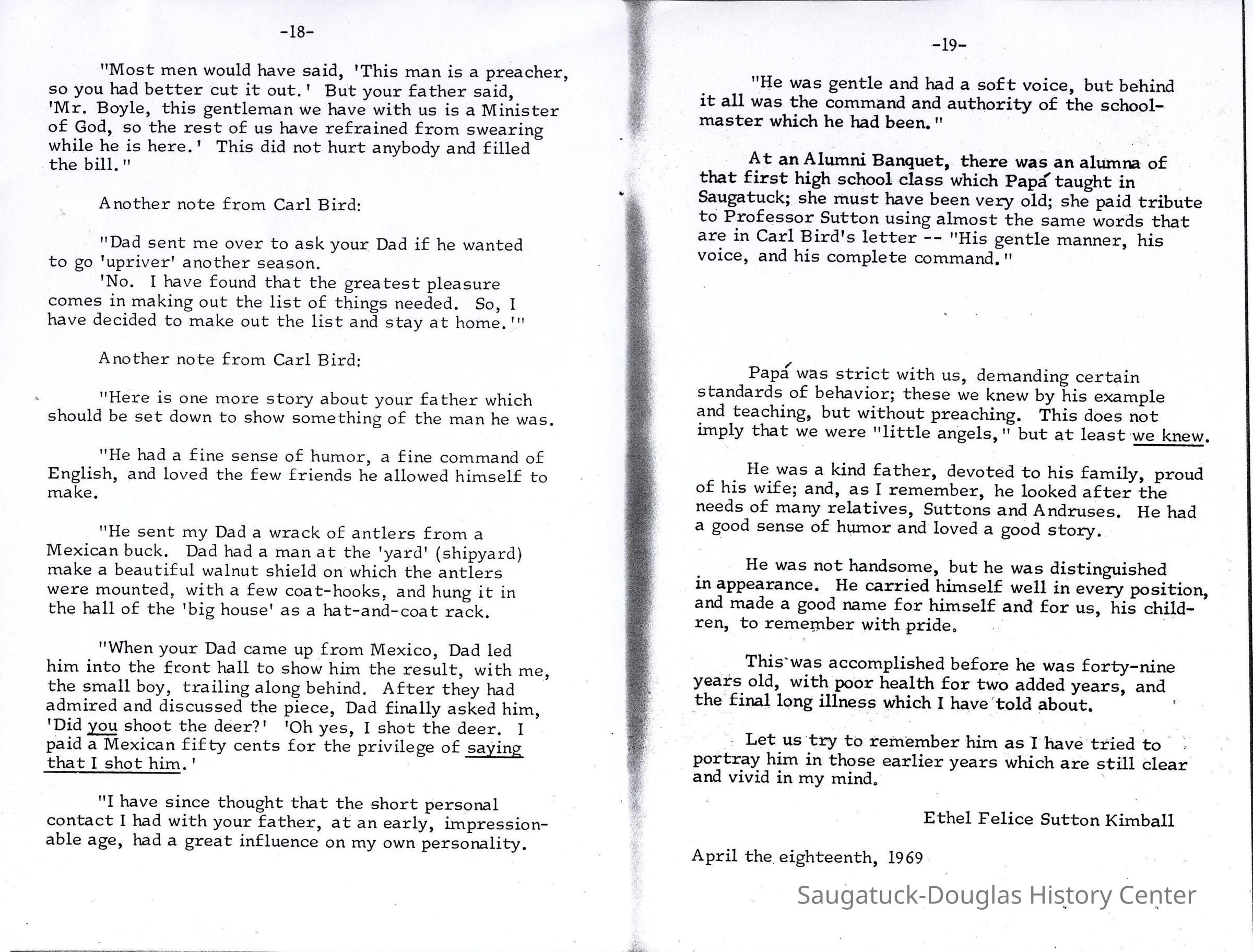 Father had to start his career from meager beginnings. Ability and brains he must have inherited, but the actual achievement was his own doing. His father, Luther Sutton, had been severely injured in the Civil War; his skull had been fractured and he was left for dead for three days while other wounded soldiers were being cared for, When it was discovered that he was still living, the surgeons operated, using a silver plate to cover the wound (trepan?), He was not able to do much work, but was for a time editor of the "Hartford Day Spring, " He was an authority on the Indian tribes in that region and could speak some of their languages.