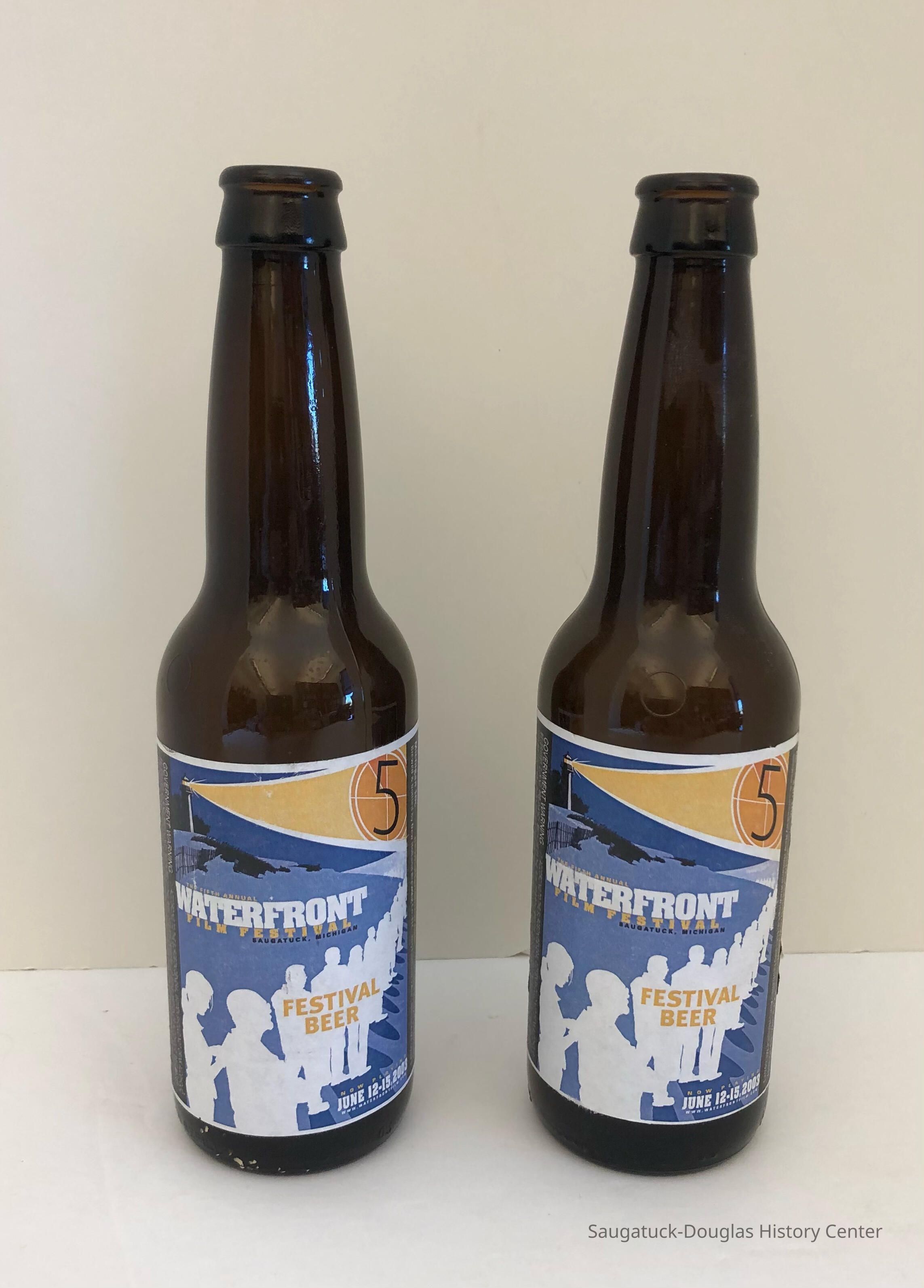 Two brown glass beer bottles with custom labels for the 2003 Waterfront Film Festival.Context