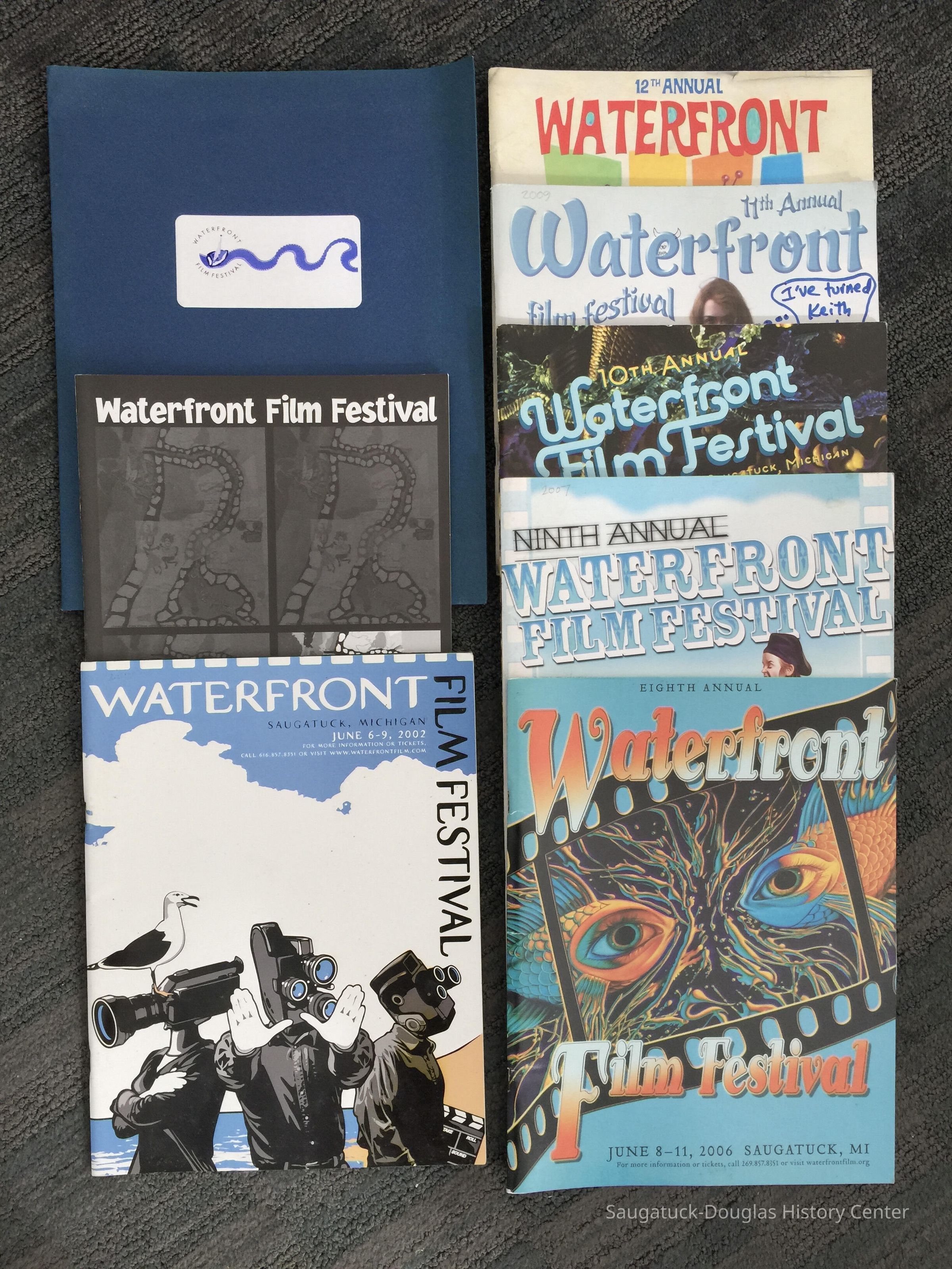 8.5x11" programs from the 1999 (in folder) and the 2002 through 2010 festivals. These 40+ page guides include intro letters from local government officials and festival founders, sponsor acknowledgement, schedule of events, details about galas, lists of programs, short programs, documentaries, local filmmaker showcase, seminars and pages of ads from local businesses.