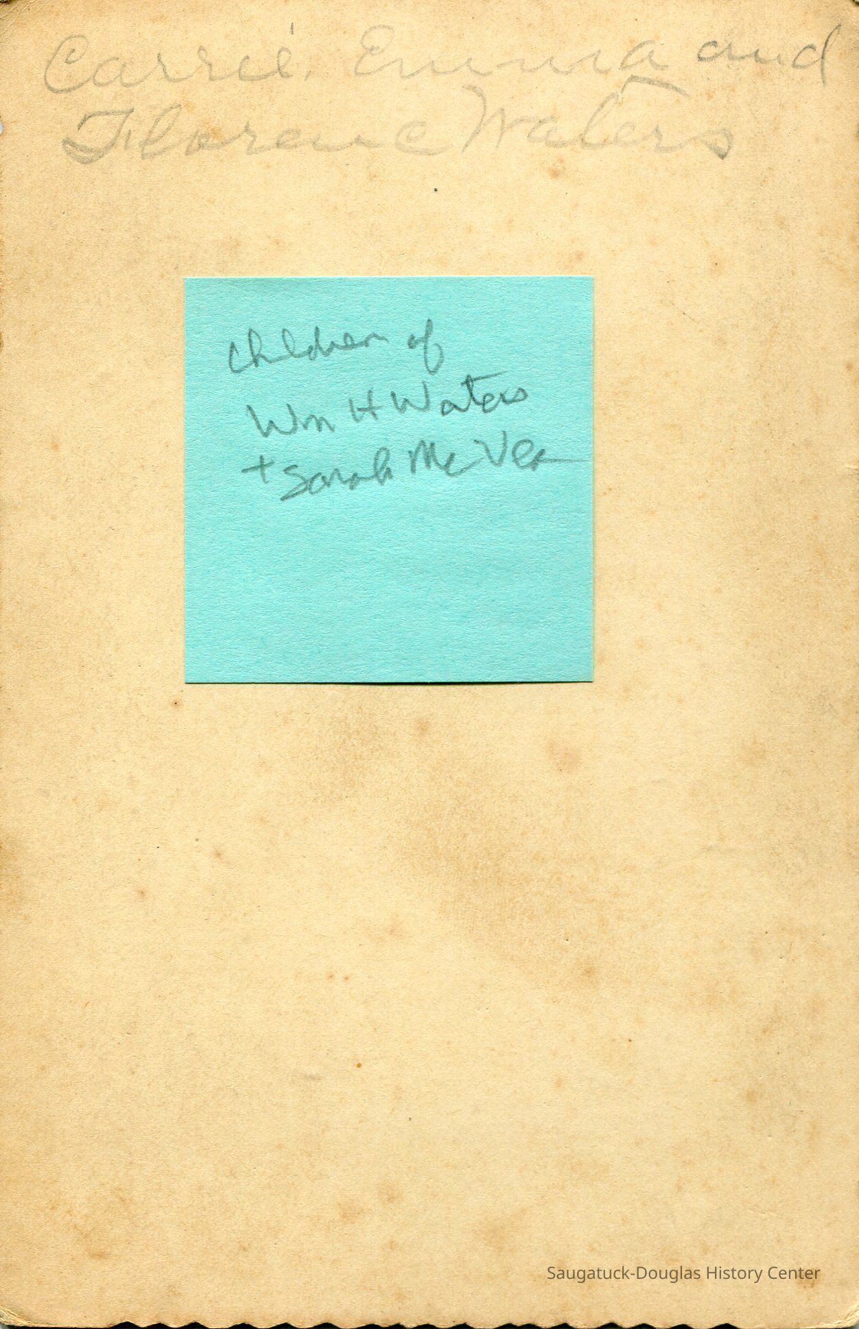 Carrie, Emma and Florence Waters is written in pencil on the back along with a green post-it noting the following in cursive: Children of Wm H Waters and Sarah McVea