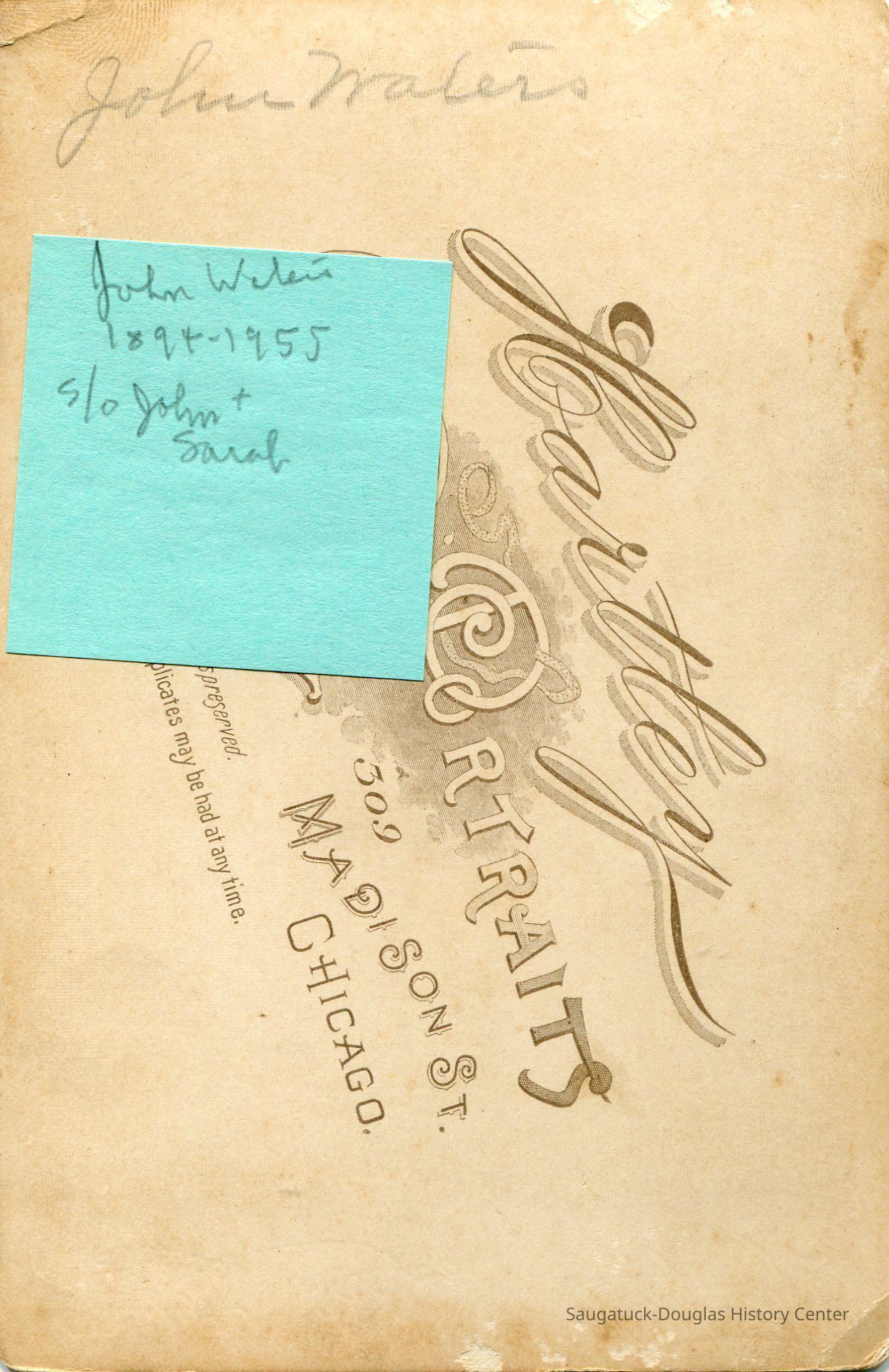 John Waters is written in pencil on the back along with a green post-it noting the following in cursive: John Waters, 1894-1955