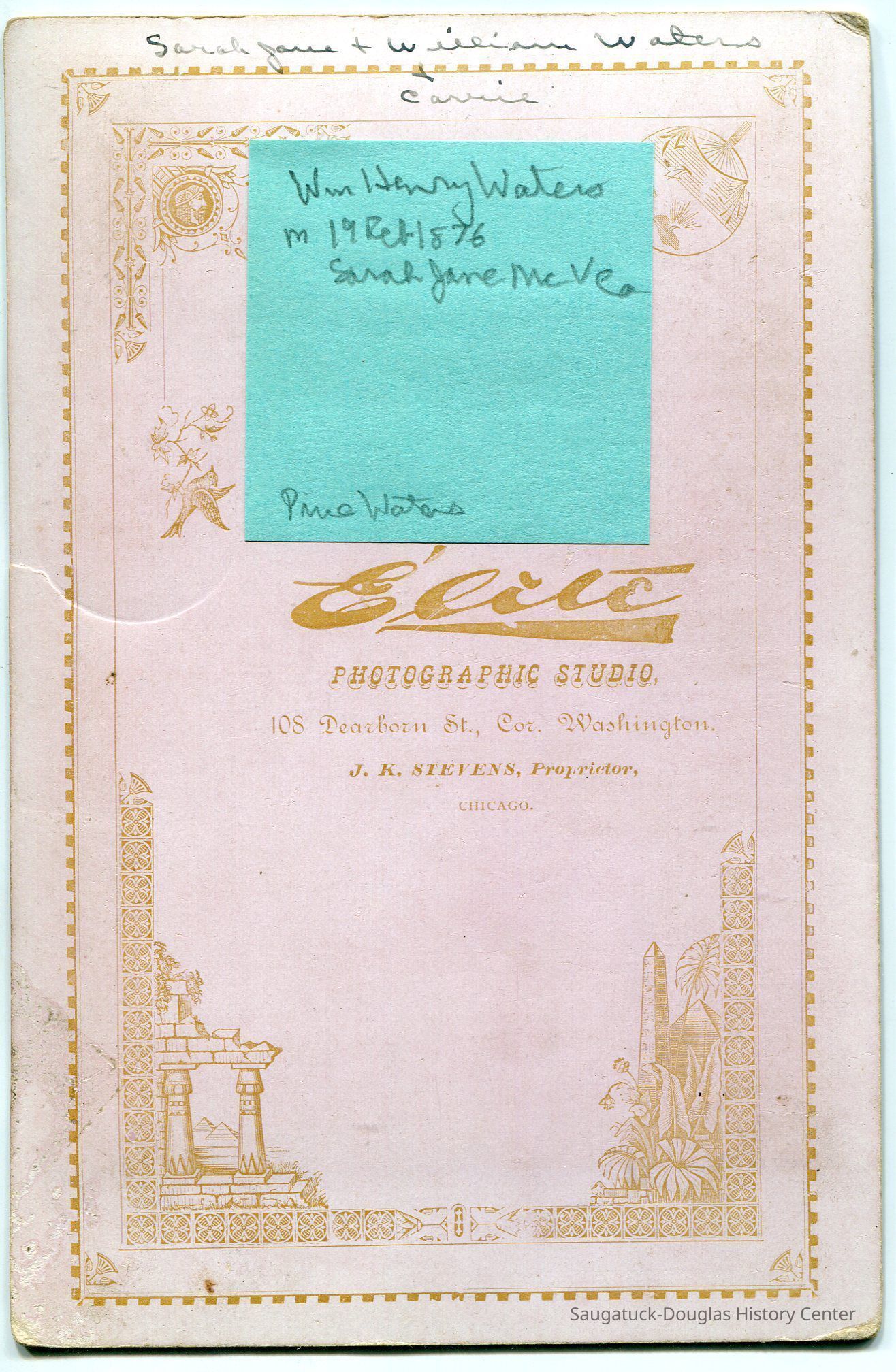 Sarah Jane + William Waters + Carrie is written in pencil on the back along with a green post-it noting the following in cursive: Wm Henry Waters