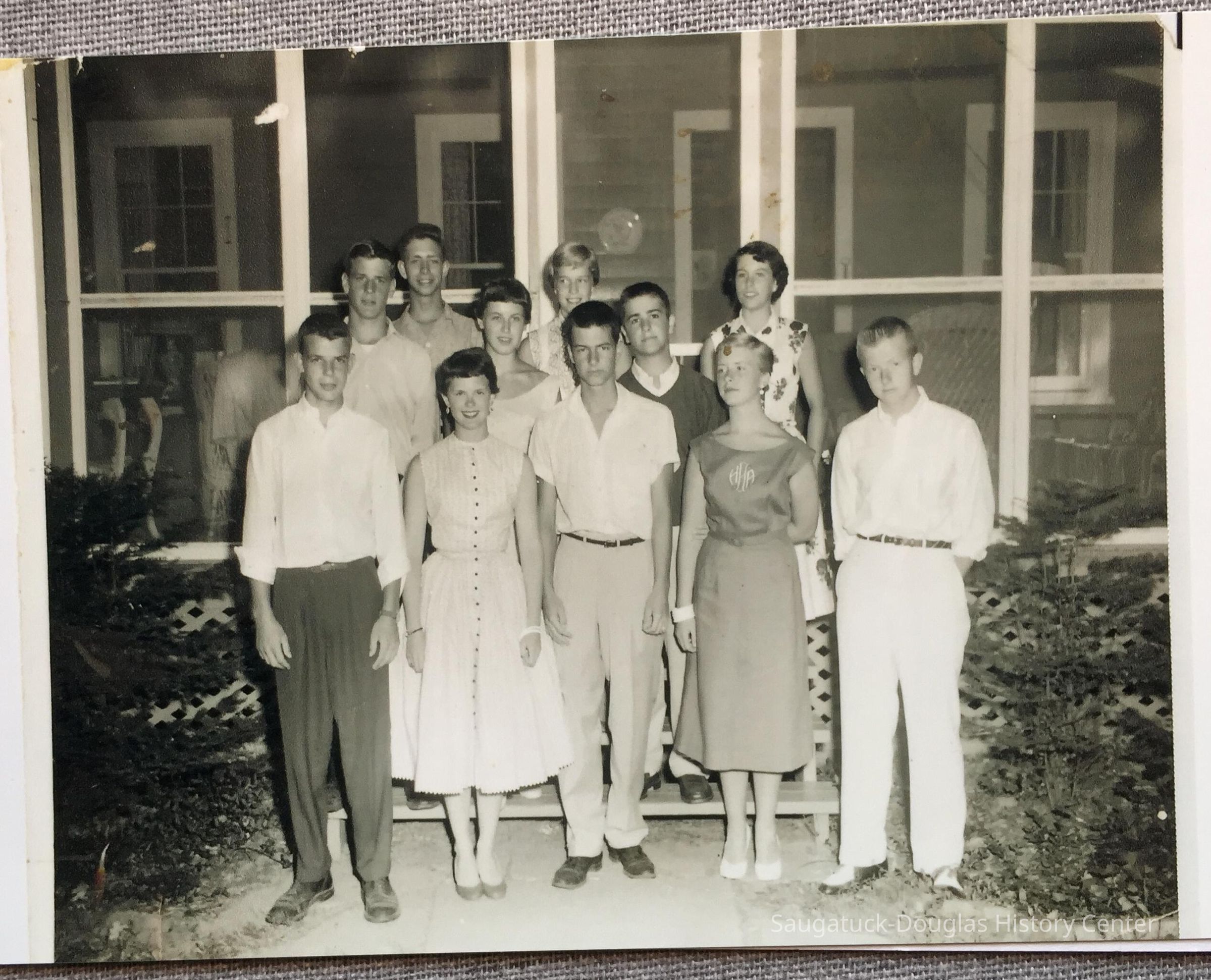 A group of young adults posing on the steps of a cottage, in front of a screen porch. Everyone is dressed up for Heather Foderingham's birthday dinner at Wavepoint. Dated 1954 or 1955.