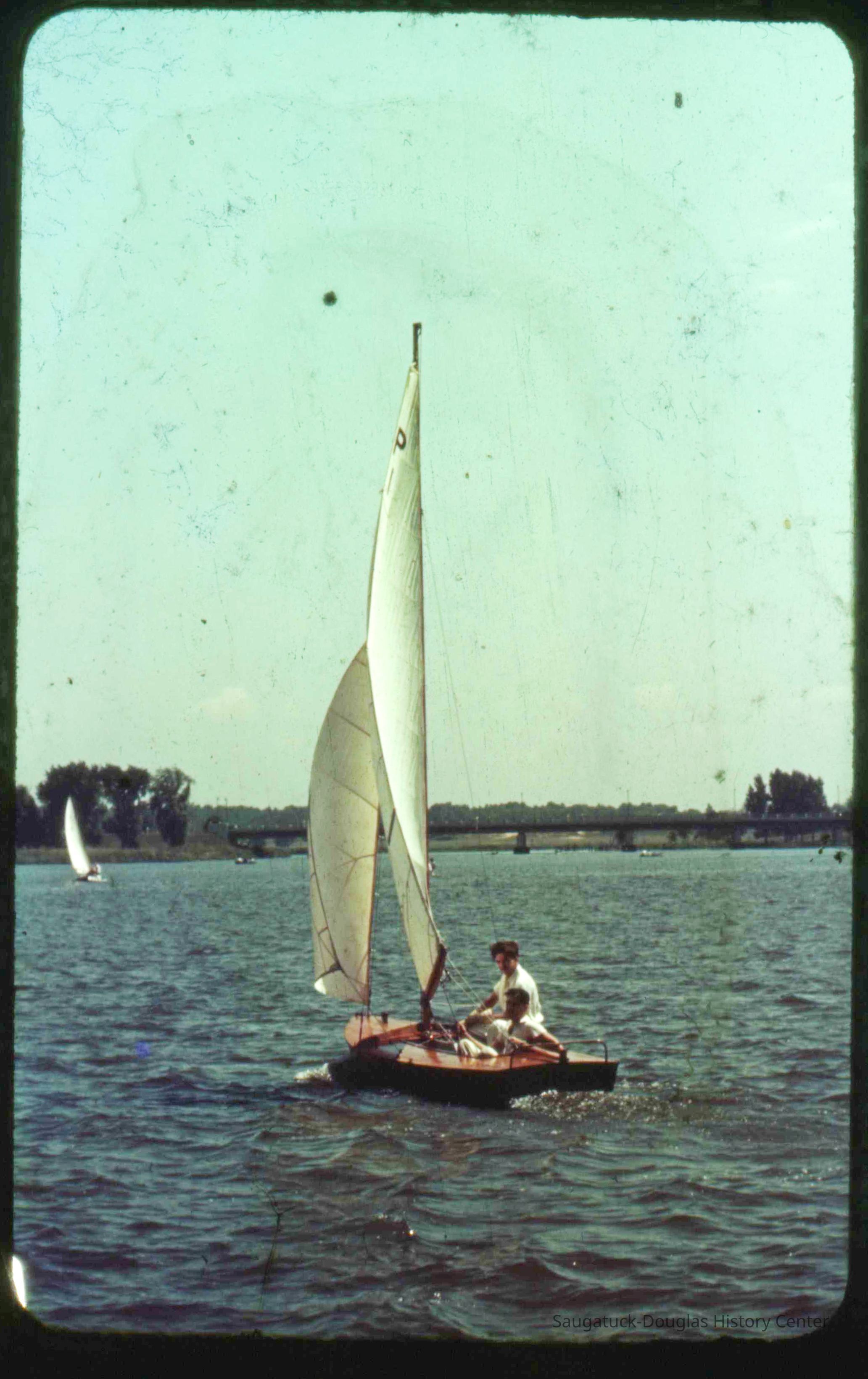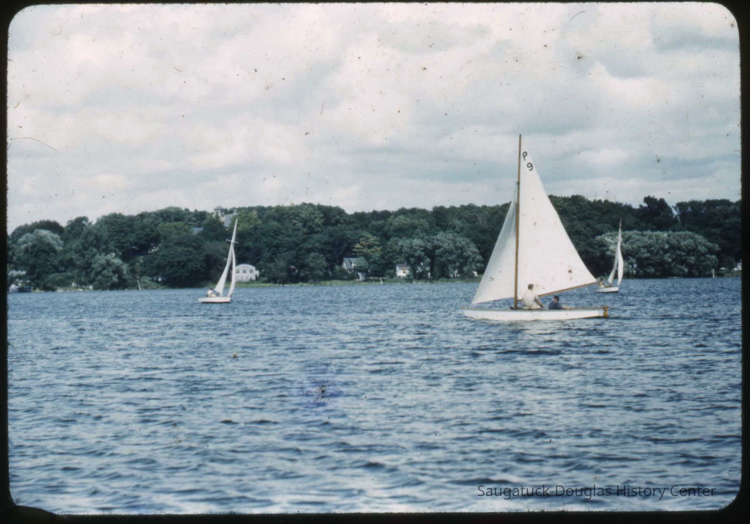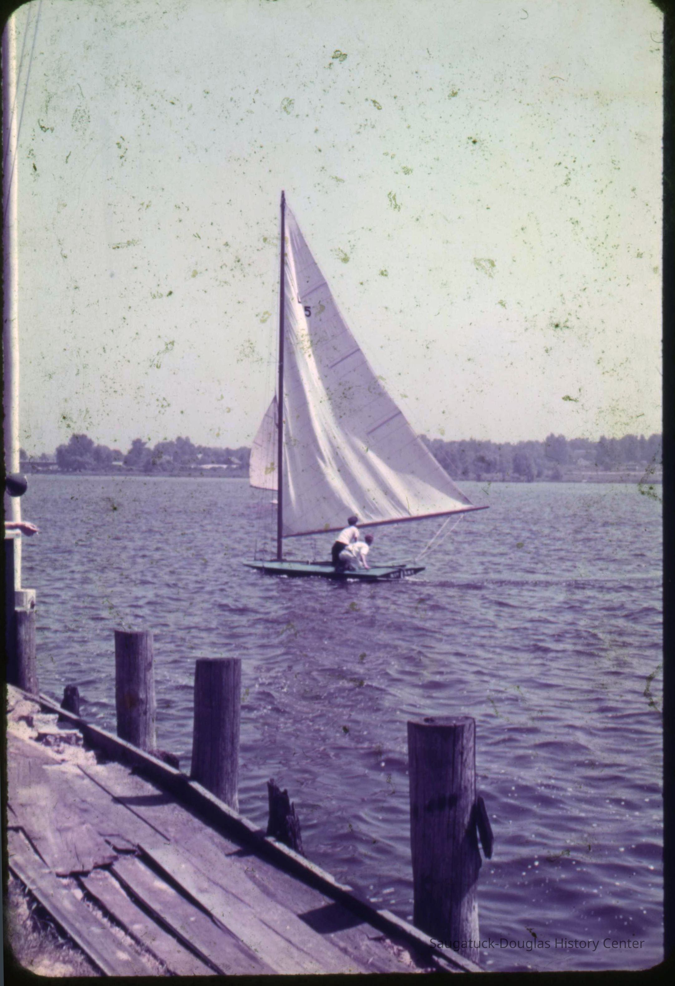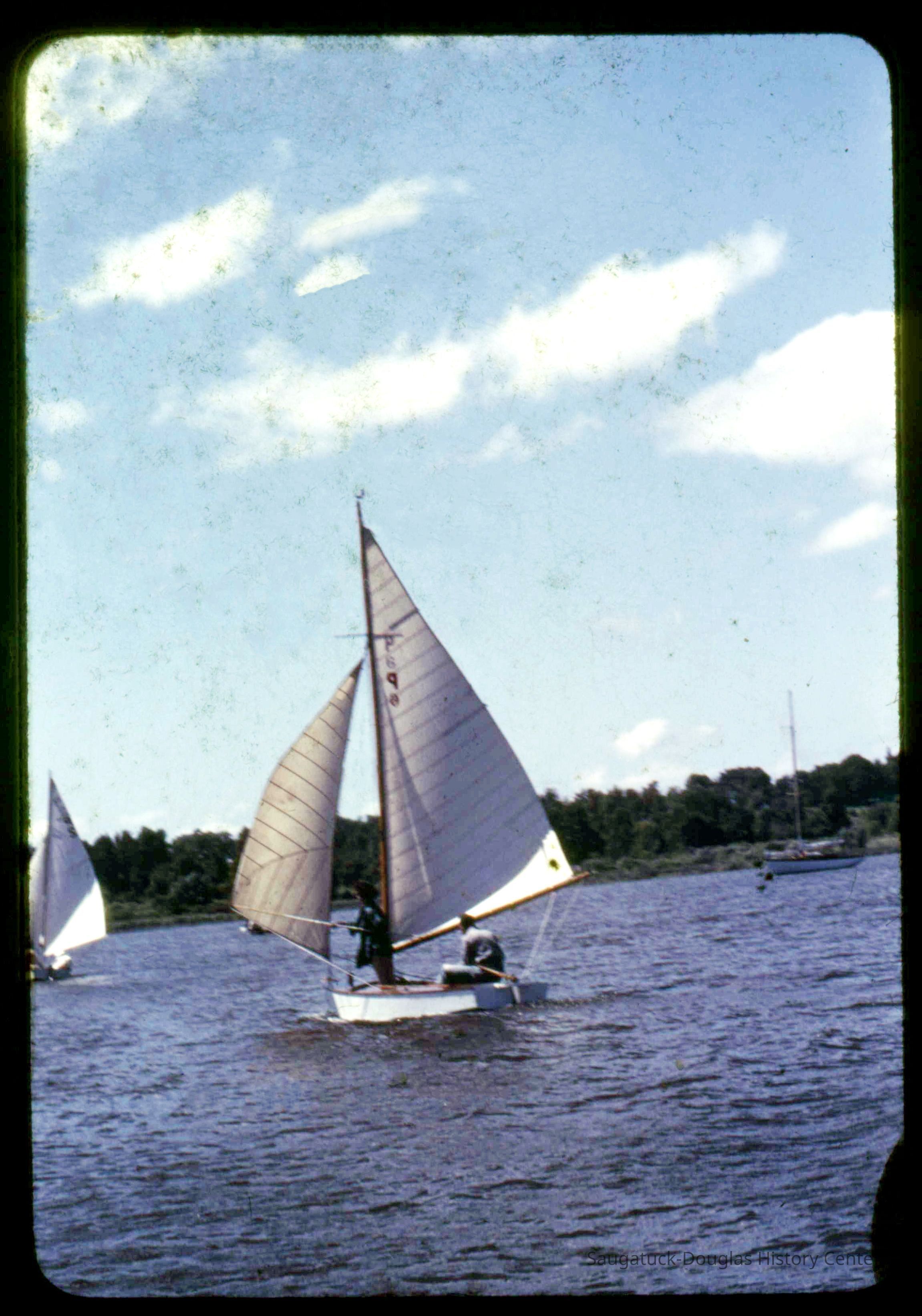 A collection of glass-faced slides of people sailing the Saugatuck Yacht Club fleet. A few of the slides have labels with dates that range from 1939 to 1945.
