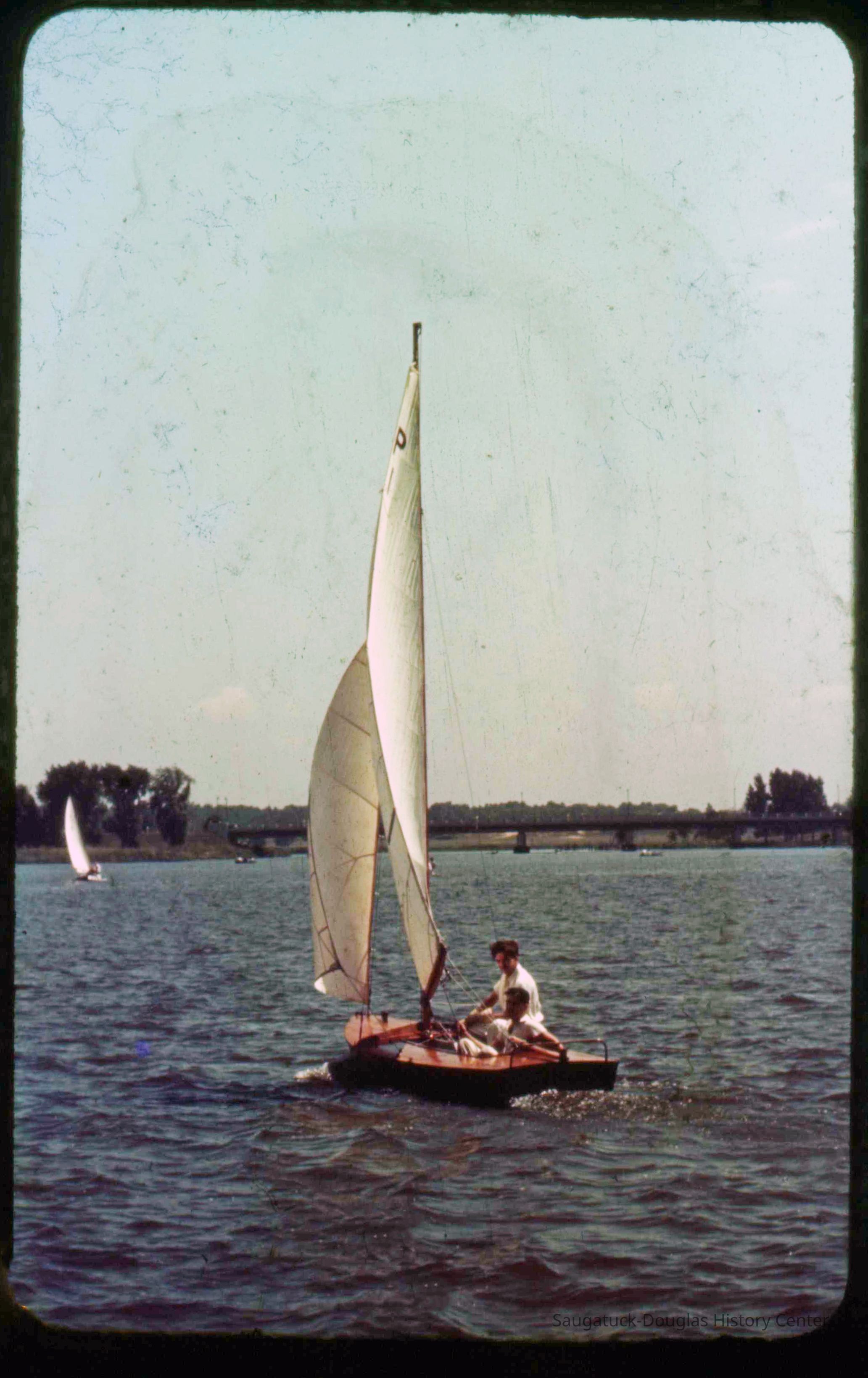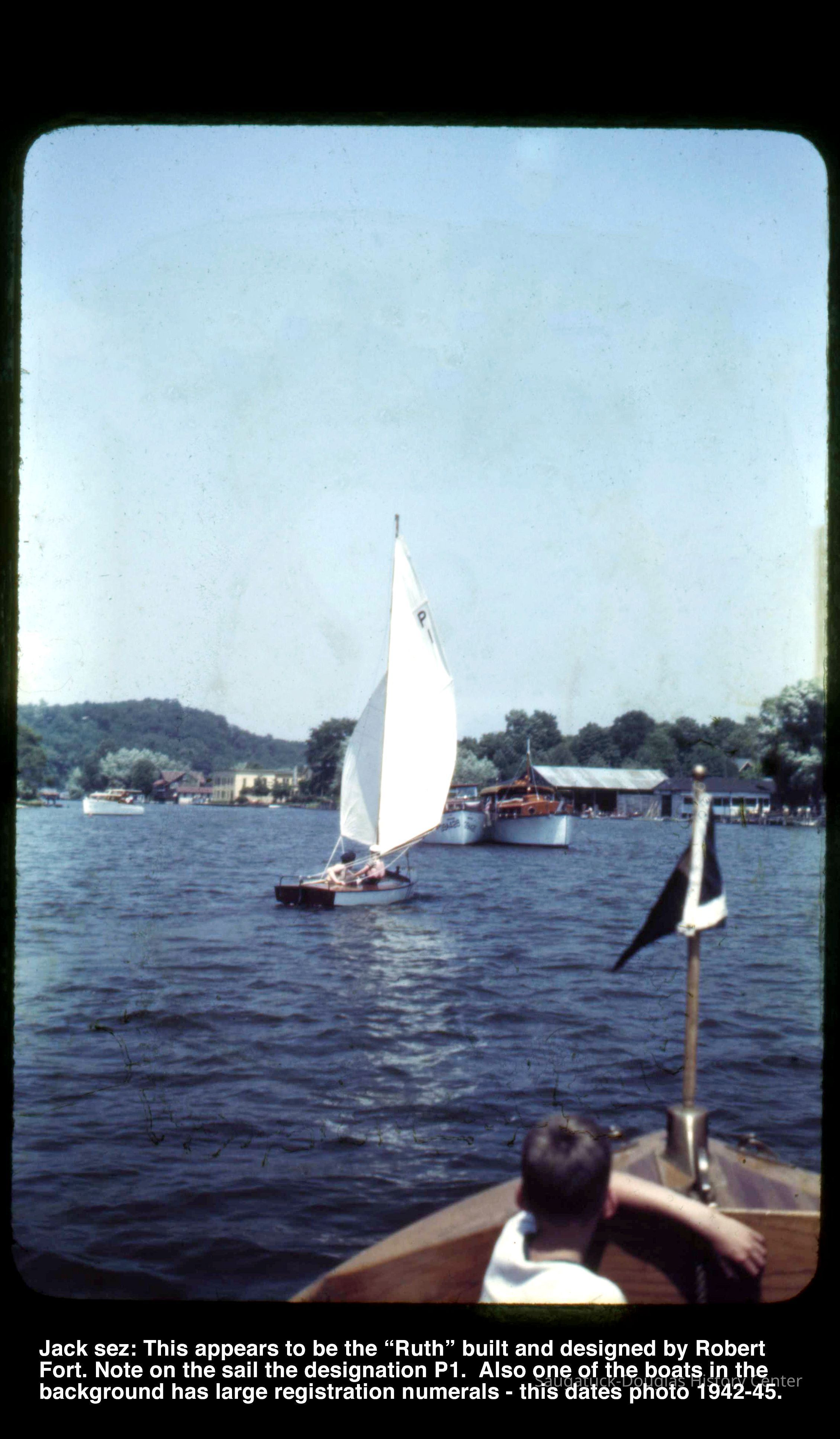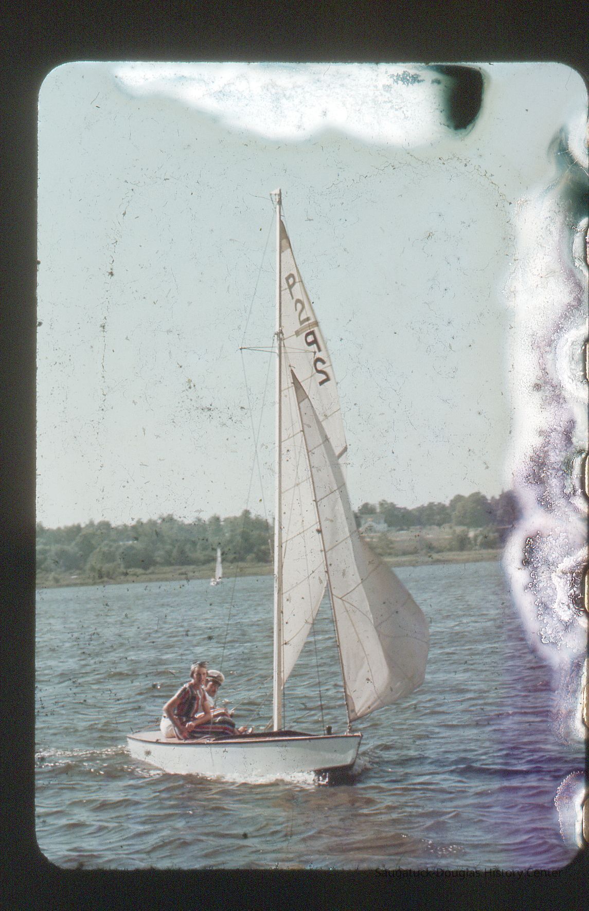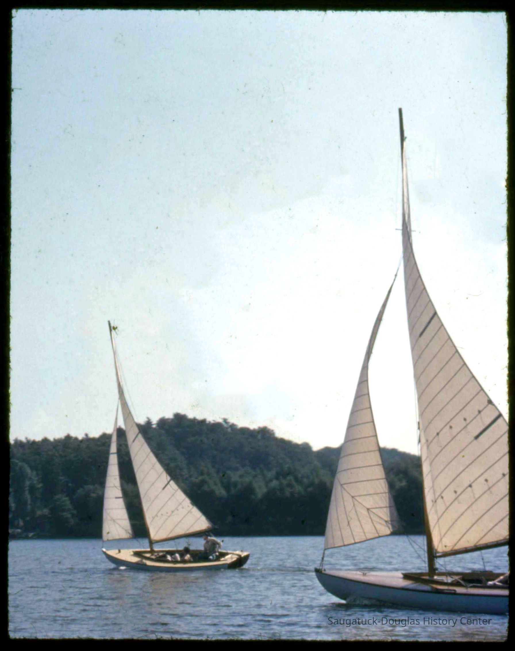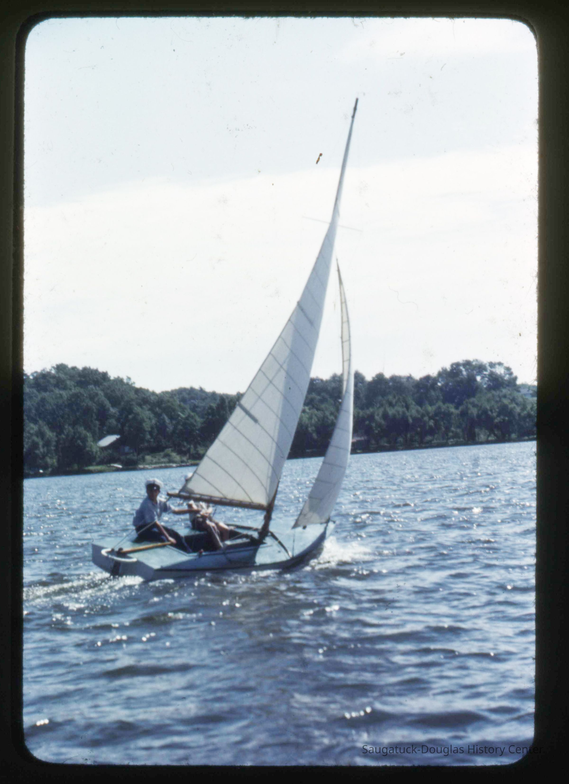 A collection of glass-faced slides of people sailing the Saugatuck Yacht Club fleet. A few of the slides have labels with dates that range from 1939 to 1945.