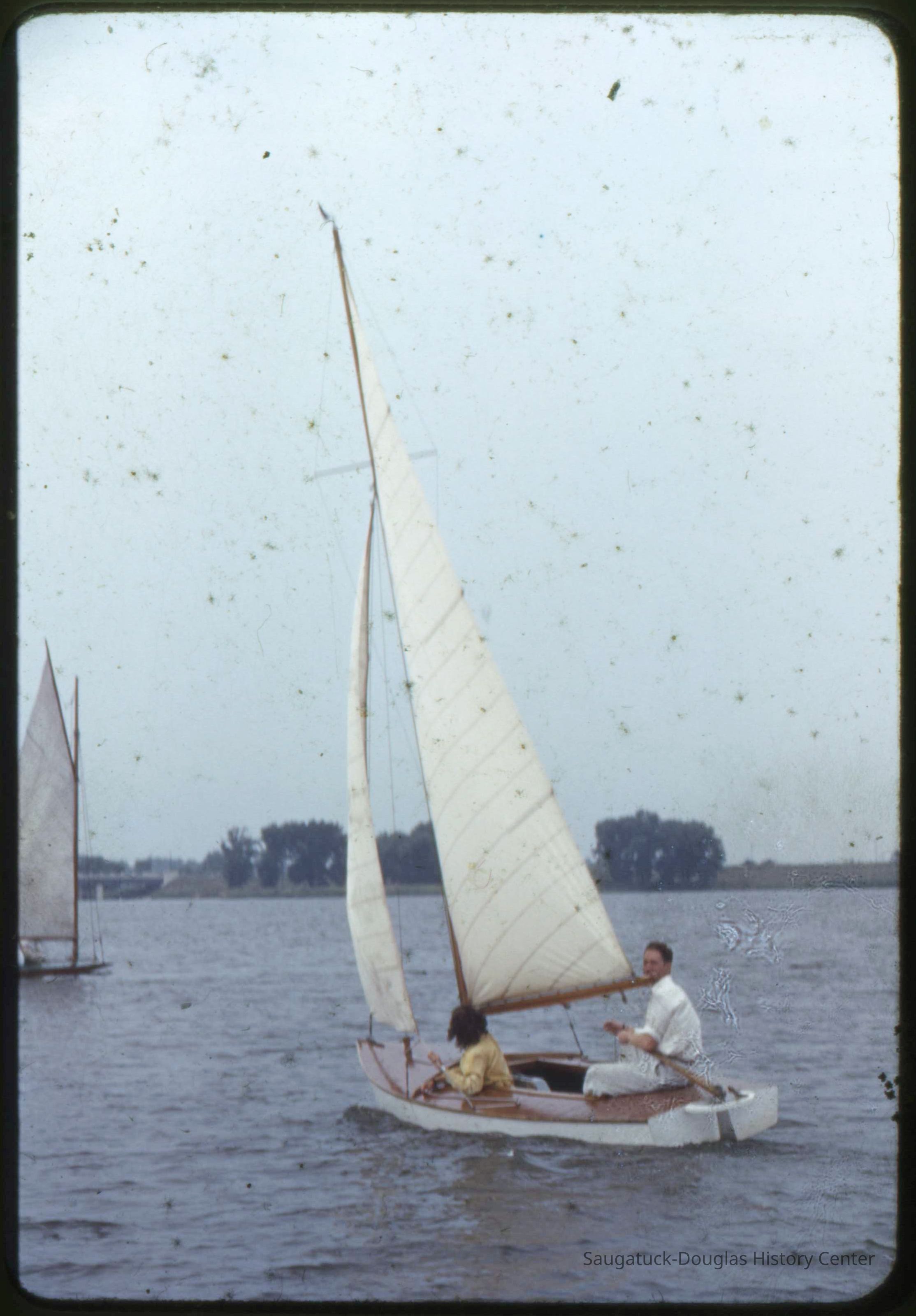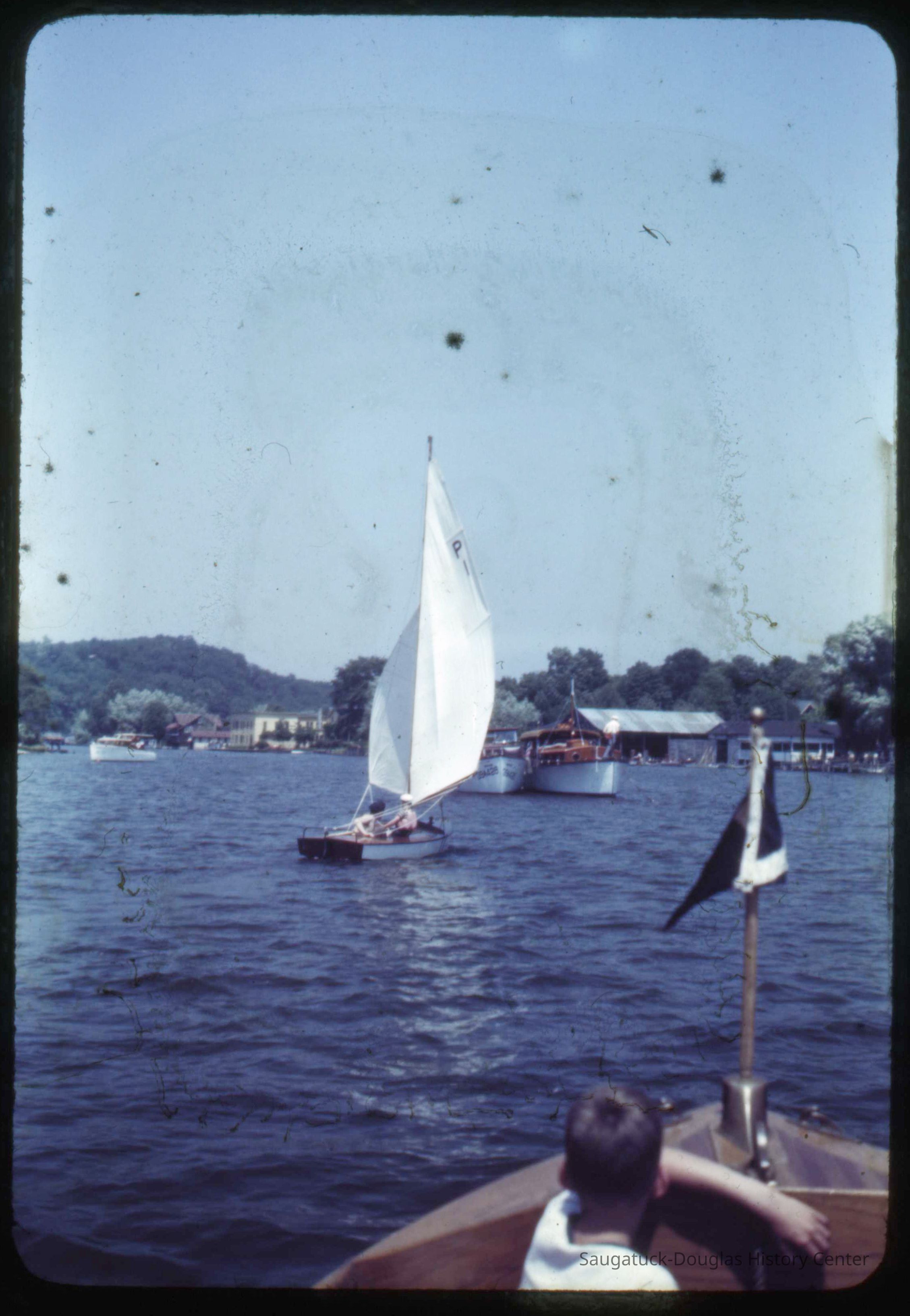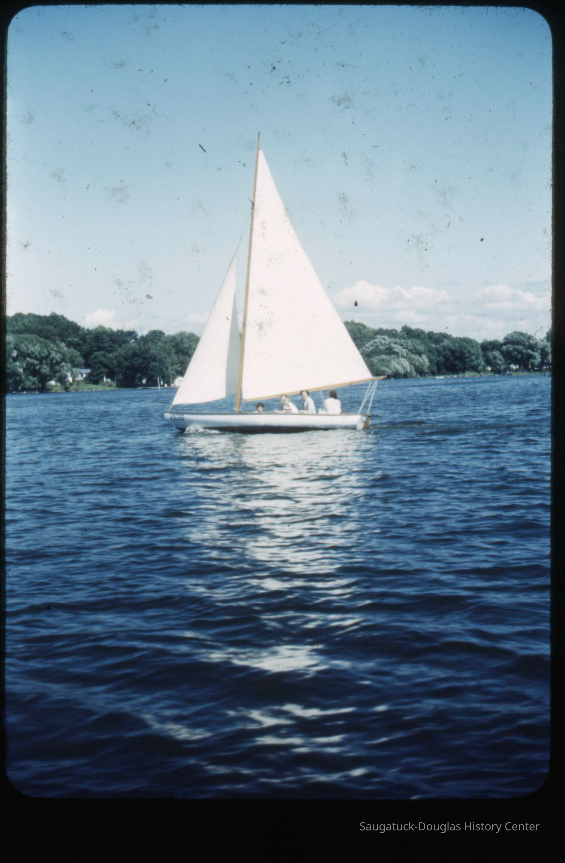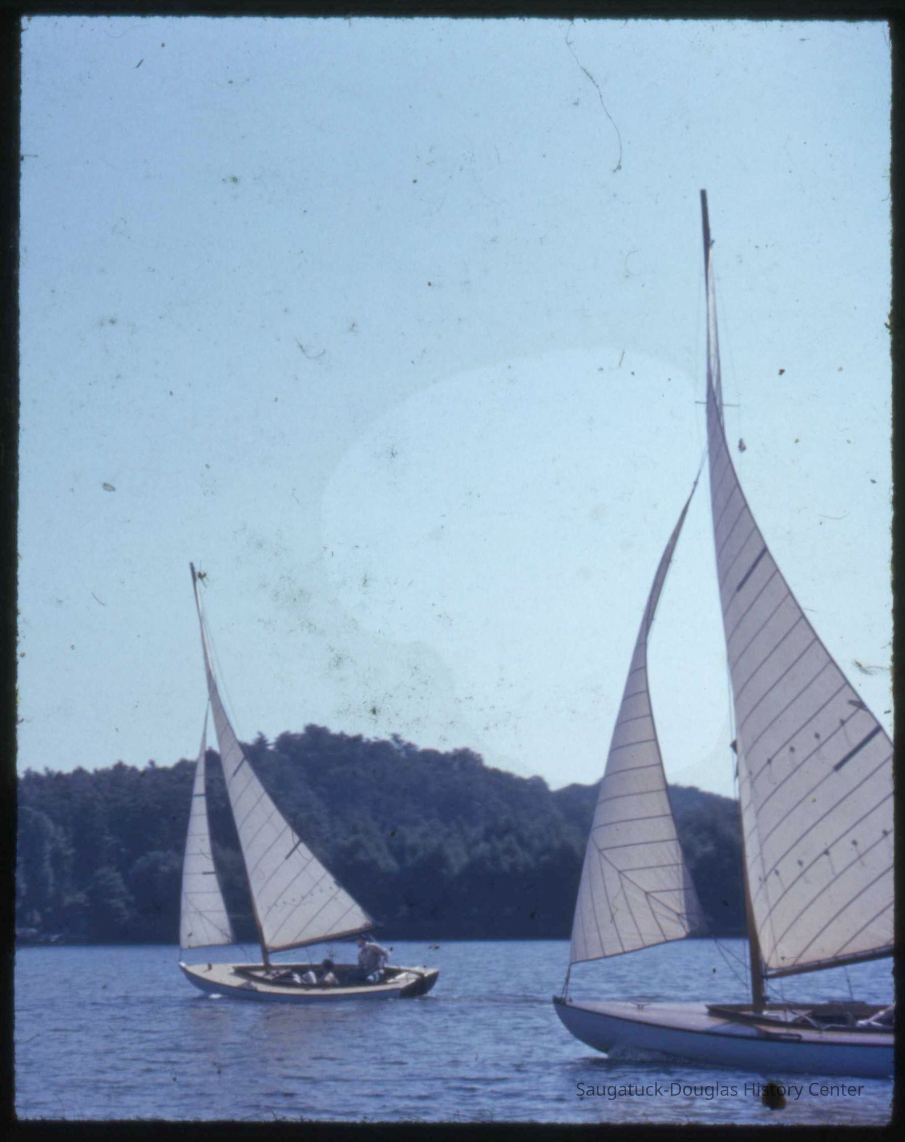A collection of glass-faced slides of people sailing the Saugatuck Yacht Club fleet. A few of the slides have labels with dates that range from 1939 to 1945.
