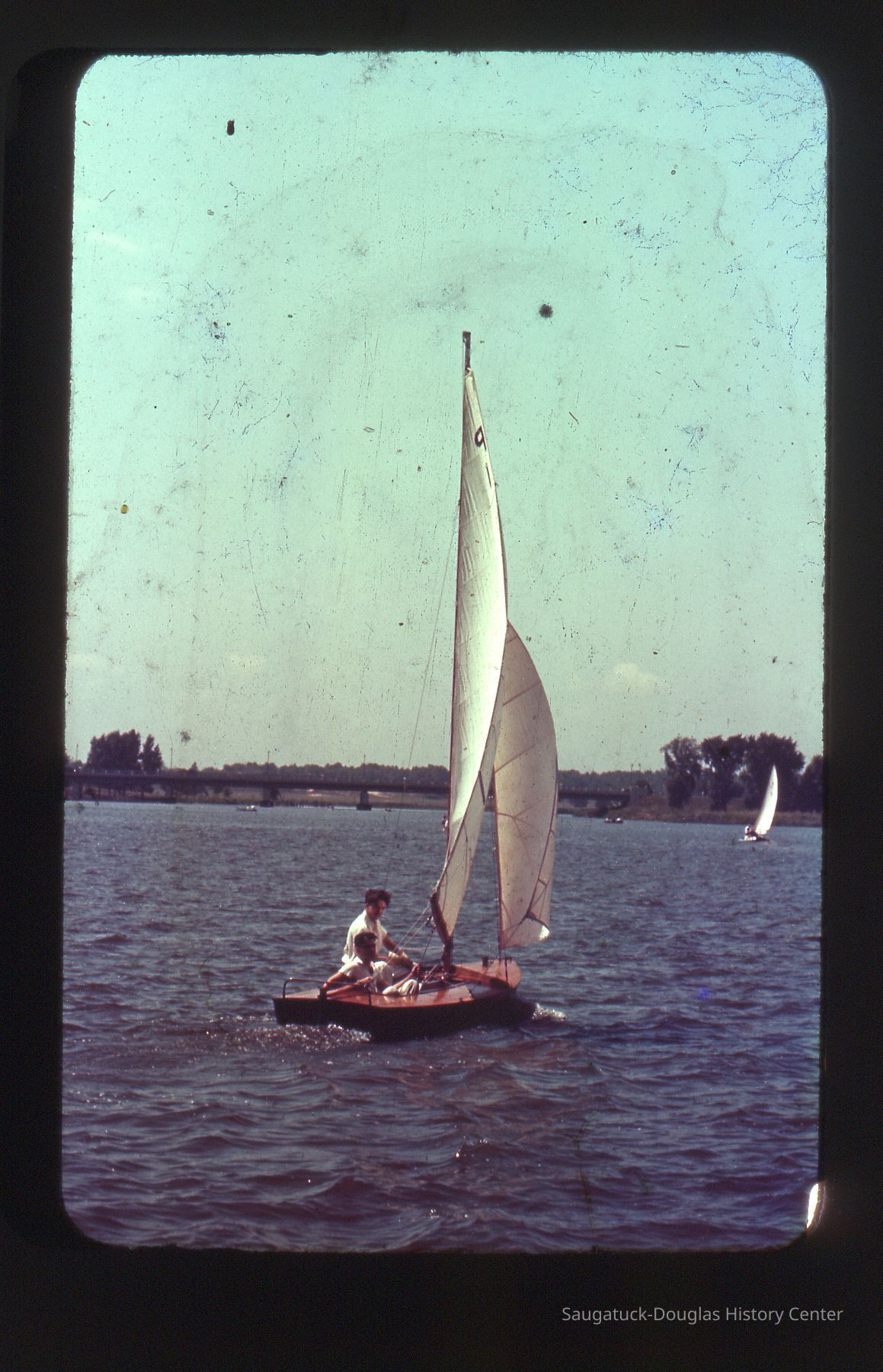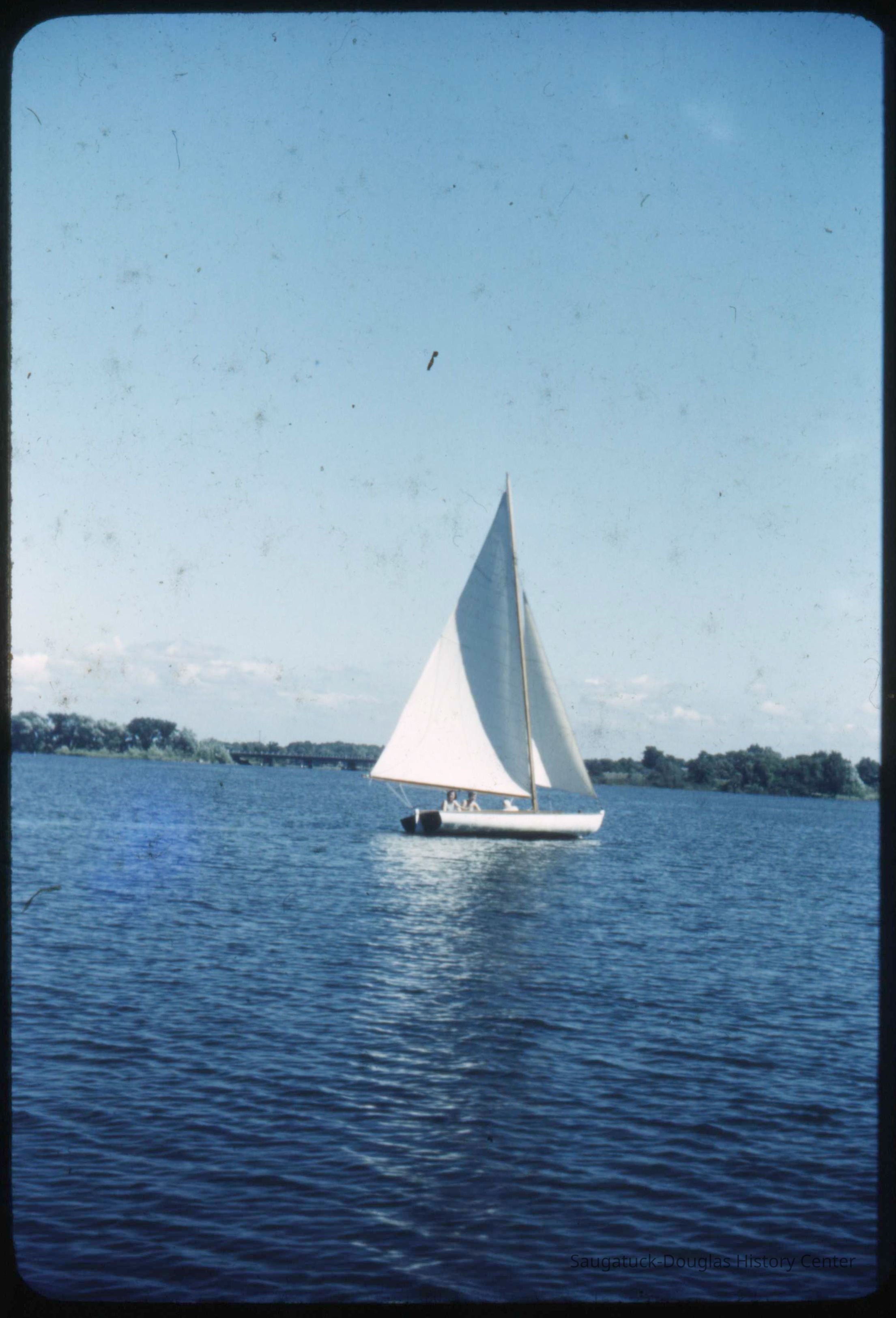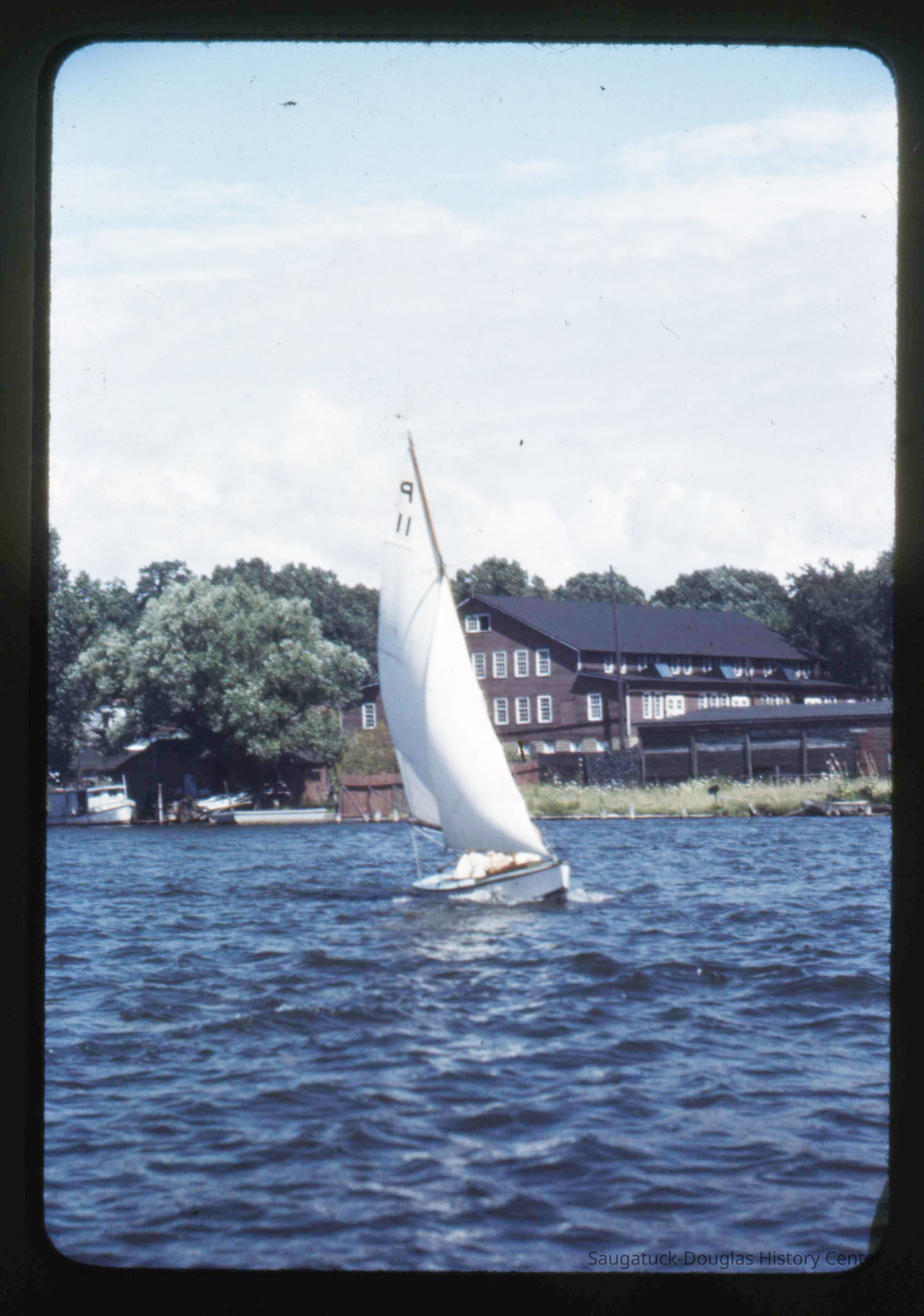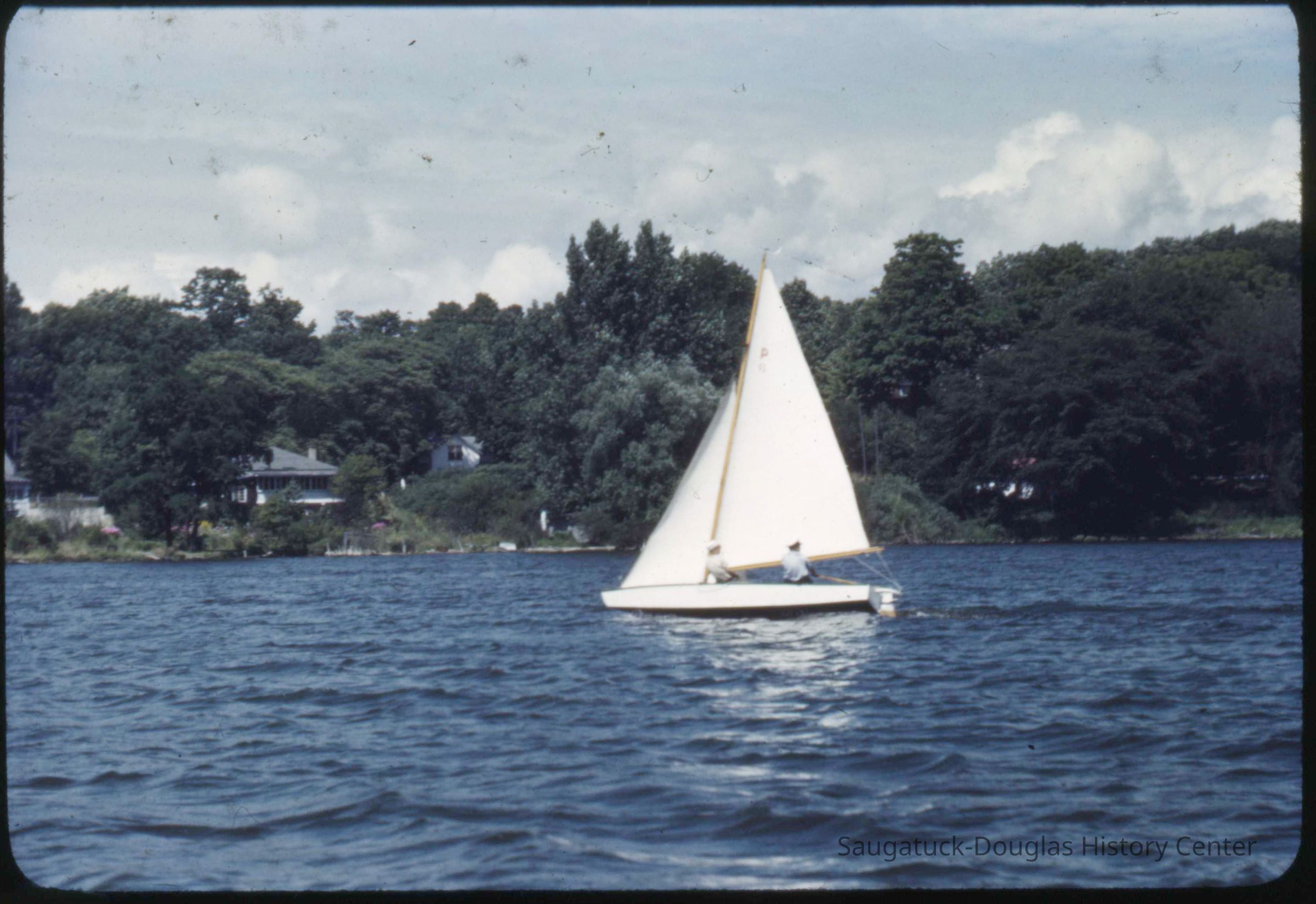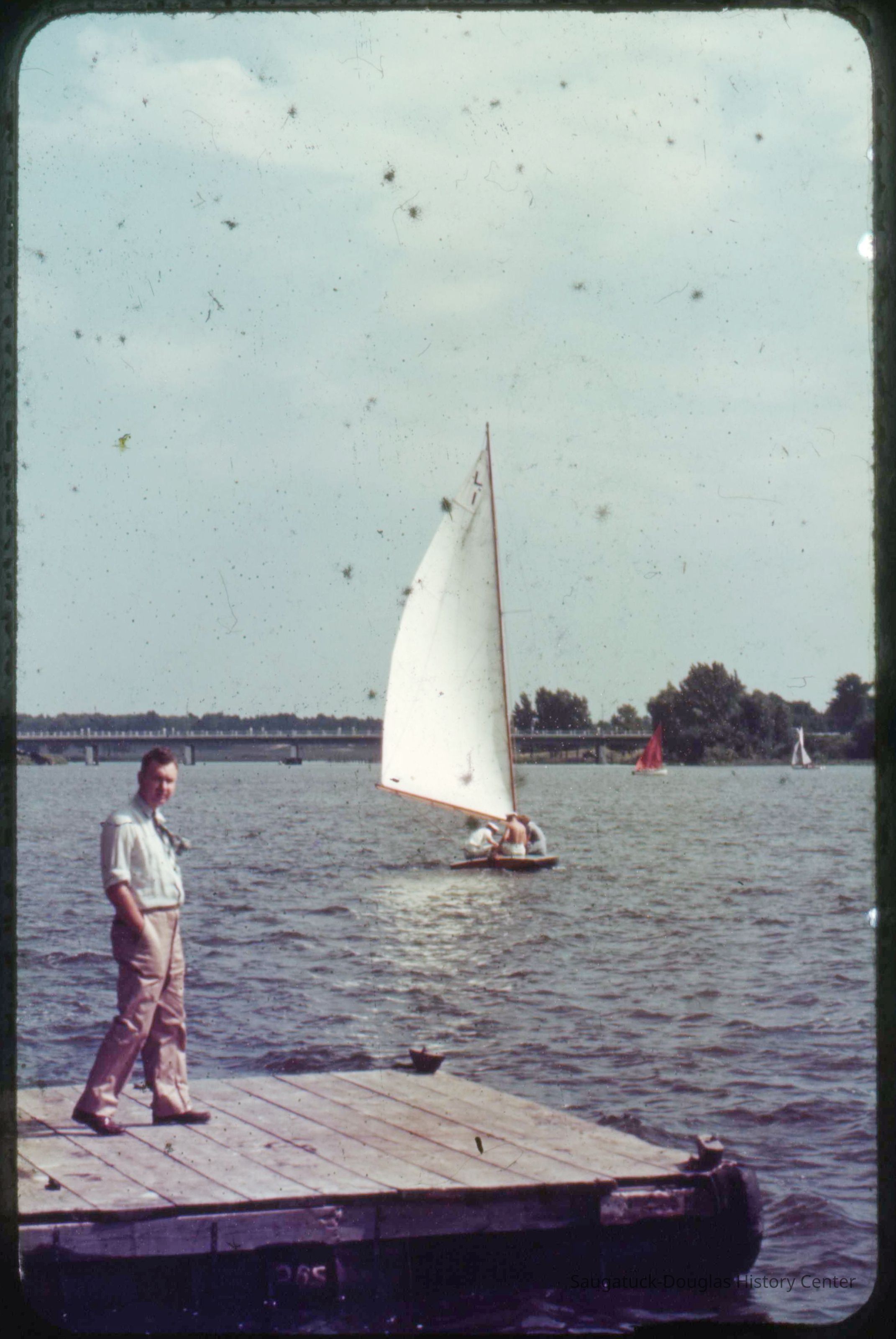 A collection of glass-faced slides of people sailing the Saugatuck Yacht Club fleet. A few of the slides have labels with dates that range from 1939 to 1945.