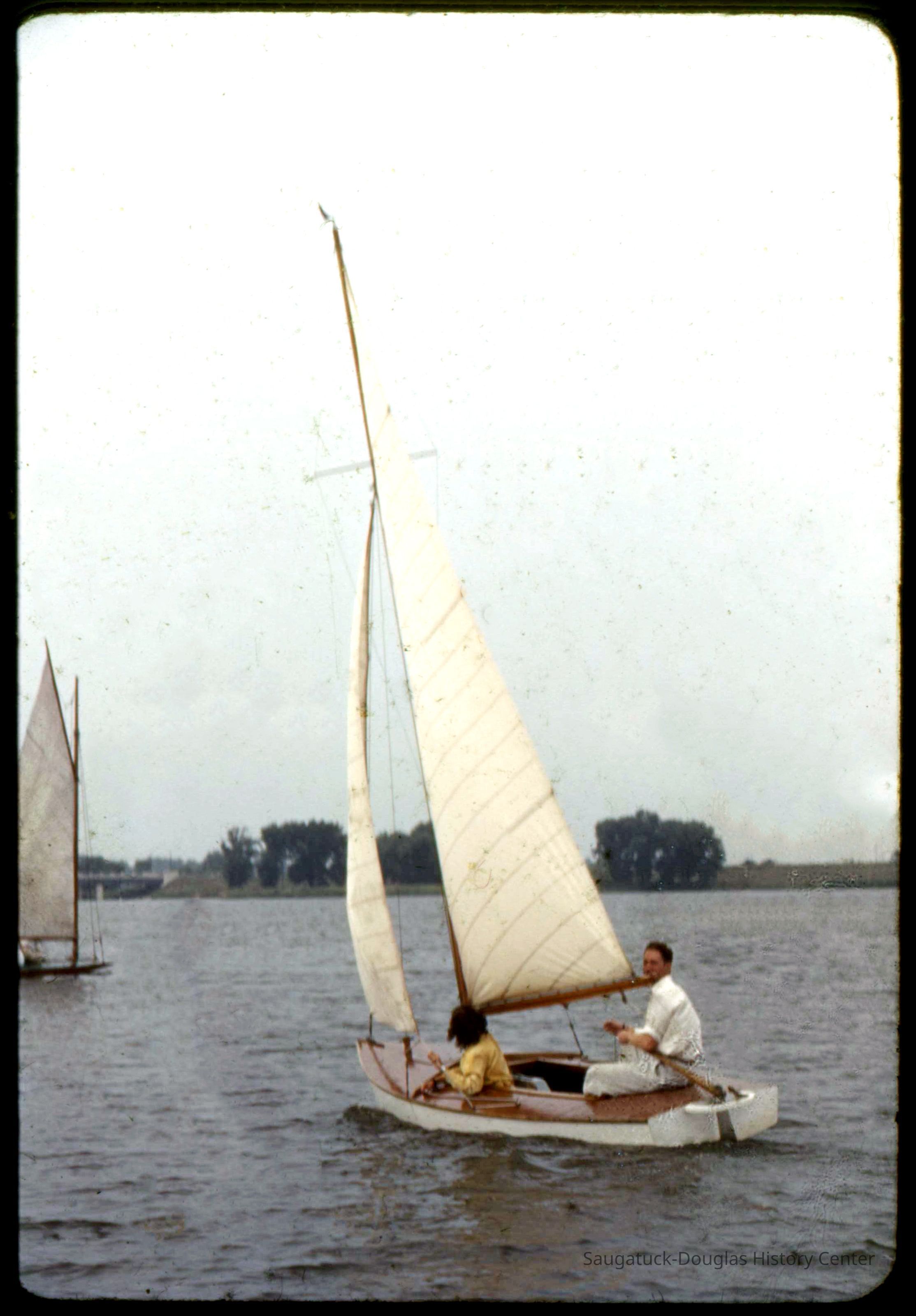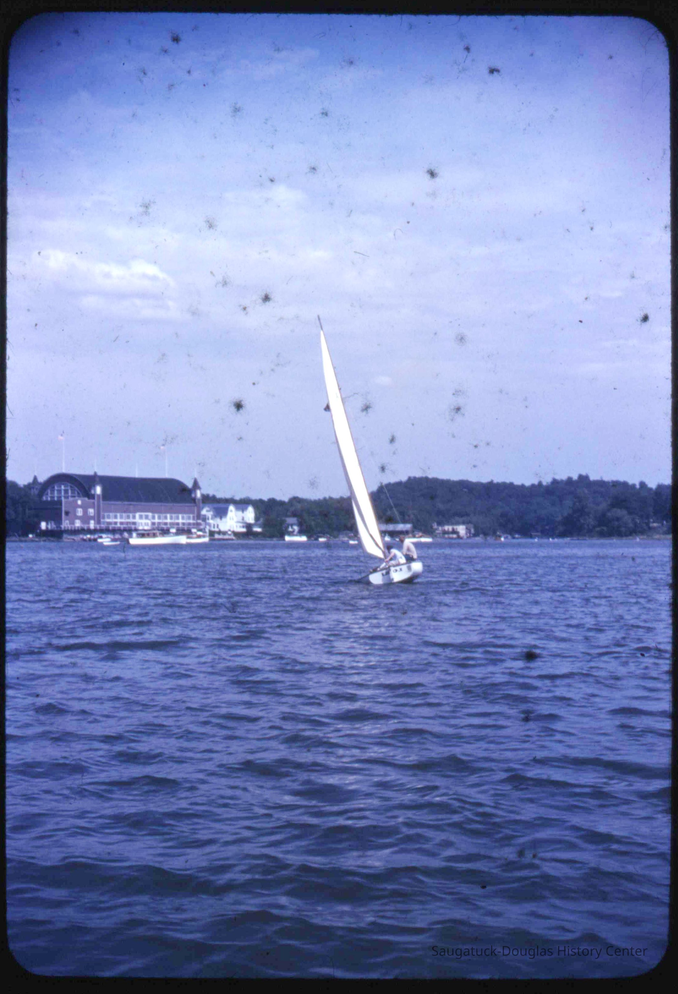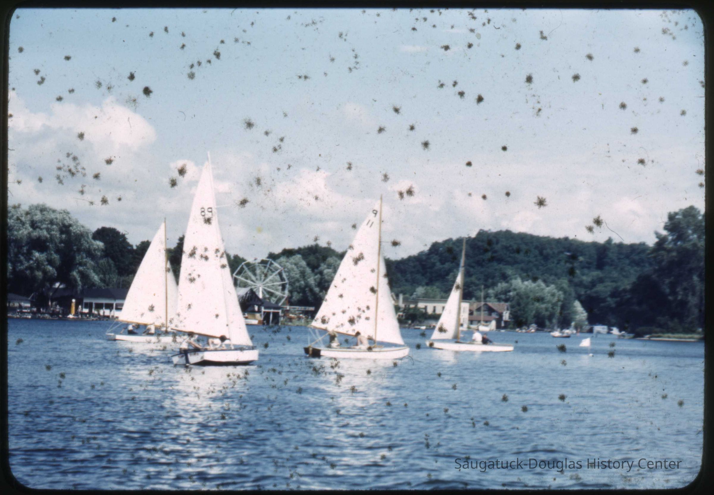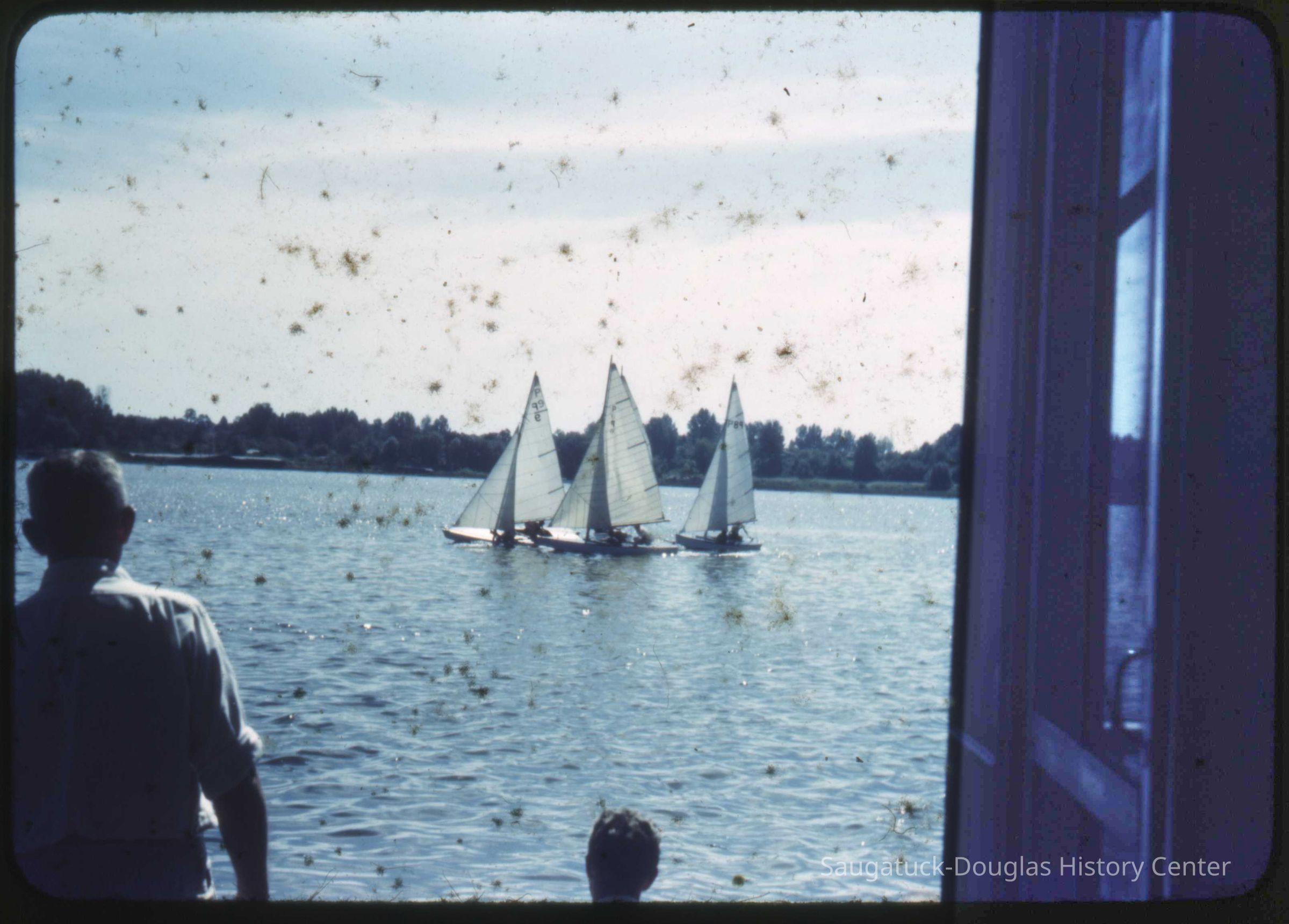 A collection of glass-faced slides of people sailing the Saugatuck Yacht Club fleet. A few of the slides have labels with dates that range from 1939 to 1945.