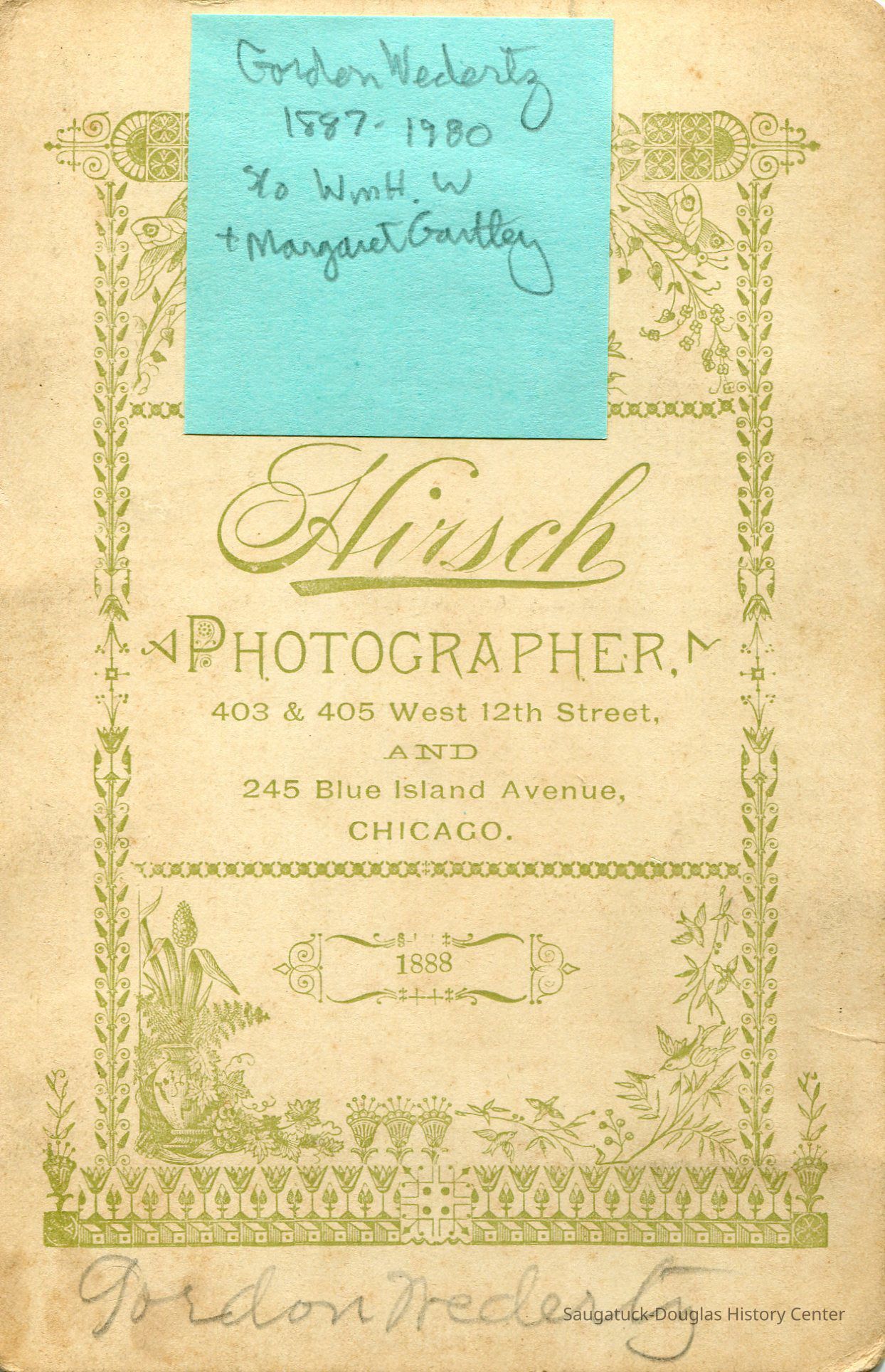 Gordon Wedertz is written in pencil on the back along with a green post-it noting the following in cursive: 1887-1980 s/o [son of] Wm. H. W. + Margaret GartleyPhotograph Details
