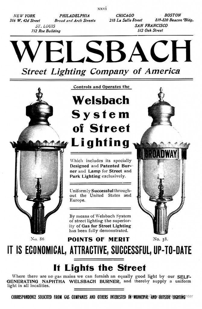 In the United States, the Welsbach Incandescent Gas Lighting Company had offices on Walnut Street in Philadelphia, and a factory on the Delaware River at Gloucester, New Jersey. Many of the factory workers were women, who sewed the fabric mantels and packed the mantels into packages for sale across the country.