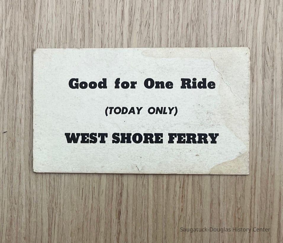 The West Side Ferry was a canopied motor boat that ran between downtown Saugatuck (at the foot to Butler St), Douglas (Point Pleasant) and the west side of Kalamazoo Lake (at the foot of Campbell Road and Ferry St., where Saugatuck Yacht club is in 2022). They ferry was often used by Lakeshore people to get downtown. A large sign-like board was used to hail the ferry.Collection